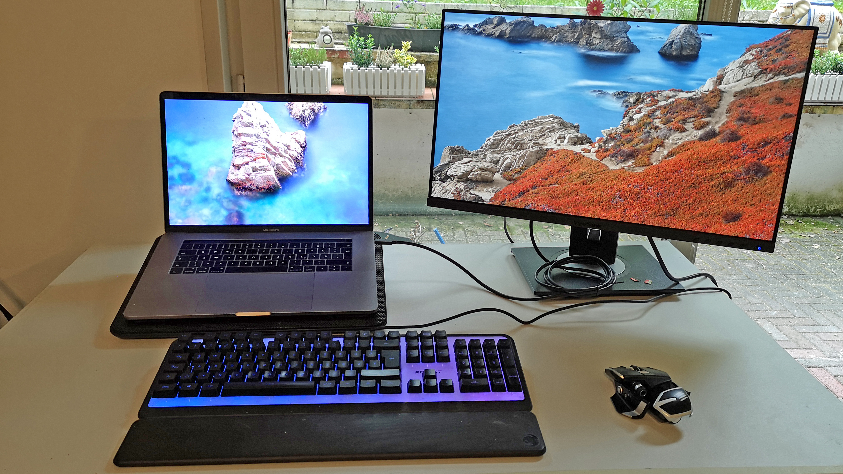 Wir haben an unserem Monitor etwa Maus, Tastatur und externe Festplatte angesteckt und können diese ohne zusätzlichen Hub einsetzen. USB-C-Kabel einstecken, schon gibt es Bild, mehr Speicher, Eingabegeräte – und Energie. Neben dem deutlich erweiterten Anzeigebereich liefert der ViewSonic VG2455 zusätzlich den Strom (90 W) für das Macbook Pro. Das sieht nicht nur ordentlich aus und erspart unnötiges Ein- und Ausstecken, mittelfristig entlasten wir damit auch die nicht ganz unempfindlichen USB-Ports des Macbooks.