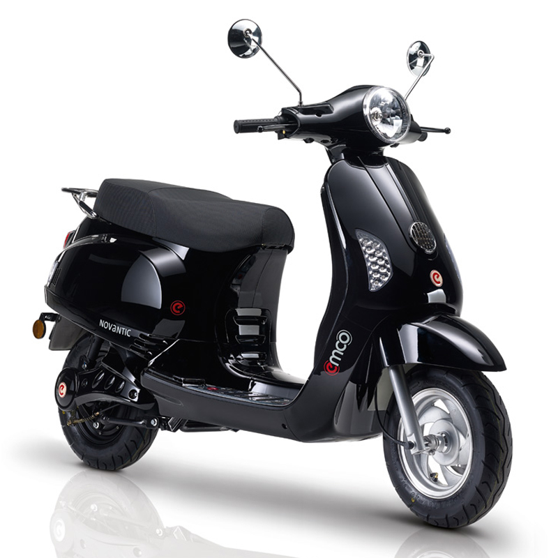 Der Emco ist made in Germany, Muttergesellschaft ist die Emco Group aus Lingen. Sie bezeichnet sich selbst als Deutschlands größter E-Roller-Hersteller. Der hier vorgestellte Novantic C 200 ist im Retro-Stil gehalten und erinnert stark an die Kultroller von Vespa. Die Lithium-Ionen-Doppel-Akkus von Weipu gibt es in zwei Varianten und ermöglichen Reichweiten zwischen 50 und 130 Kilometer (1x oder 2x 28 Ah 1x oder 2x 37 Ah).