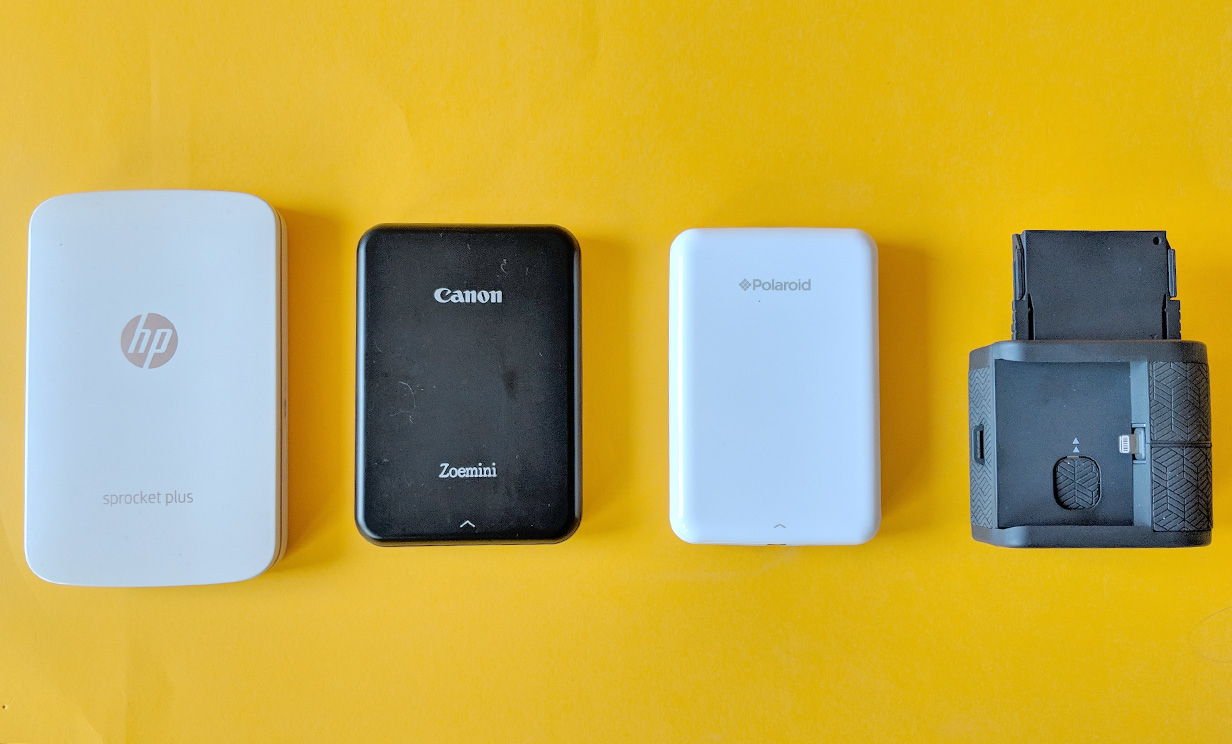 Die vier Zink-Drucker Huawei CV80 (Testbericht) , HP Sprocket Plus (Testbericht) , Canon Zoemini (Testbericht) und Polaroid Zip (Testbericht) ähneln sich sowohl optisch als auch bezüglich ihrer Verarbeitungsqualität. Alle vier sind hosentaschengeeignet, sehr gut verarbeitet und kommen mit einem einzigen physischen Knopf zum Ein- und Ausschalten aus. Unter der abnehmbaren Oberschale haben jeweils bis zu zehn lose Fotopapiere Platz.