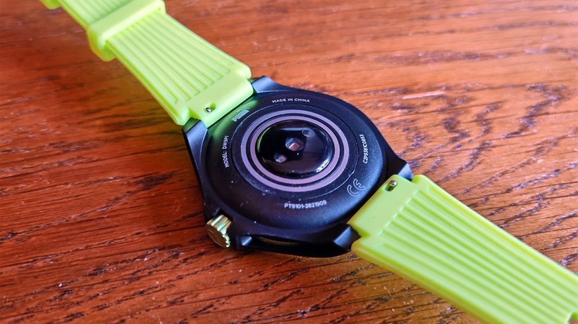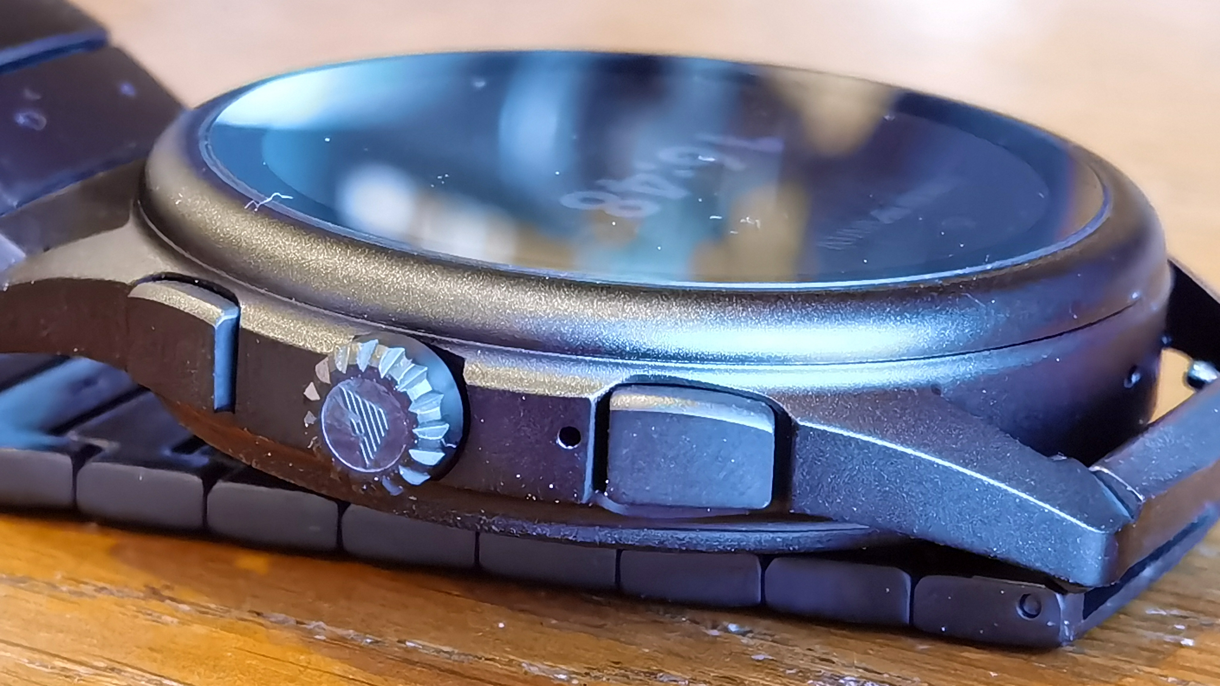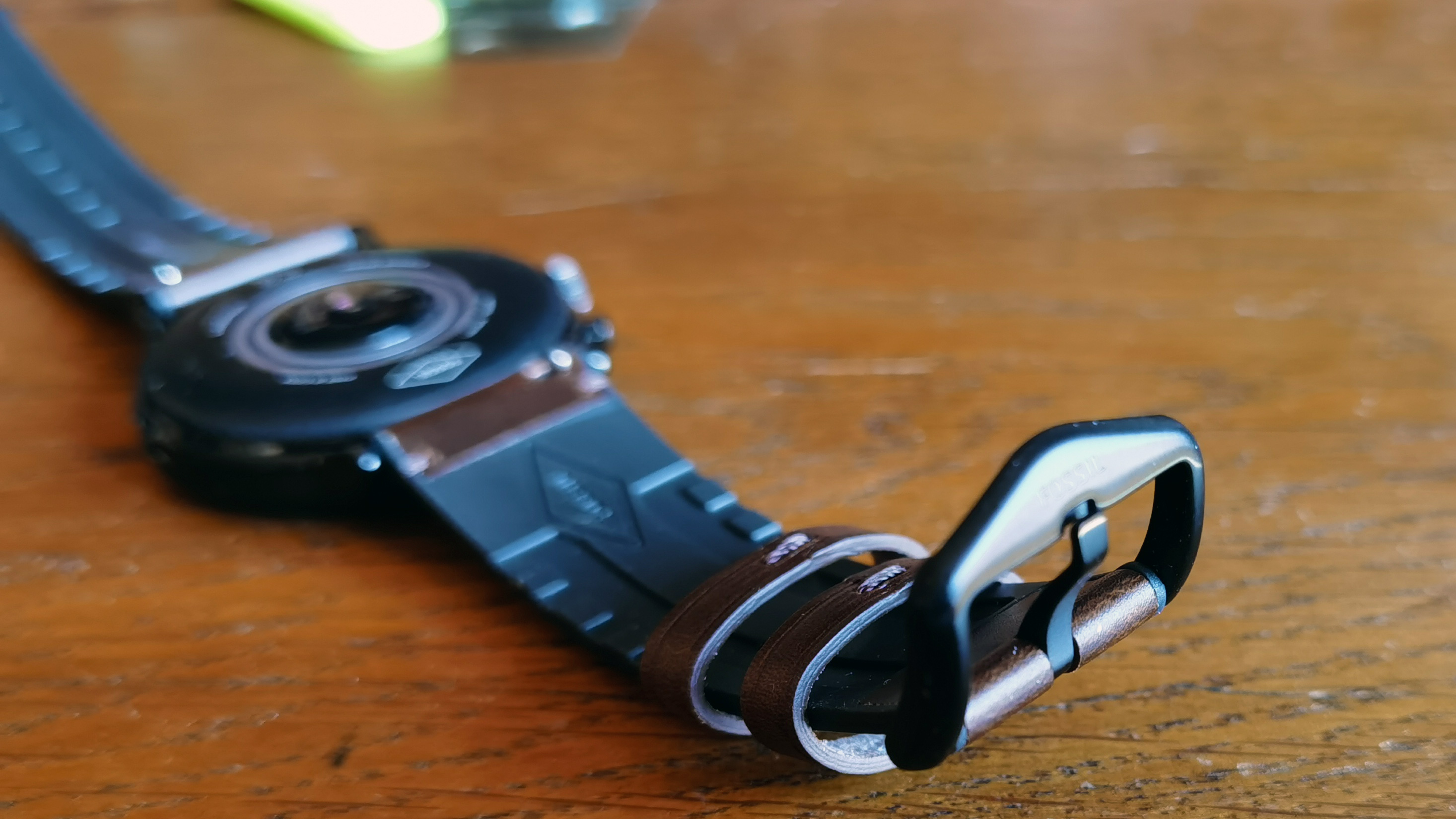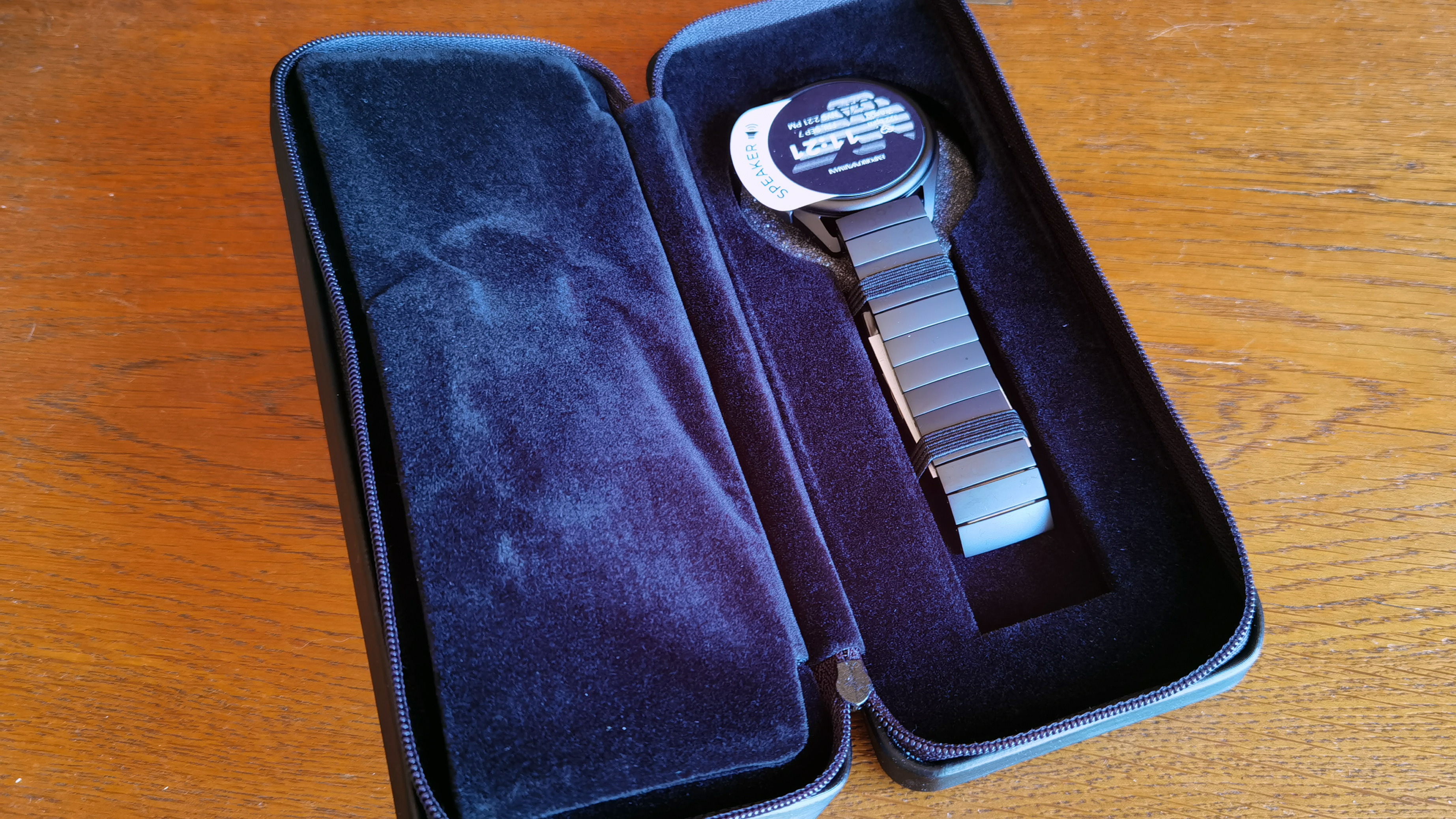 Die Carlyle sieht ziemlich schick aus. Das schwarze Gehäuse mit zwei Knöpfen und einer drehbaren Krone auf der rechten Seite ist mit seinen 44 Millimetern etwas kleiner als manches Konkurrenzprodukt, wirkt nicht übermäßig dick und fällt mit knapp 100 Gramm Gewicht am Handgelenk kaum auf. Das beiliegende 22-Millimeter-Armband besteht innen aus Silikon und verfügt außen über einen dunkelbraunen Kunstleder-Besatz. Damit hat man beim Sport einen bequemen Sitz, es sieht aber deutlich schicker aus als ein reines Silikonarmband. Das knapp 1,3 Zoll große OLED-Display bietet eine Auflösung von 416 × 416 Pixel und mit daraus resultierenden 328 Pixel pro Zoll scharfer Darstellung. Der Rahmen um das runde Display ist etwas breit geraten, das fällt vor allem bei aktiver Nutzung auf, nicht aber bei Darstellung des reduzierten Always-on-Displays.