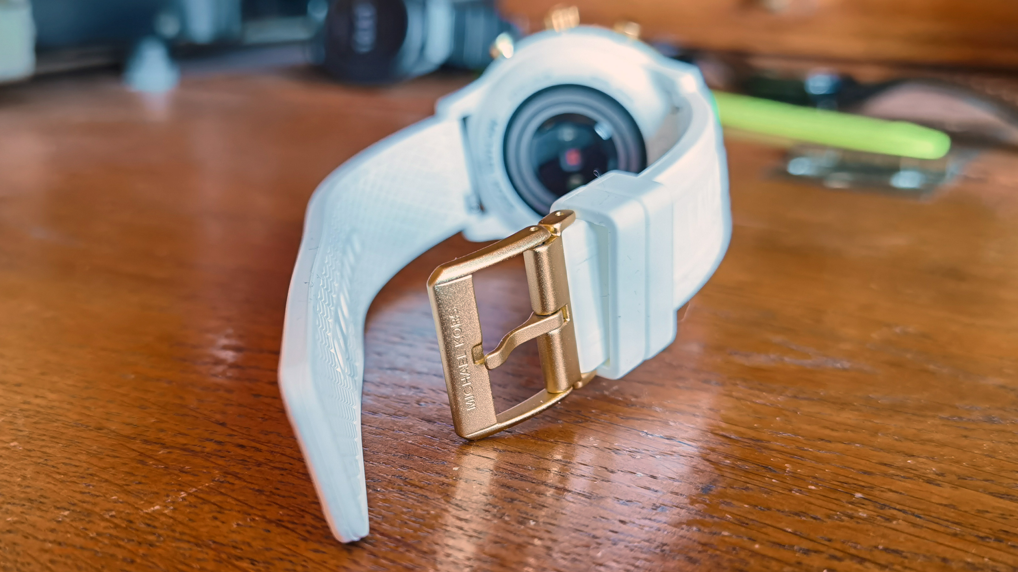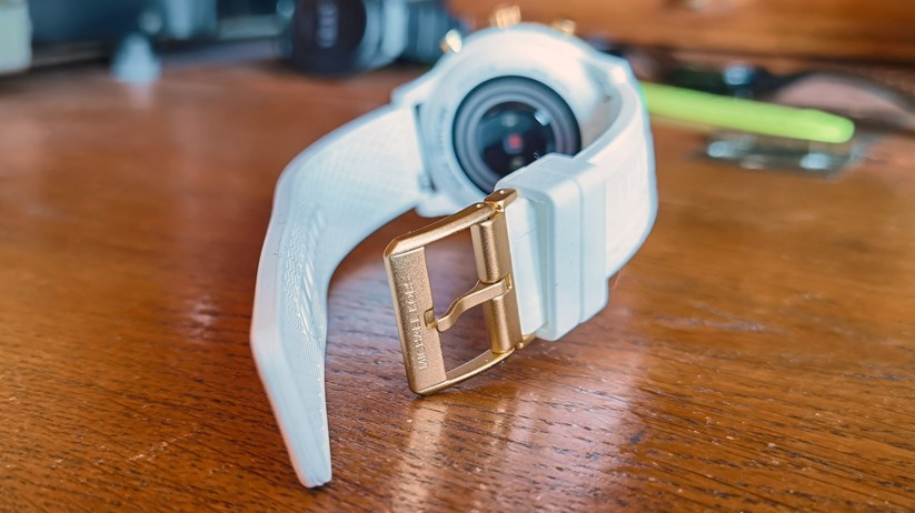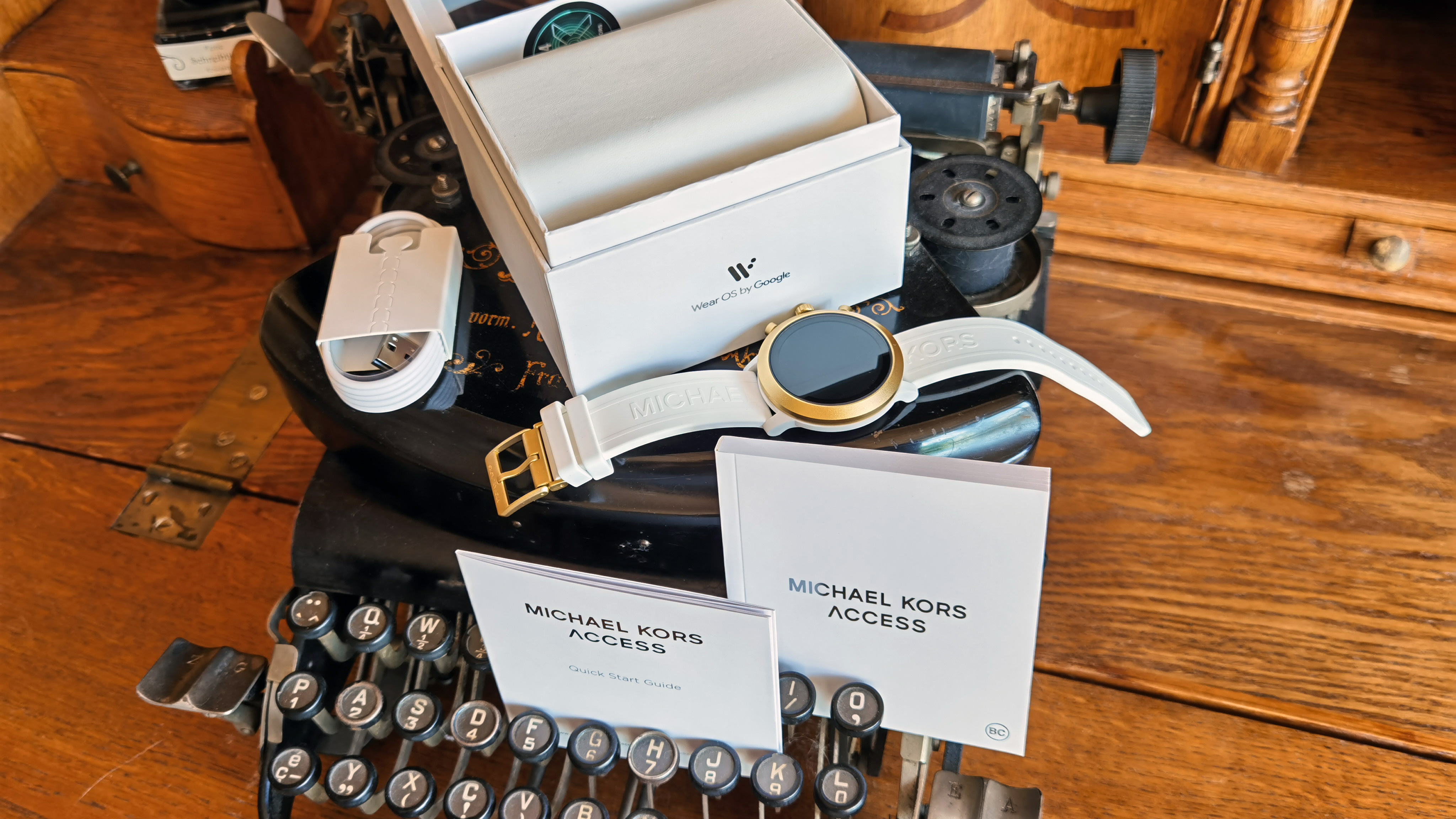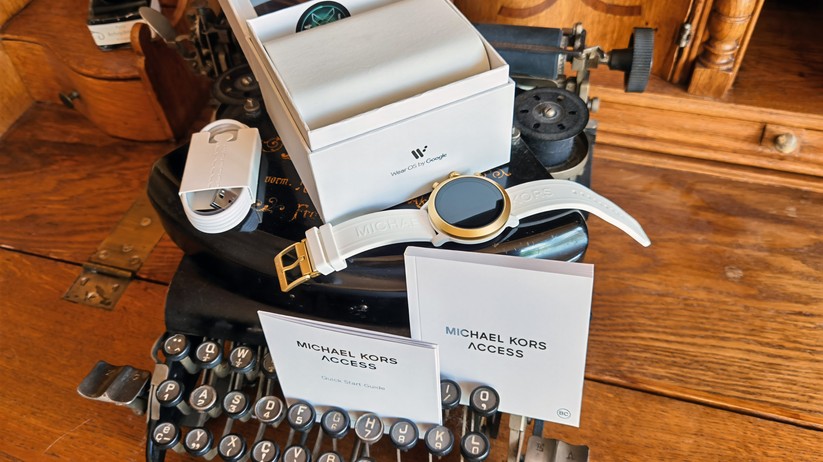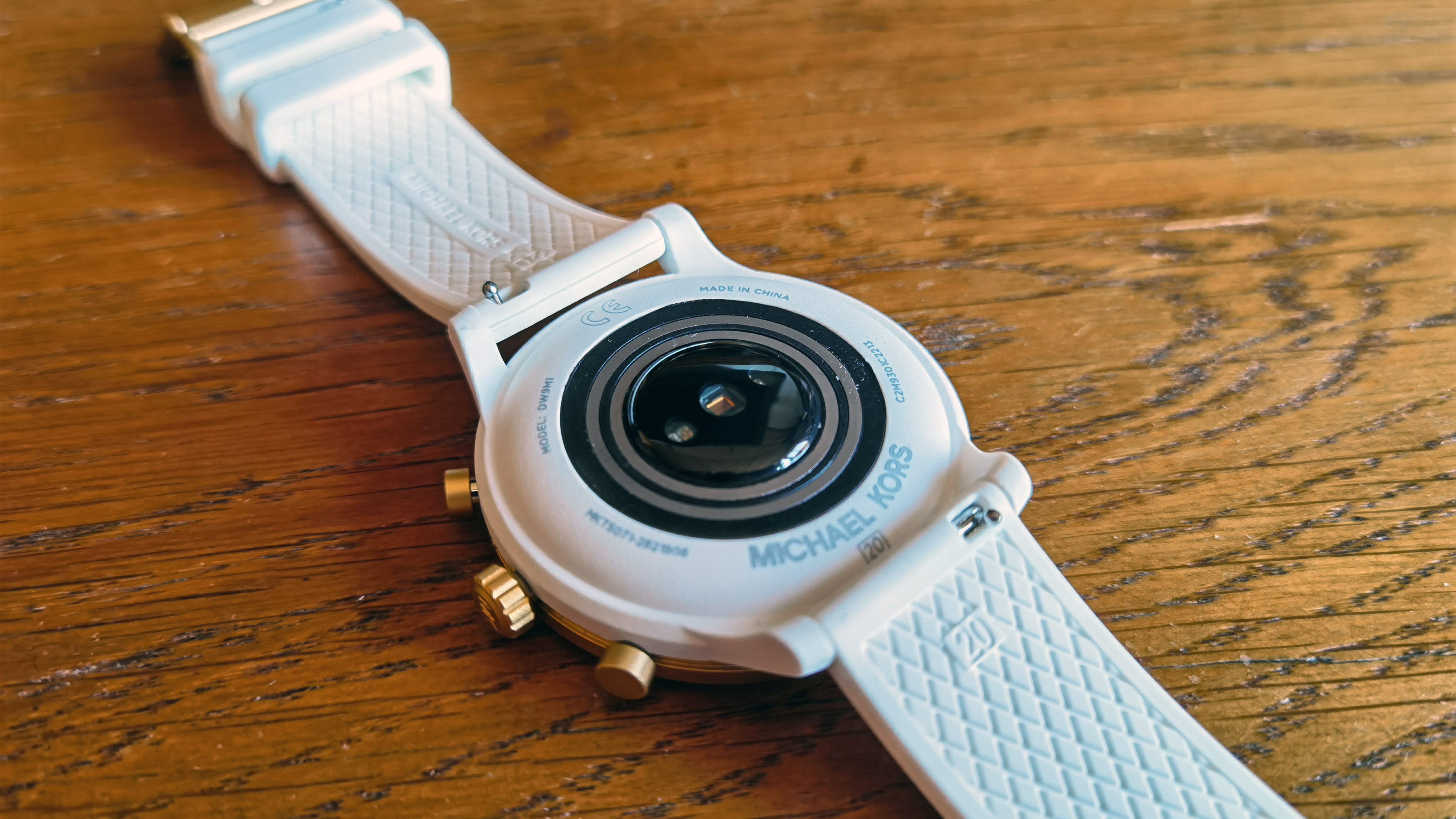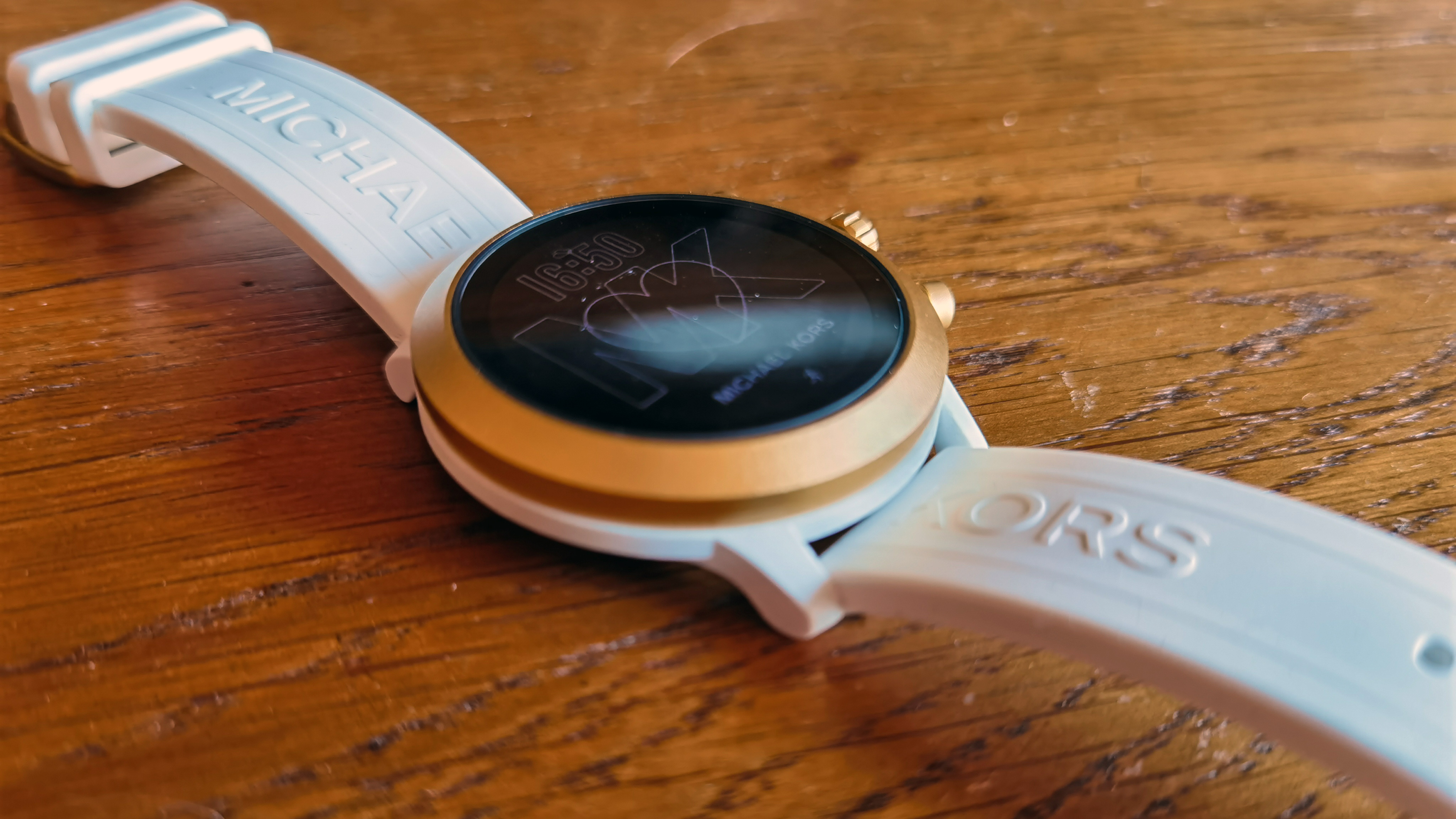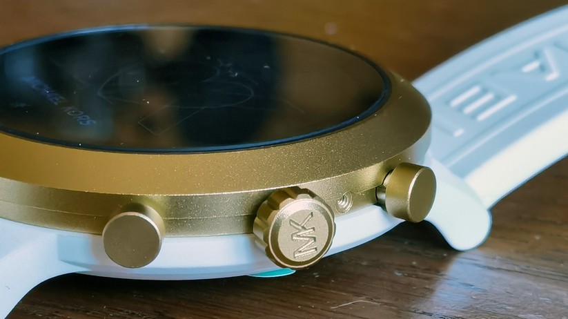Das Exemplar von Michael Kors ist eine Mischung aus Fossil- und Puma-Smartwatch – sowohl optisch als auch technisch. Der Lieferkarton reiht sich bei Aufmachung und Wertigkeit zwischen Armani und Fossil ein – immerhin gibt es hier einen Kunststoff-Einsatz mit Kunstlederbezug statt Pappe. Bei der Größe orientiert sich die Uhr am Puma-Modell, kommt aber mit drei Knöpfen, von denen sich der Mittlere wie bei den Modellen von Fossil und Armani zum Scrollen drehen lässt. Der Uhrenkorpus ist in Gold gehalten und unterscheidet sich klar vom Gelb-Ton der Puma-Uhr. Denkt man sich deren schwarze Kunststoffeinhüllung weg, trifft man erneut auf große optische Ähnlichkeit des reinen Korpus. Die Verarbeitung ist ansonsten tadellos, auch das weiße Silikonarmband mit großflächigem Michael-Kors-Schriftzug wirkt weicher und hochwertiger.