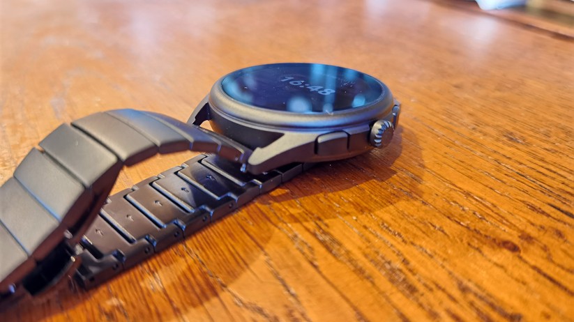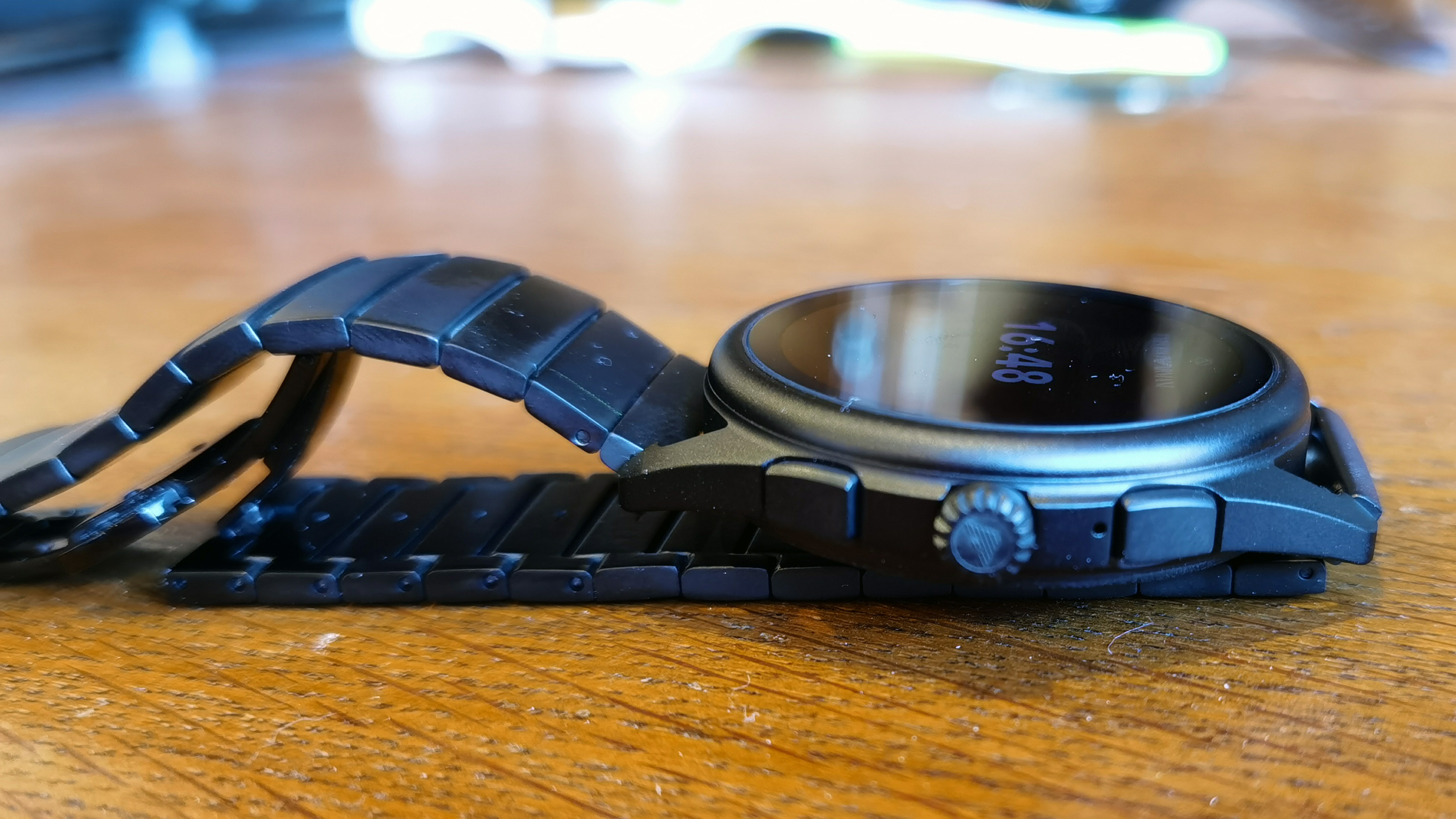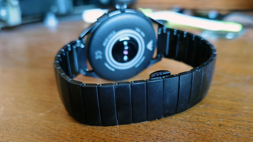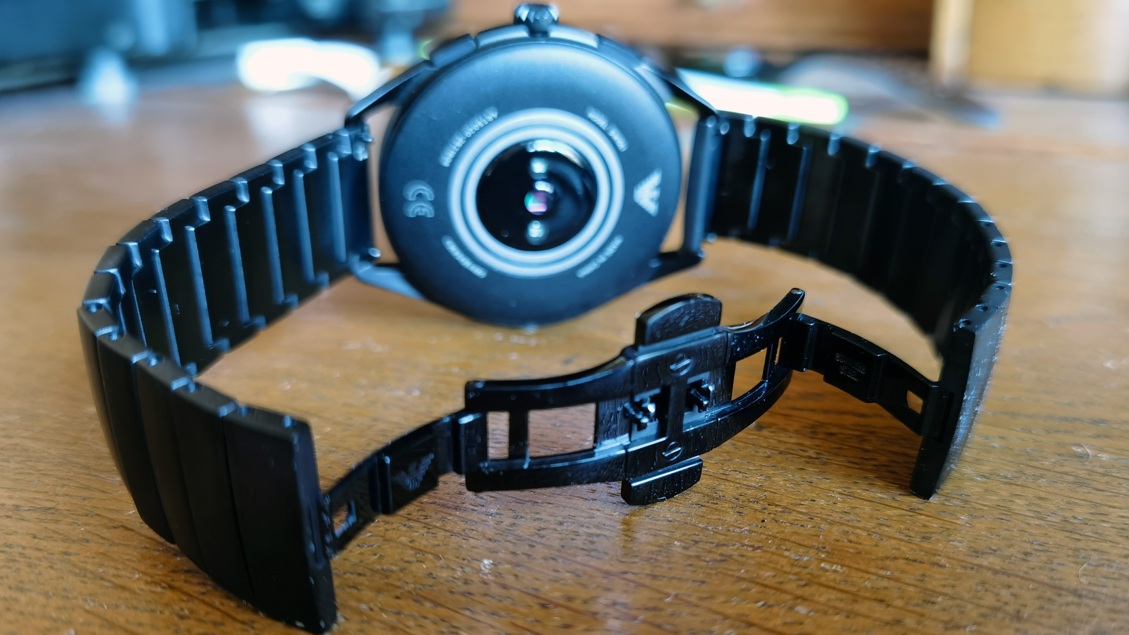 Die Uhr selbst geht optisch ähnliche Wege wie das Modell direkt von Fossil. Die Armbandaufnahmen sind etwas ausladender als bei der Carlyle, das Gehäuse ist in mattem Schwarz statt glänzender Oberfläche gehalten. Das gilt für das Gliederarmband mit doppelter Faltschließe, durch die von außen kein Schließmechanismus zu sehen ist. Je nach Lichteinfall erinnert das Material an Gun-Metall. Die Größe der Uhr ist mit der Fossil Carlyle weitestgehend identisch, entsprechend wirkt die Armani-Version wohlproportioniert. Leider stört hier im Betrieb erneut der etwas breite Rand um das ebenfalls identische OLED-Display. Die Verarbeitung des Armani-Modells ist genauso hochwertig wie beim direkten Fossil-Modell, auch hier kommt aber auf der Unterseite Kunststoff zum Einsatz. Die beiden zusätzlichen Knöpfe sind allerdings nicht so weit hervorstehend und eckig ausgelegt. Die Krone dient hier als Druckknopf und zusätzlich zum Scrollen durch Menüs.