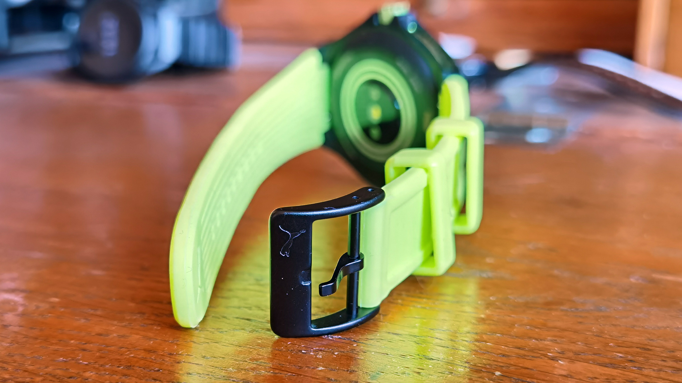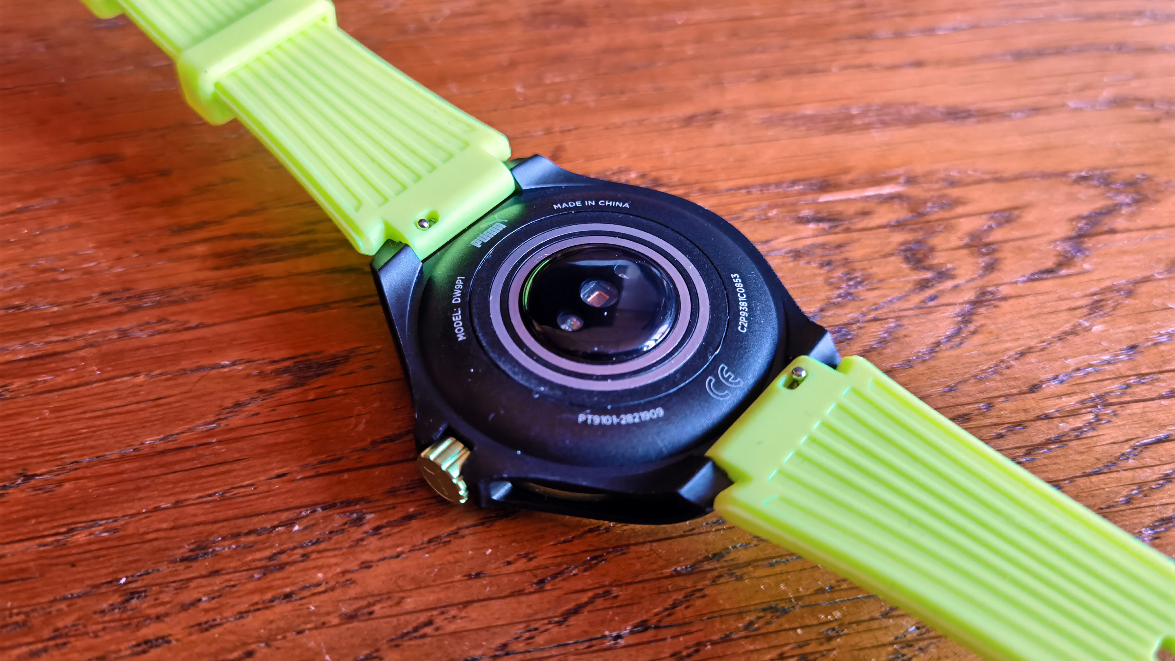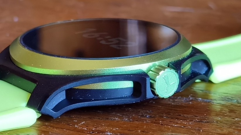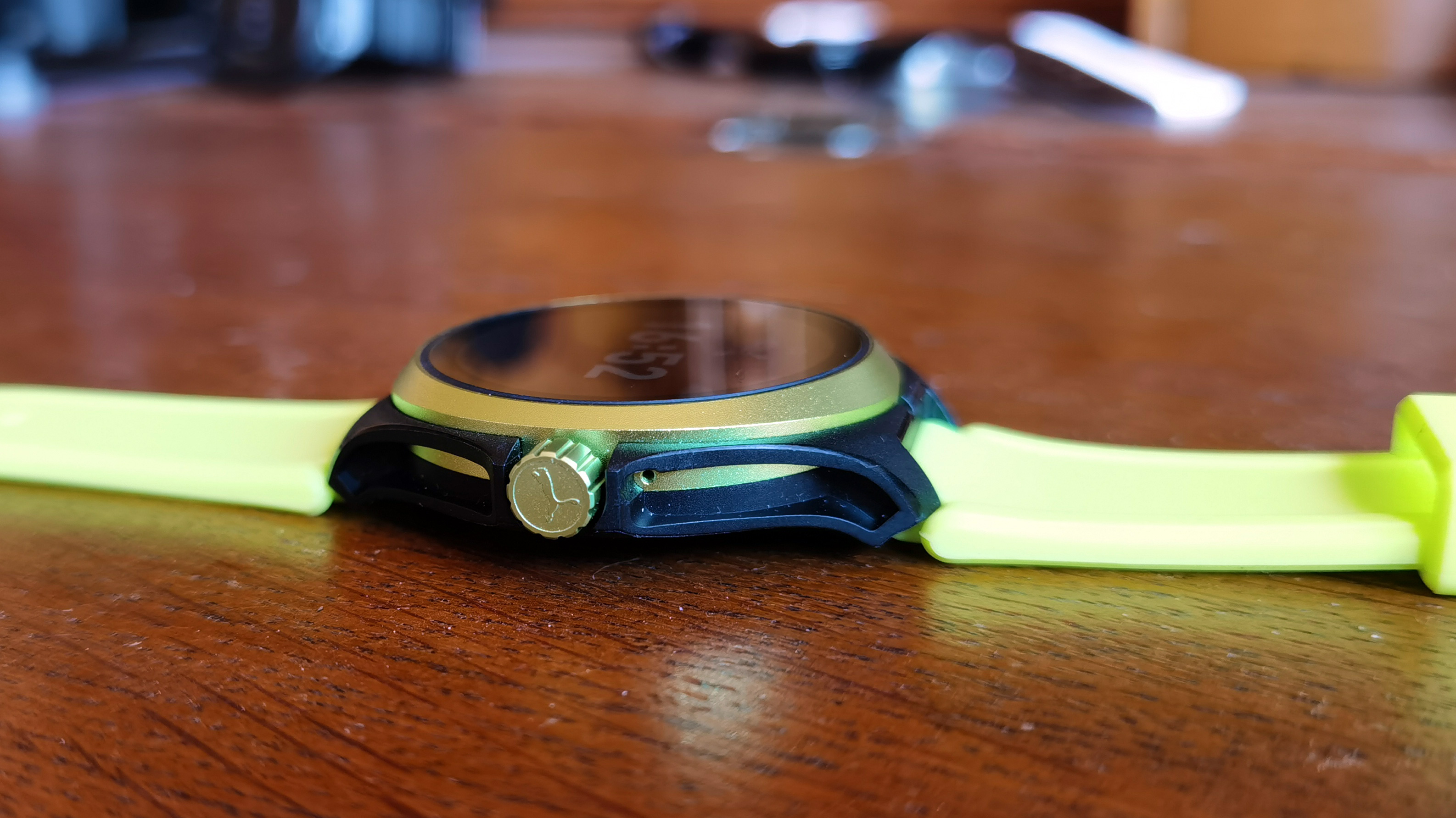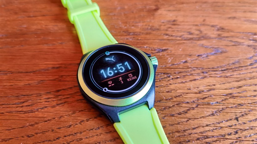 Die Puma Smartwatch ist die erste Zusammenarbeit von Fossil und Sportartikelhersteller Puma. Hauptaugenmerk liegt hier trotz Wear OS auf Fitness, das zeigt schon die grell-gelbe Farbgebung unseres Testmusters. Auch beim Design der Uhr geht die schlicht Puma Smartwatch genannte Uhr andere Wege. So verzichtet sie auf weitere Bedienknöpfe, die Scroll-Funktion der Krone behält sie immerhin bei. Die feste Lünette ist in einem gelb-goldenen Farbton gehalten, die wenig hochwertig wirkende Kunststoffeinfassung hingegen schwarz. Leider passt das neongelbe Kunststoffarmband farblich nicht ganz zum eher goldenen Farbton des Uhrenkorpus. Zudem ist das Armband etwas hart und wirkt nicht übermäßig hochwertig. Positiv ausgedrückt wirkt die Puma Smartwatch im Vergleich zur Carlyle oder der Armani Connected 3 deutlich sportlicher, negativ ausgedrückt billig.