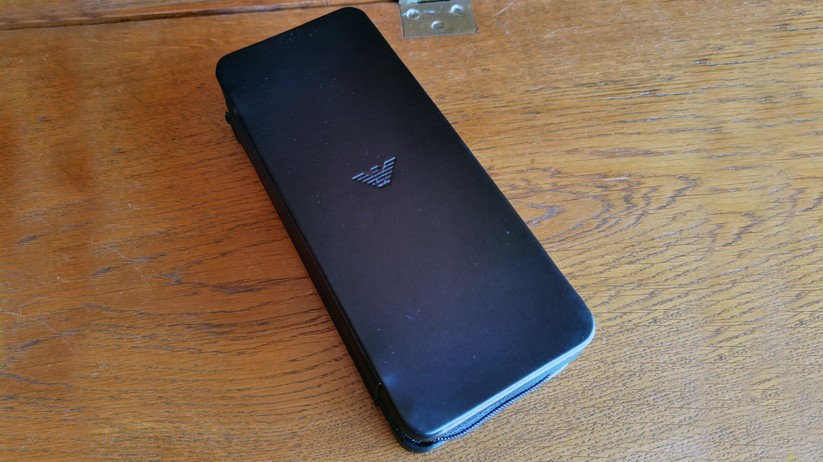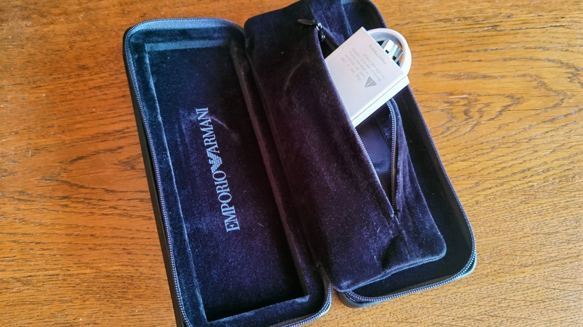 Schon bei der Ankunft beim Käufer will die Armani-Variante der Fossil-Smartwatch der 5. Generation klarmachen: Hier hast du etwas ganz besonderes! Denn während die Carlyle in einem einfachen Karton mit durchsichtigem Kunststoffdeckel steckt, erwartet den Armani-Käufer ein spezielles Aufbewahrungs-Etui mit Reißverschluss und Samt-Inlay. Nicht ganz dazu passen wollen die billig wirkenden Schaumstoffeinlagen, die allerdings effektiv Kratzer an Uhrengehäuse oder dem schicken schwarzen Metallarmband unserer Testversion verhinderten. Uns hat das nicht ganz überzeugt – der Liefer“karton“ ist zwar ansprechender als bei Fossil direkt, so richtig hochwertig wirkte er auf uns aber nicht. Auch hier kommt wieder ein weißer Ladeadapter zum Einsatz.