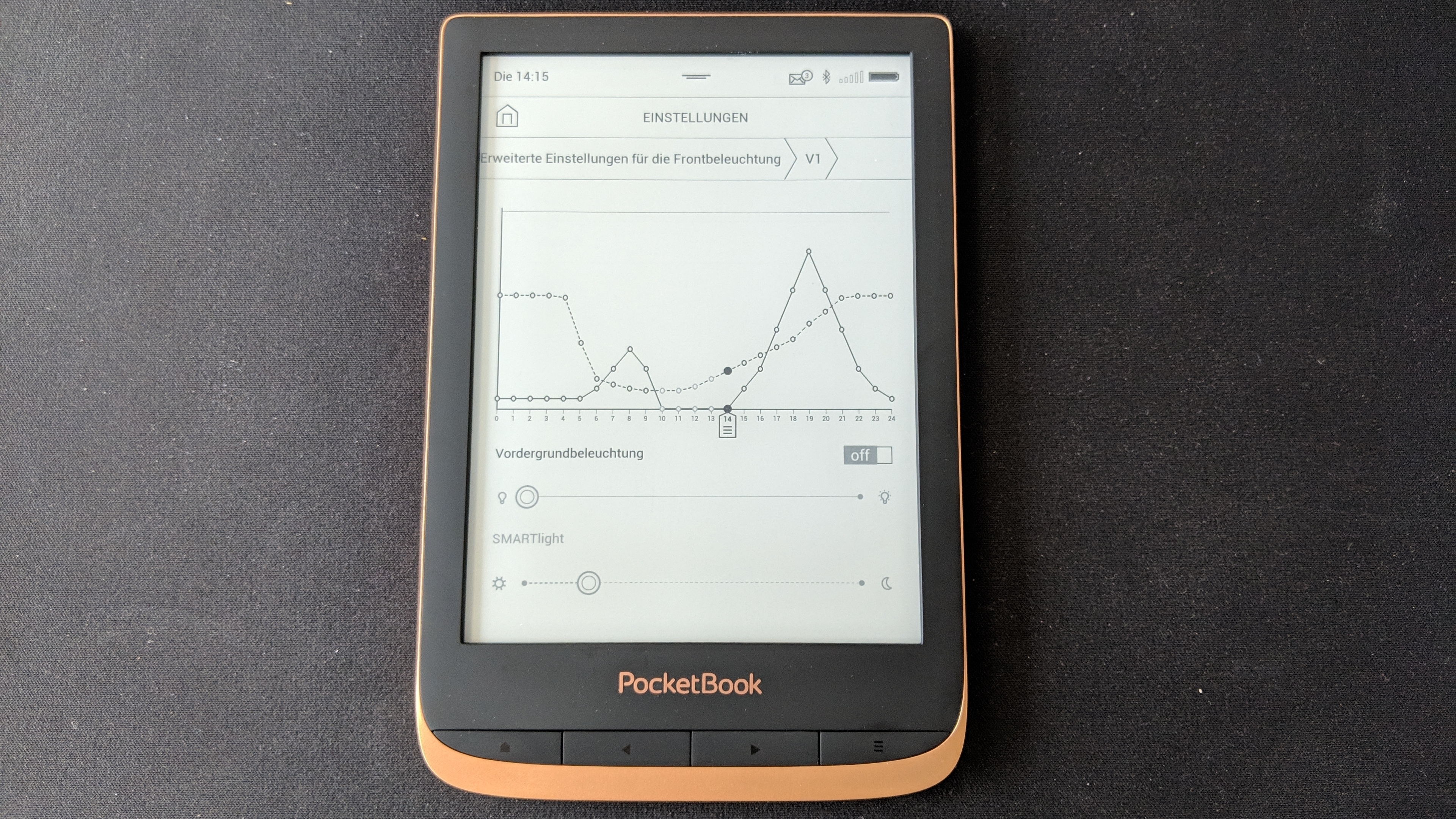 Eine kleine Überraschung offenbarte die Helligkeitsmessung. Bei kaltweißer Beleuchtung kommt der Amazon Kindle Paperwhite auf 108, der Pocketbook Touch HD 3 auf 92 und der Tolino Shine 3 lediglich auf 52 cd/m². Allerdings versteckt der Tolino eine Option, die Helligkeit aufzubohren. Dafür muss man einfach in den Beleuchtungsoptionen ein paar Sekunden lang den Punkt Hell gedrückt halten. Nun setzt sich der Shine 3 mit einer maximalen Helligkeit von 122 cd/m² an die Spitze. Etwa diese Helligkeit erreicht er auch bei warmweißer Beleuchtung, während der Touch HD 3 hier mit 58 cd/m² deutlich abfällt. Damit bietet der günstigste der drei die beste Beleuchtung.