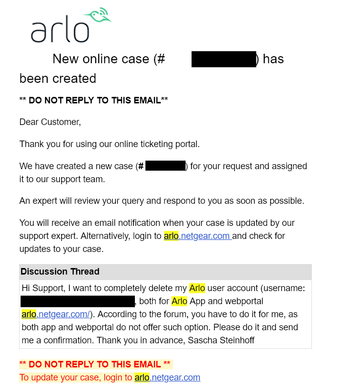 Es gab bei Arlo aber auch einen schweren grundsätzlichen Mangel. Der zeigte sich, als wir nach dem Test die Benutzerkonten und die damit verbundenen Videobibliotheken bei Blink und Arlo auflösen wollten. Bei Blink war das eine unkomplizierte Sache und mit wenigen Klicks erledigt. Aus Sicherheitsgründen kann man dann mit der gleichen Mailadresse bei Blink kein neues Benutzerkonto anlegen. Das ist aber auch die einzige und durchaus akzeptable Einschränkung. Bei Arlo hingegen kann der Benutzer sein Konto gar nicht selbst auflösen! Stattdessen muss man den Support hierfür um Unterstützung bitten und hoffen, dass der dann auch tätig wird. Dies wird in entsprechenden Foren als sehr mühselig beschrieben und das können wir bestätigen. Auf unsere Löschanfrage an den Arlo-Support haben wir nie eine Antwort erhalten. Datensouveränität gesteht zumindest Arlo seinen Anwendern ganz offensichtlich nicht zu.