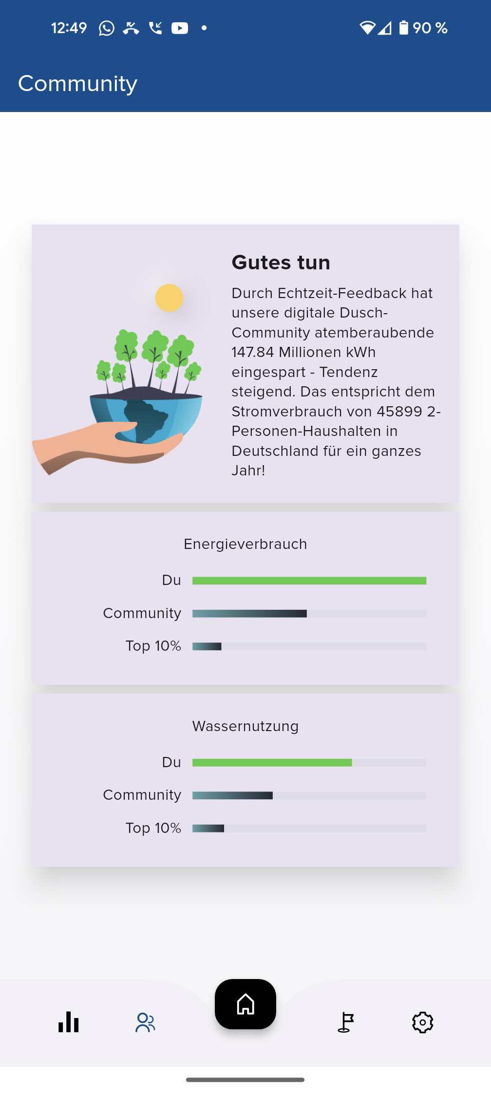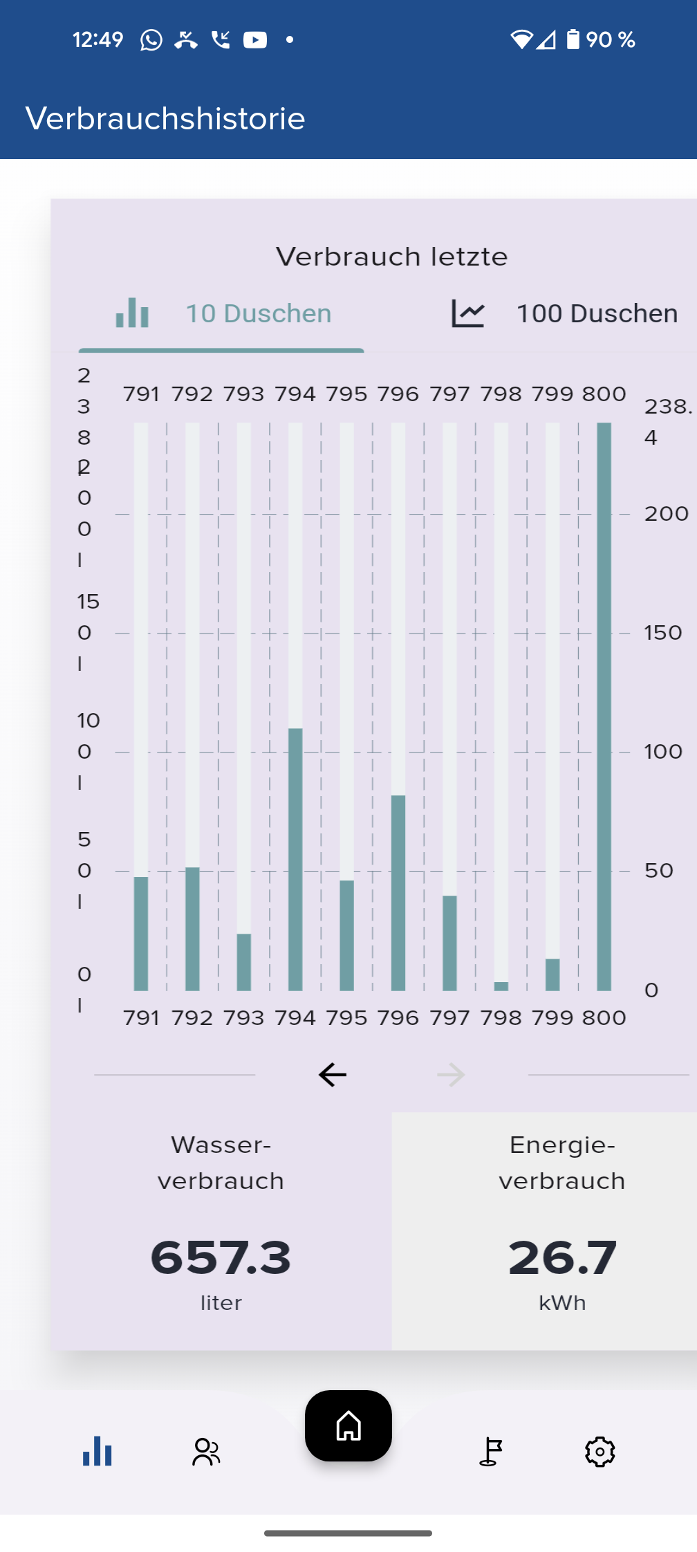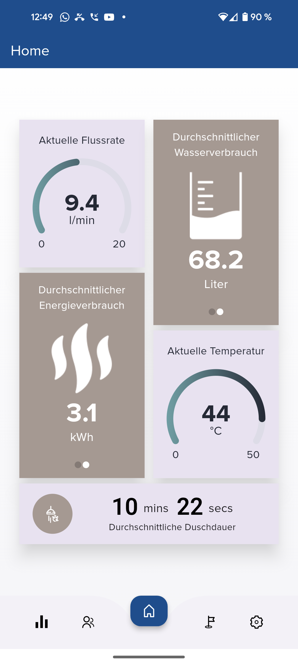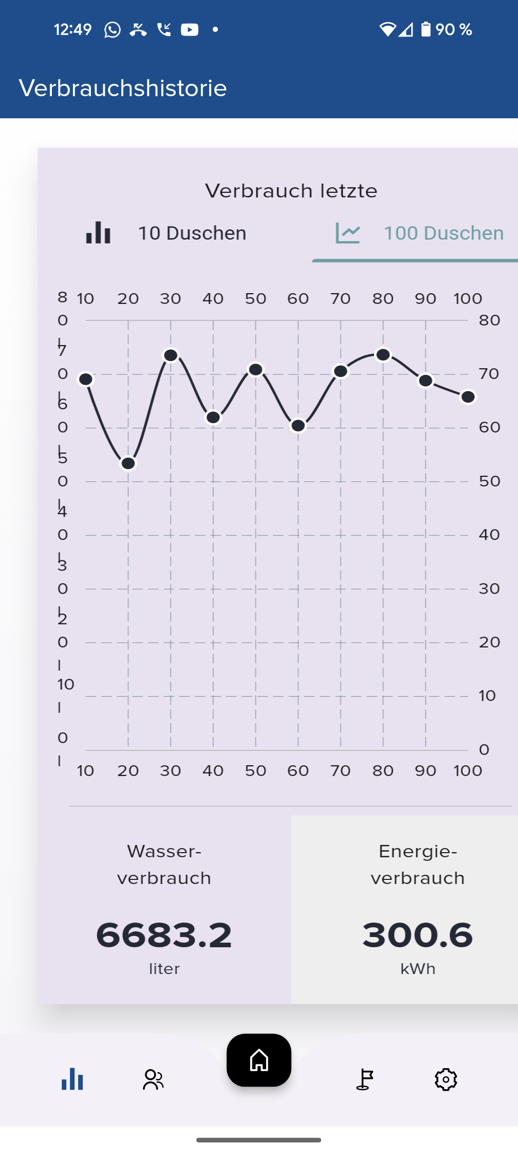 Die App zeigt grafisch den Wasserverbrauch der letzten zehn und der letzten einhundert Duschvorgänge an. Dies kann in einem Haushalt mit mehreren Bewohnern praktisch sein, um Ausschläge beim Wasserbrauch zu identifizieren und entsprechende Personen zum sparsameren Duschen zu animieren. Leider fehlt der Statistik eine Zeitangabe. Wer die App während des Duschens aktiviert, erhält Echtzeitdaten zur Durchflussrate, dem Energieverbrauch in kWh, der Temperatur und der Duschdauer.