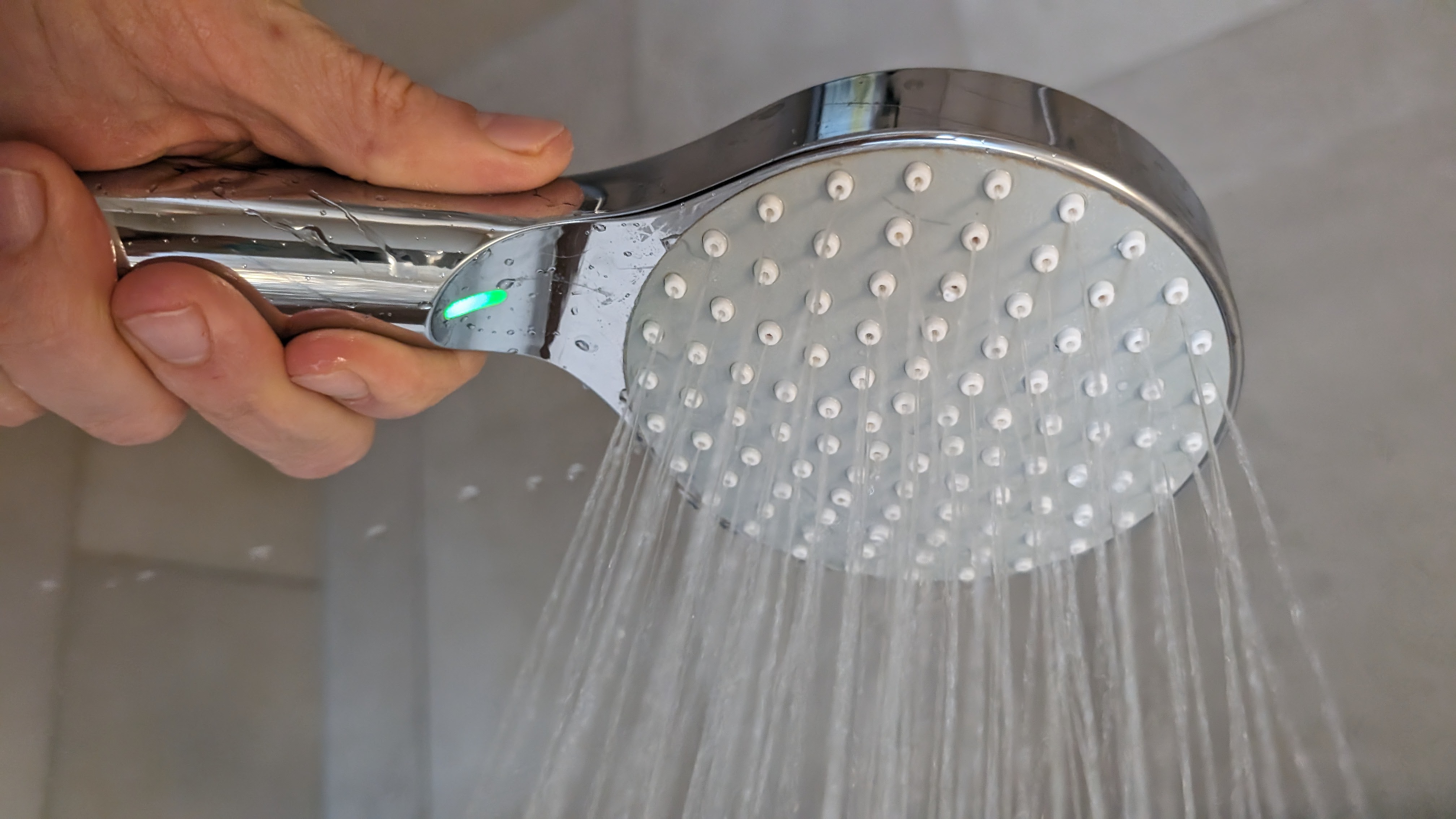 Gut sichtbar an der Unterseite des Duschkopfs sitzt eine beleuchtete Temperaturanzeige. Noch praktischer ist der farbige, die Düsen umschließende LED-Ring. Bei kaltem Wasser leuchtet er in Blau, wird es wärmer in Grün und ab 42° Celsius dann in Rot. So ist selbst im Augenwinkel gut erkennbar, wenn das Wasser die Wohlfühltemperatur erreicht. Was dem Duschkopf fehlt, ist eine Angabe der verbrauchten Wassermenge.