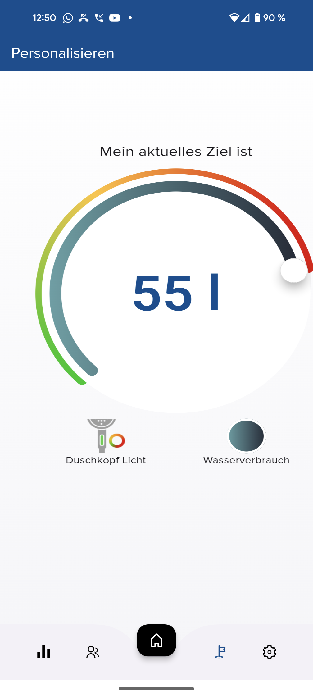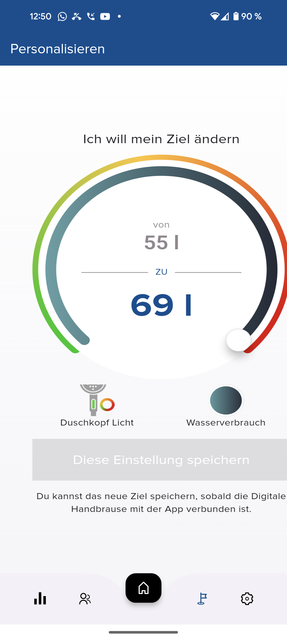 Bauartbedingt kaum anders möglich, dennoch unpraktisch: Will man beim Duschen den Wasserverbrauch und die Temperatur checken, muss man stets den Duschkopf aus der Halterung nehmen, um die Anzeige auf der Rückseite zu sehen. Doch es gibt an der Unterseite eine farbige LED, die sich je nach Wasserbrauch erst gelb und dann rot färbt. In der Standardeinstellung wechselt sie nach einem Durchsatz von 50 l auf Rot. In der App kann dieser Wert auf maximal 69 l gestellt werden. Gerade für Mensch, die nach dem Haare- und Körperwaschen gerne noch das angenehme Gefühl von warmem Wasser auf der Haut genießen, sehr praktisch, um das eigene Duschverhalten sparsamer zu gestalten. Wechselt die LED auf Rot, ist die Zeit gekommen, die Dusche zu verlassen.