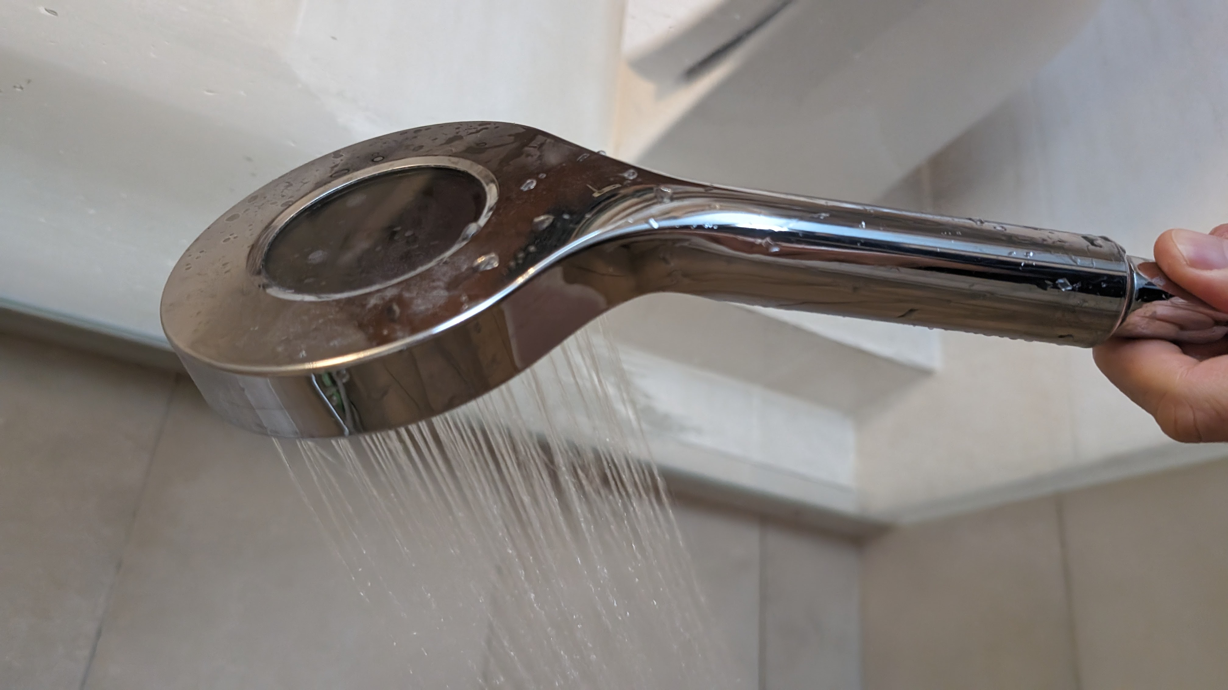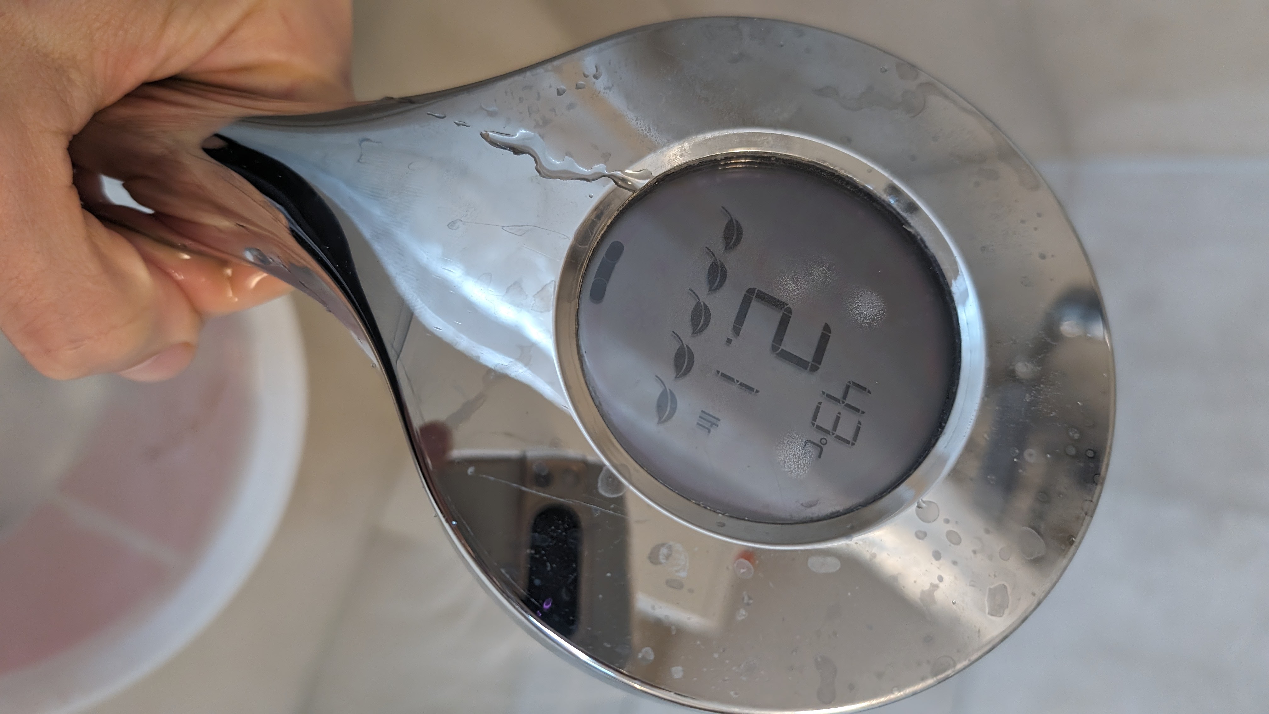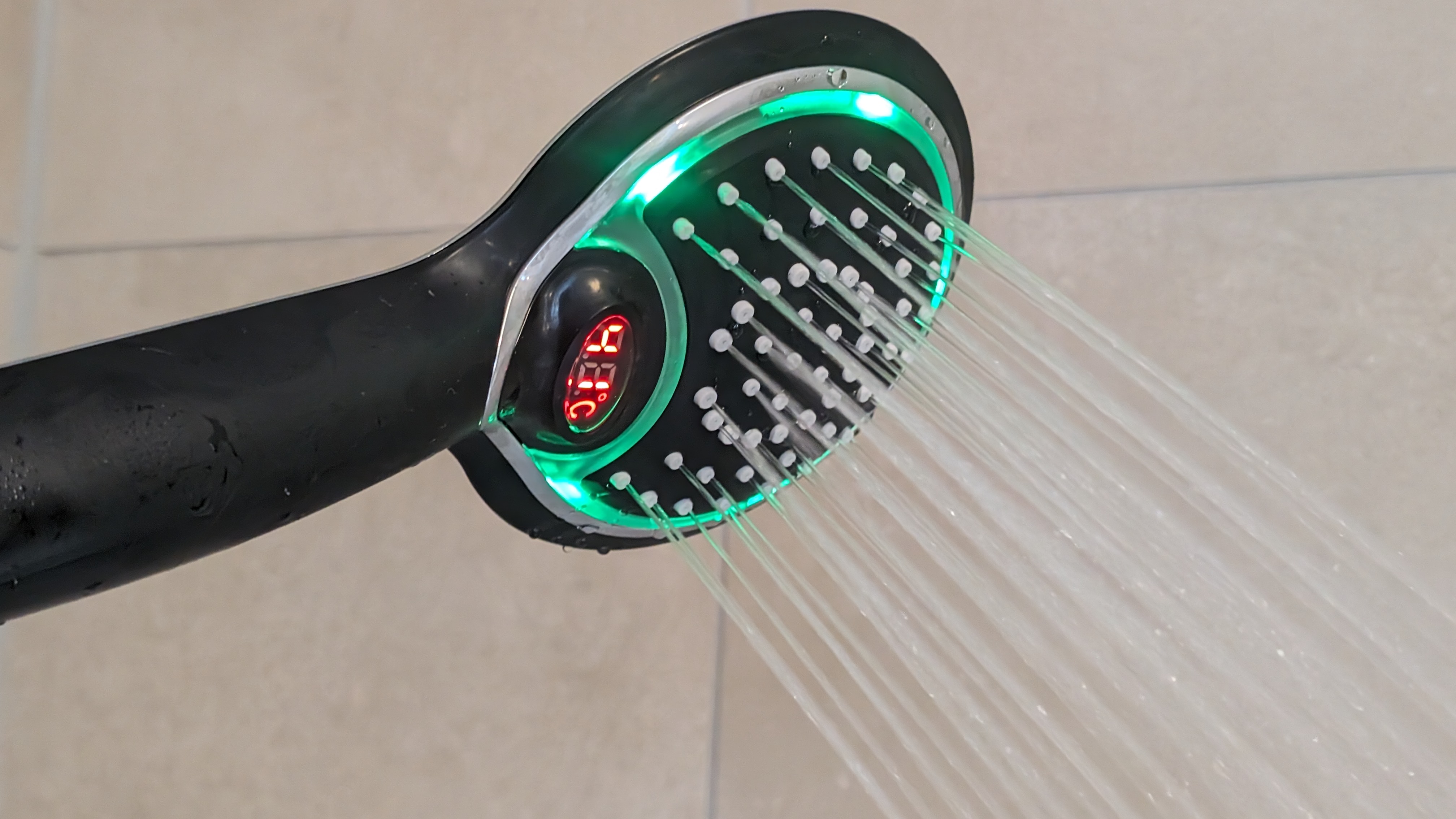 Der Duschkopf mit Temperaturanzeige, den wir uns für diesen Ratgeber angeschaut haben, kostet bei Banggood inklusive Versand aus China knapp 16 Euro. Wer lieber bei Amazon kauft, zahlt 19,50 Euro (beim Kauf 15-%-Coupon anklicken). Der Duschkopf benötigt keine Batterie, er holt sich ähnlich dem Hansa Activejet Digital die Energie aus dem Wasserfluss. Im Betrieb ist er deutlich hörbar, das stört uns unter der ohnehin lauten Dusche jedoch nicht. Das Duschen selbst ist angenehm, allerdings verringert er den Wasserdurchfluss deutlicher als der Hansa Activejet Digital. Ohne Duschkopf messen wir 13,2 l/min, mit Duschkopf 8,5 l/min.