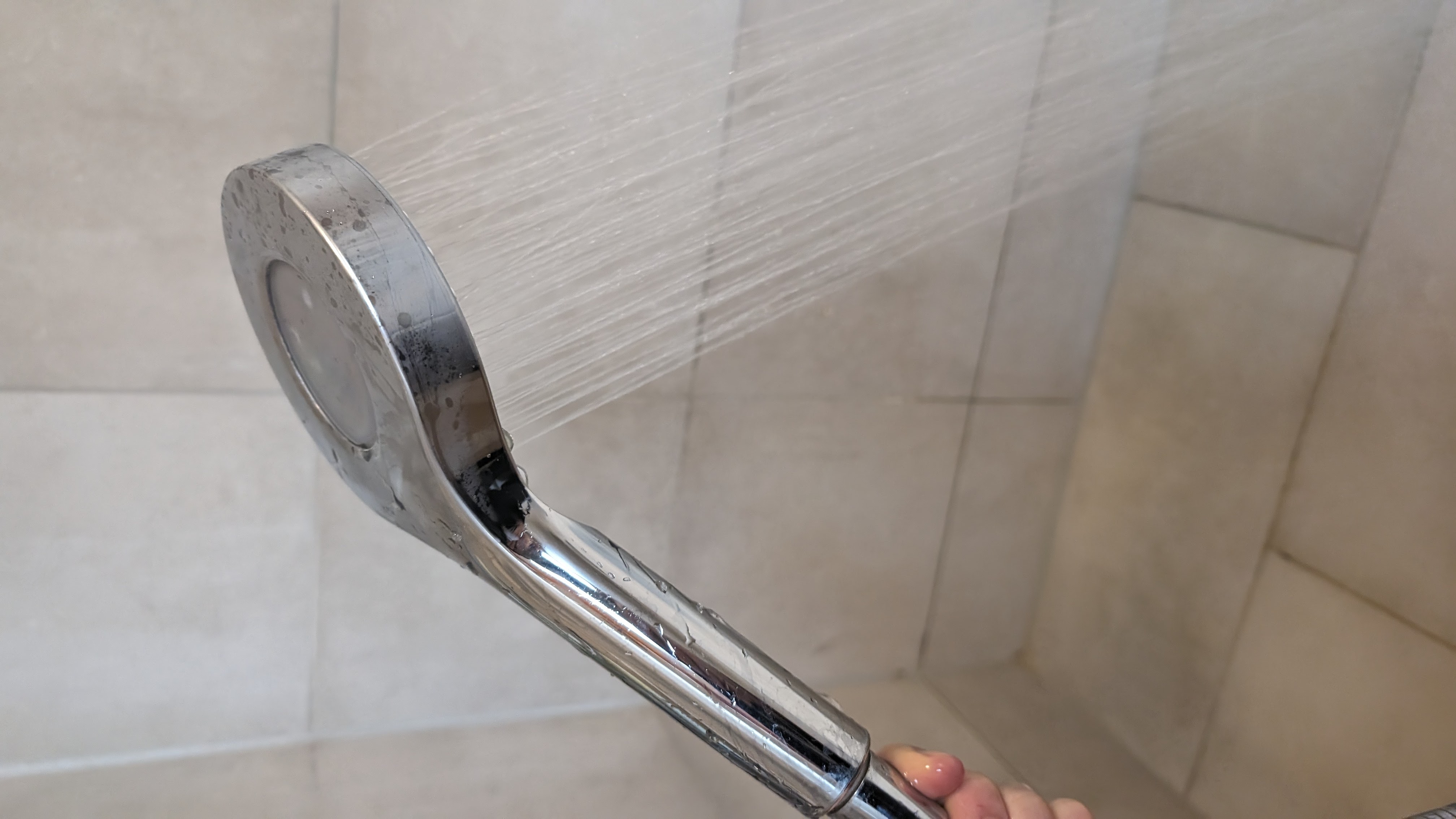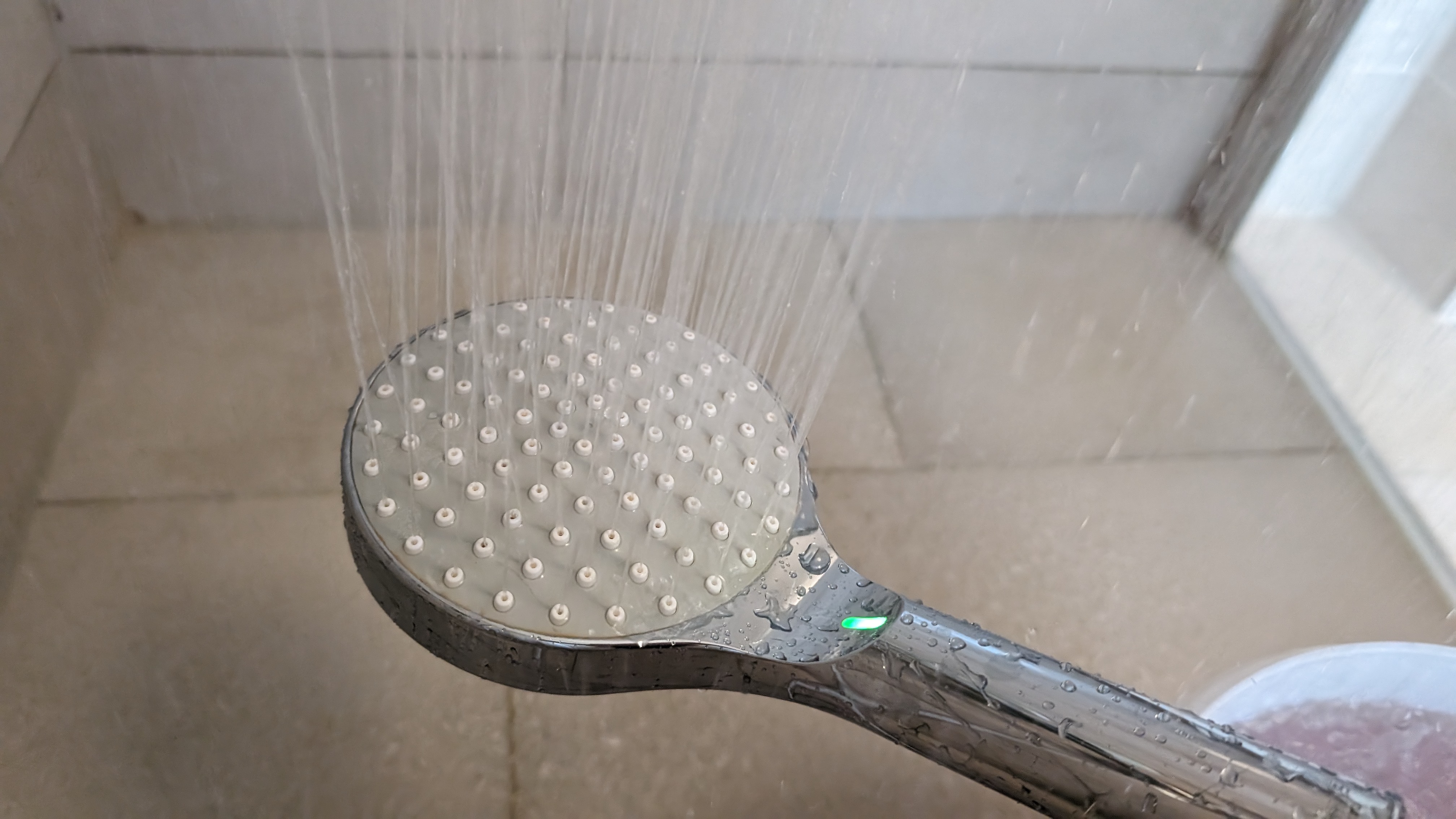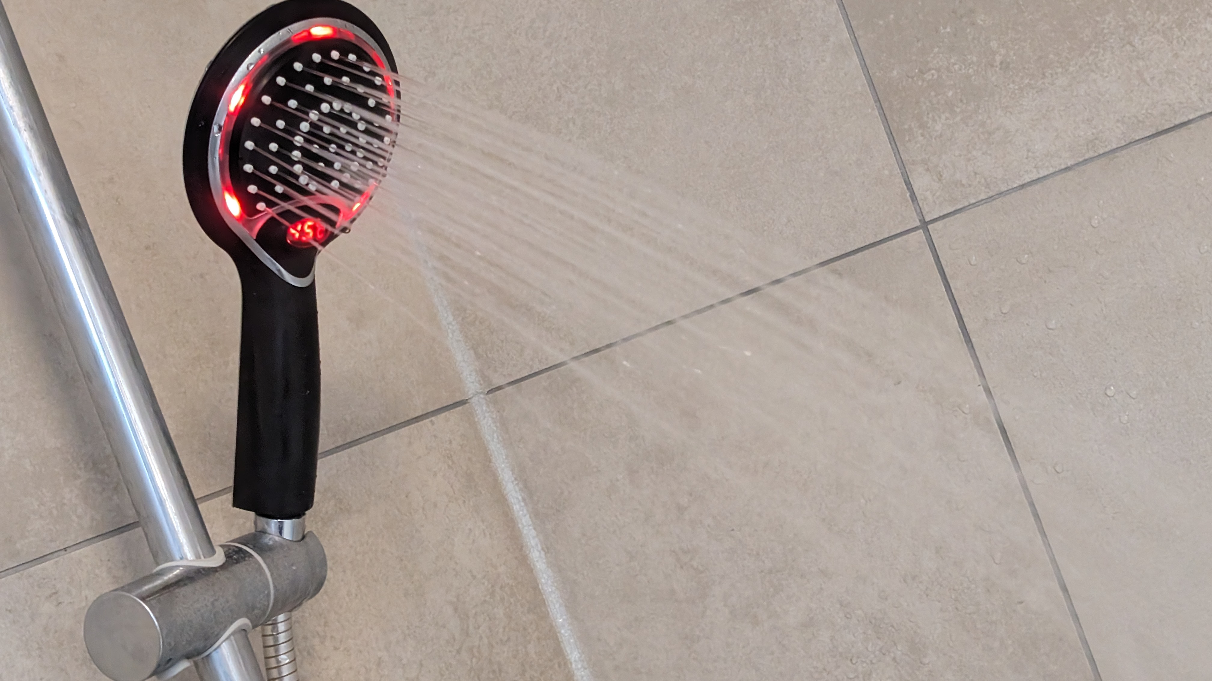 Der Duschkopf mit Temperaturanzeige, den wir uns für diesen Ratgeber angeschaut haben, kostet bei Banggood inklusive Versand aus China knapp 16 Euro. Wer lieber bei Amazon kauft, zahlt 19,50 Euro (beim Kauf 15-%-Coupon anklicken). Der Duschkopf benötigt keine Batterie, er holt sich ähnlich dem Hansa Activejet Digital die Energie aus dem Wasserfluss. Im Betrieb ist er deutlich hörbar, das stört uns unter der ohnehin lauten Dusche jedoch nicht. Das Duschen selbst ist angenehm, allerdings verringert er den Wasserdurchfluss deutlicher als der Hansa Activejet Digital. Ohne Duschkopf messen wir 13,2 l/min, mit Duschkopf 8,5 l/min.
