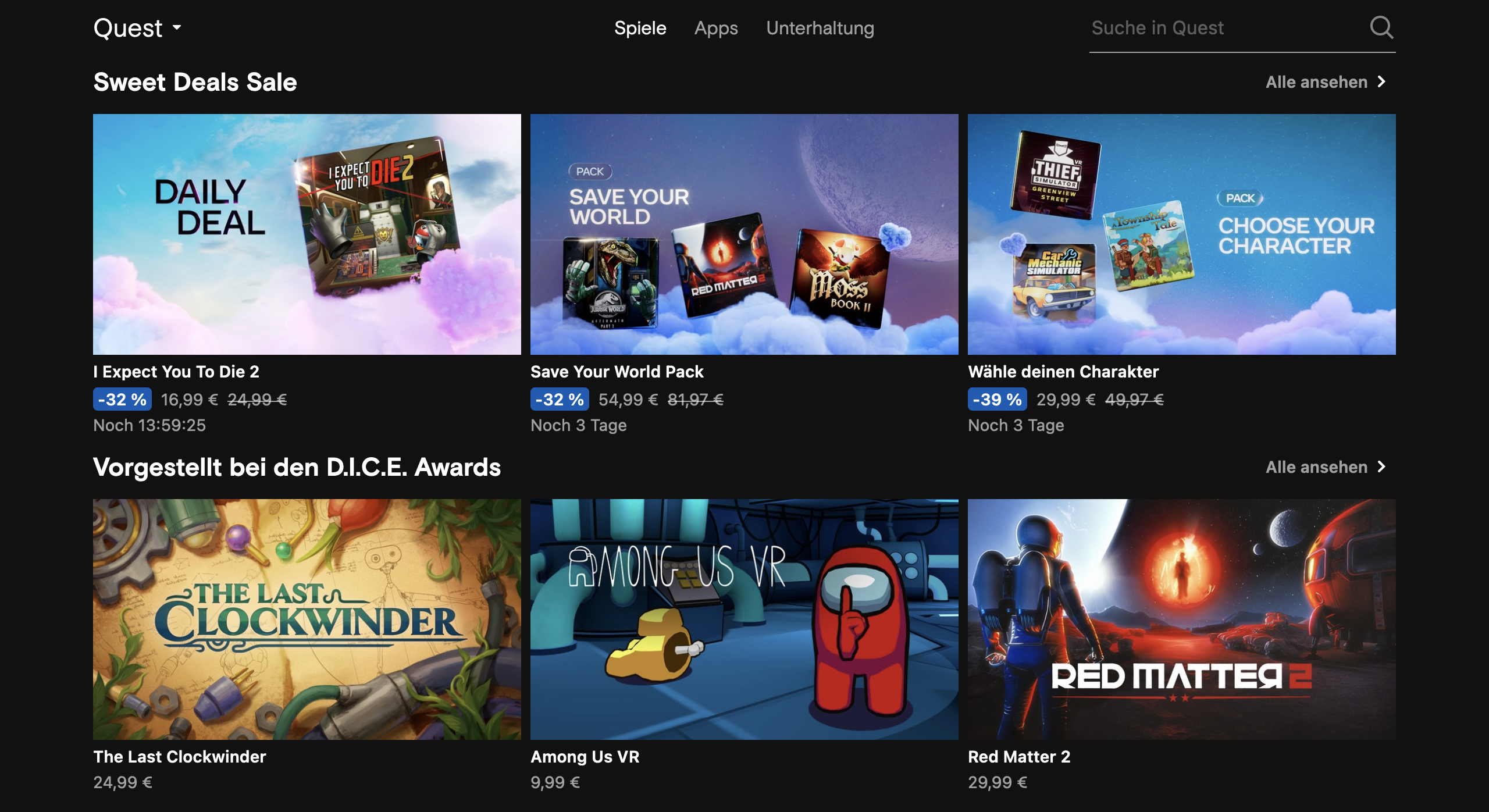 Mit größerem Abstand dahinter folgen die Stores von Pico und HTC. Auch hier tummelt sich viel Interessantes und wer regelmäßig vorbeischaut, wird auch immer wieder neue Entdeckungen machen. Insgesamt sind die Stores jedoch weniger gut befüllt wie der von Meta. Aber: Da sich die Pico- und Vive-Geräte auch mit einem PC koppeln lassen und von Steam VR erkannt werden, hat man auf diesem Weg Zugriff auf die derzeit größte VR-Spiele-Plattform. Letztes gilt selbstverständlich auch für alle Brillen von Meta.