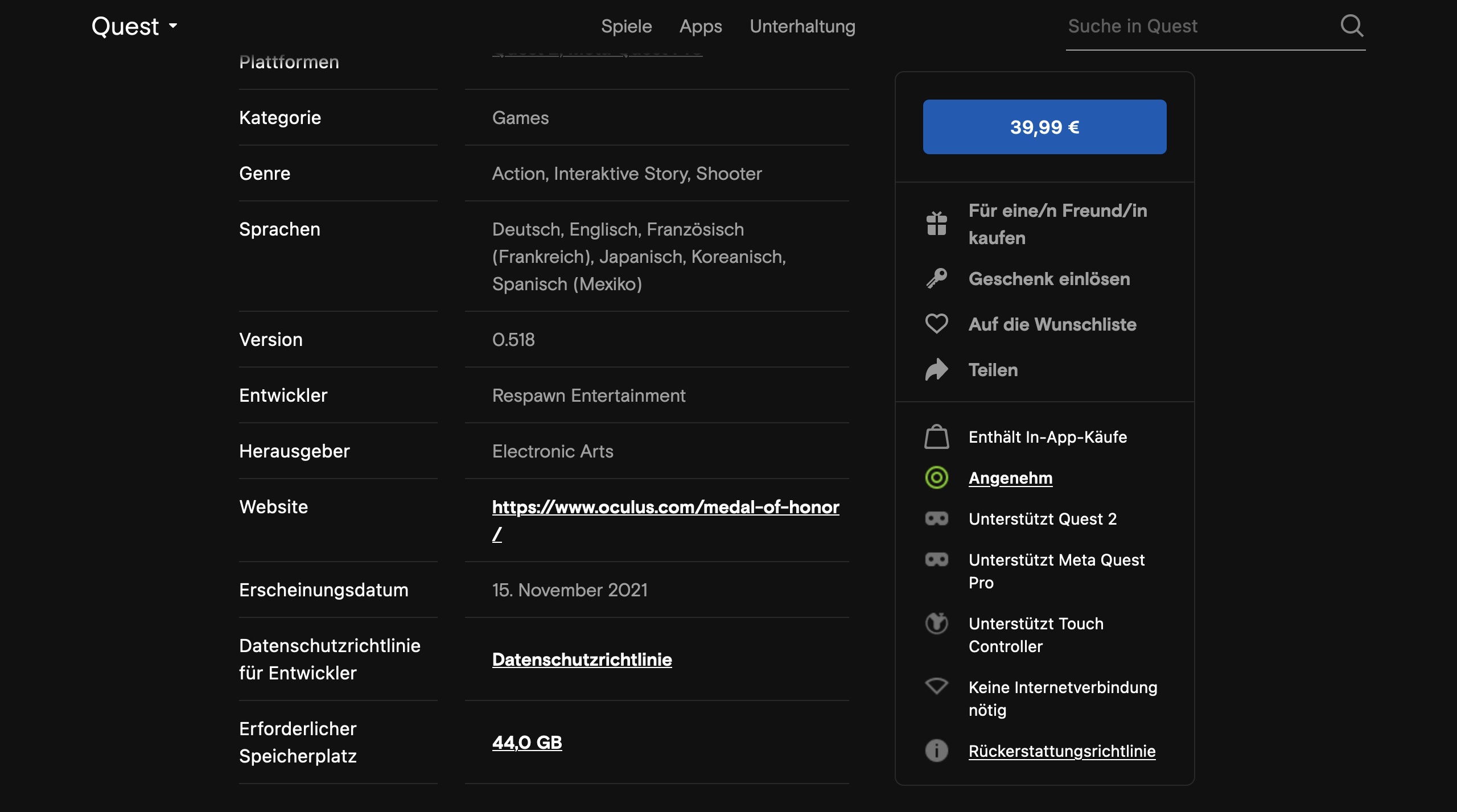 Will man beispielsweise auf einer neuen Meta Quest 2, deren Betriebssystem allein 11,3 GB Speicher einnimmt, noch das Achterbahnspiel Epic Roller Coasters sowie den beliebten Ego-Shooter Tonart installieren, sind bereits die ersten knapp 19 GB belegt. Lädt man sich nun noch die Vollversionen der Action-Titel Medal of Honor: Above and Beyond (44 GB), The Walking Dead: Saints and Sinners – Chapter 2: Retribution (15 GB) und Resident Evil 4 (8,8 GB) herunter, hat man die Schallmauer von 85 GB bereits durchbrochen. Kurz gesagt: Spiele-Enthusiasten, die Games am liebsten direkt über die Brille spielen und nicht via Link-Modus von einem gekoppelten Rechner streamen, tun gut daran, von Anfang an in eine 256-Gigabyte-Variante zu investieren.