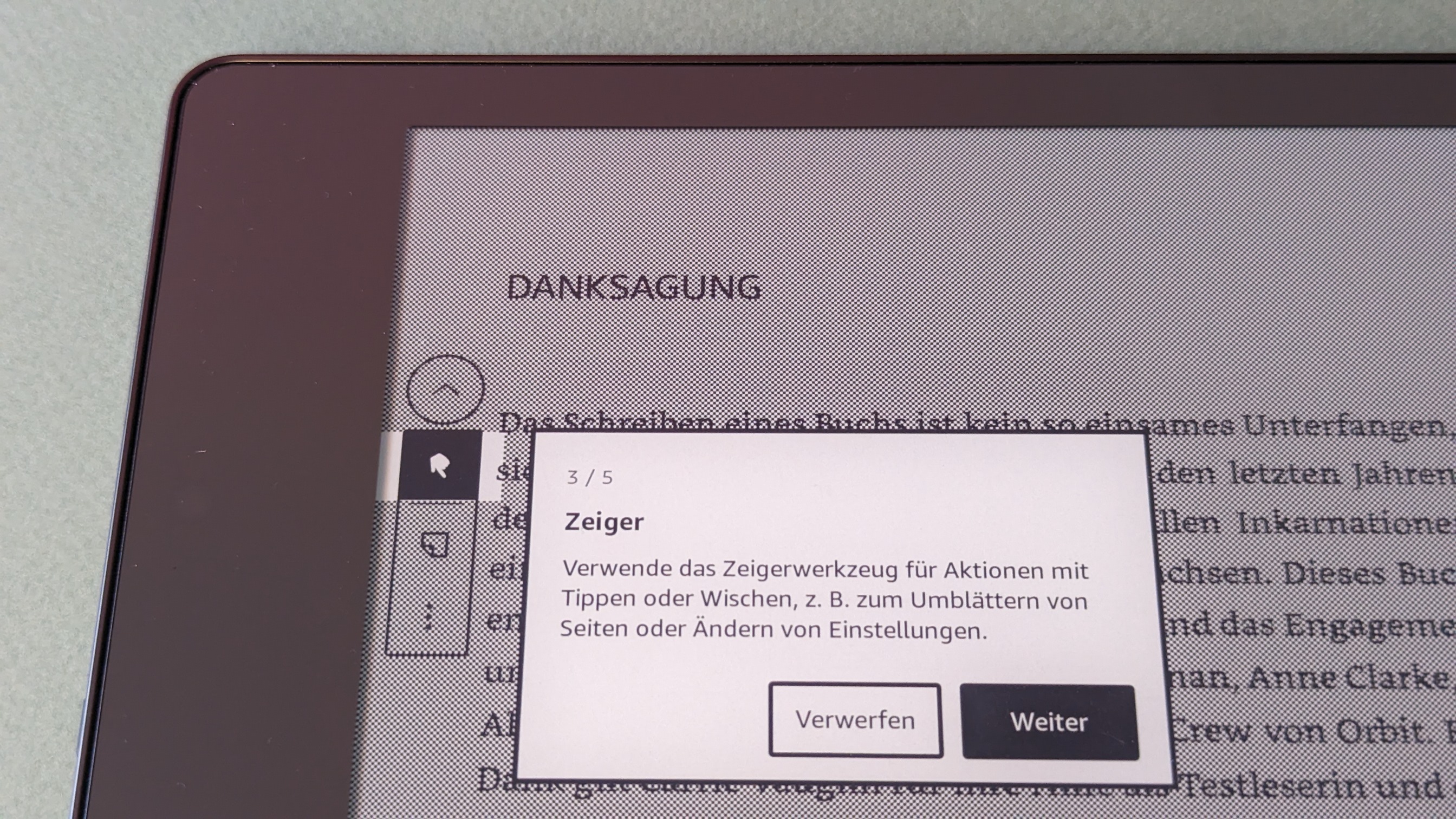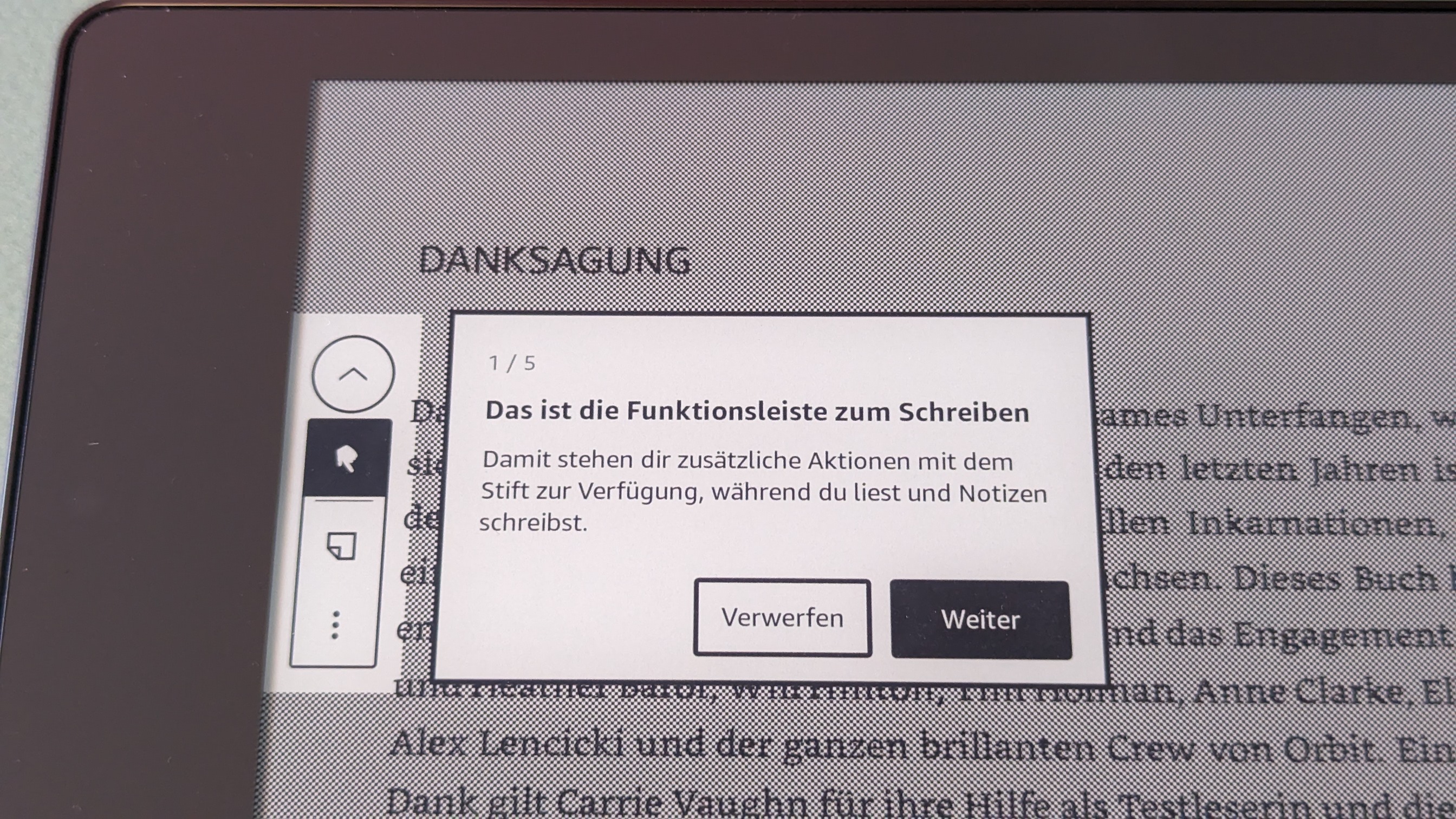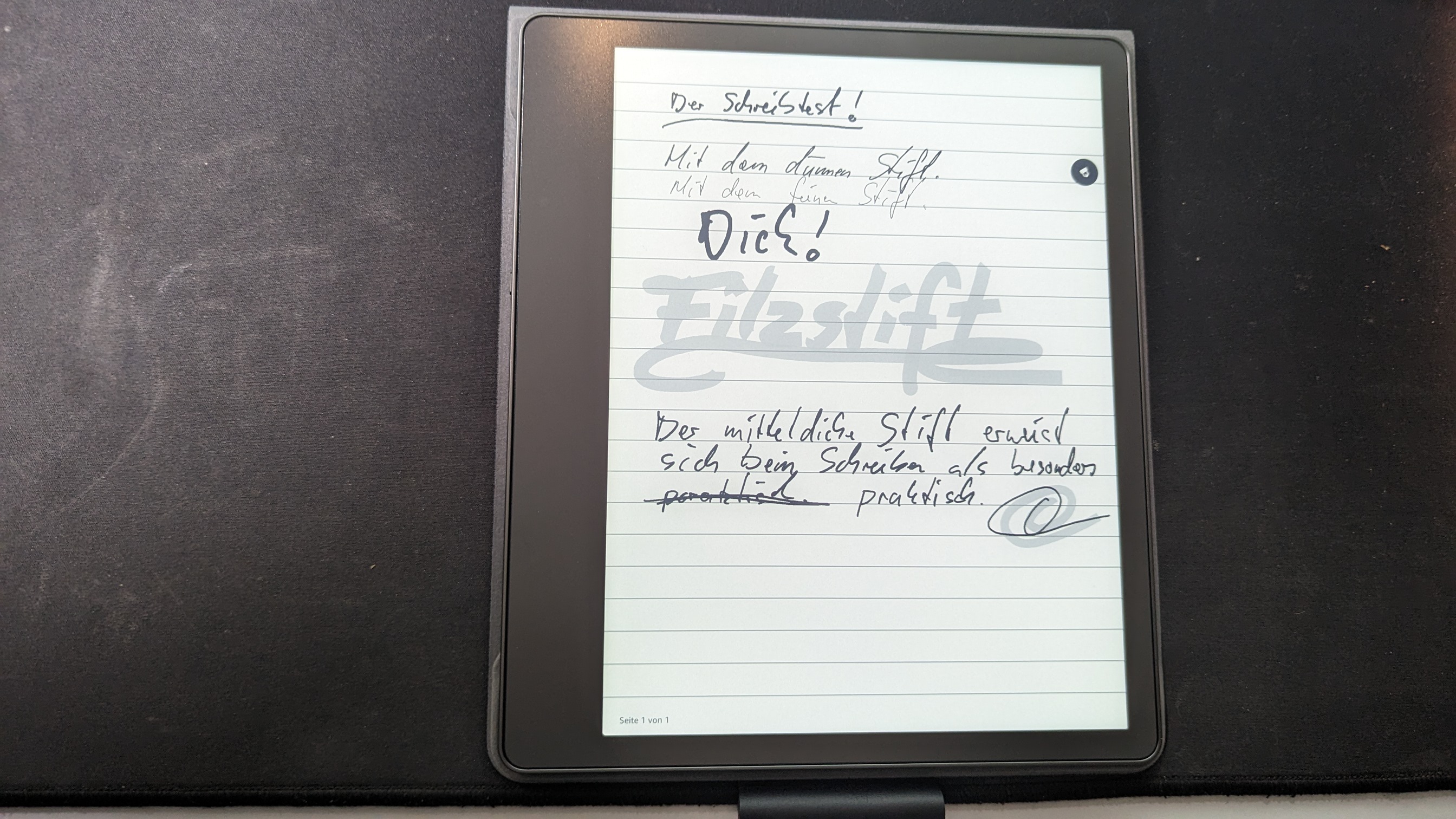 Dabei kann der Nutzer zum Beispiel in Büchern handschriftliche Notizen anlegen. Oder er erstellt ein Notizbuch aus verschiedenen Vorlagen und verfasst handschriftlich Texte. Auch einfache Zeichnungen sind möglich. Hier ist die Anpassung Stift und Marker in verschiedenen Dicken beschränkt. Das Schreiben und Zeichnen selbst gelingt anstandslos. Im Test erkennt der Kindle Scribe den Stift steht optimal. So kommt ein beinahe genauso gutes Schreibgefühl auf wie beim Nutzen eines klassischen Stifts auf Papier. Damit ist er etwa dem Premium Kindle Oasis (Testbericht) deutlich überlegen.