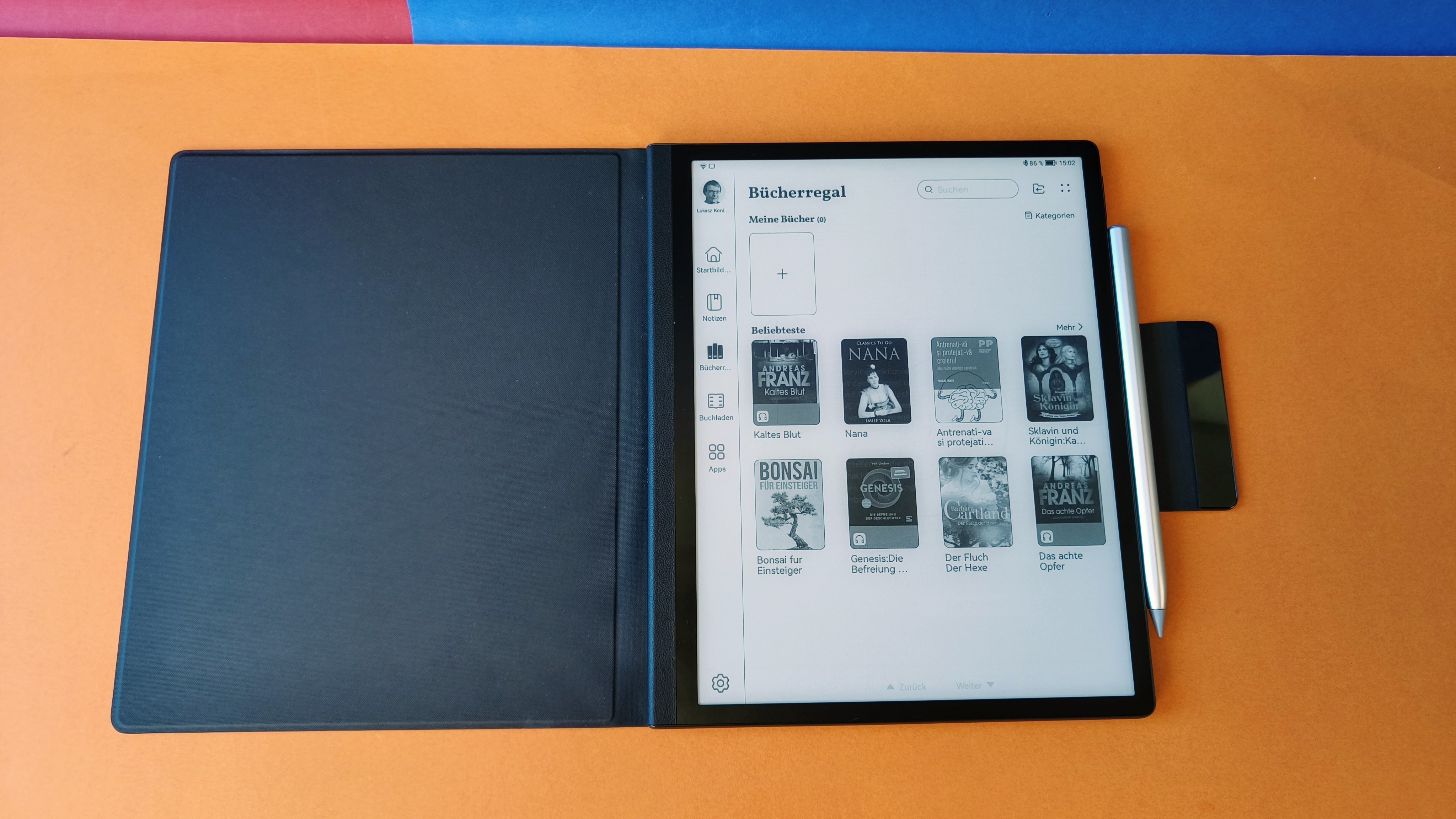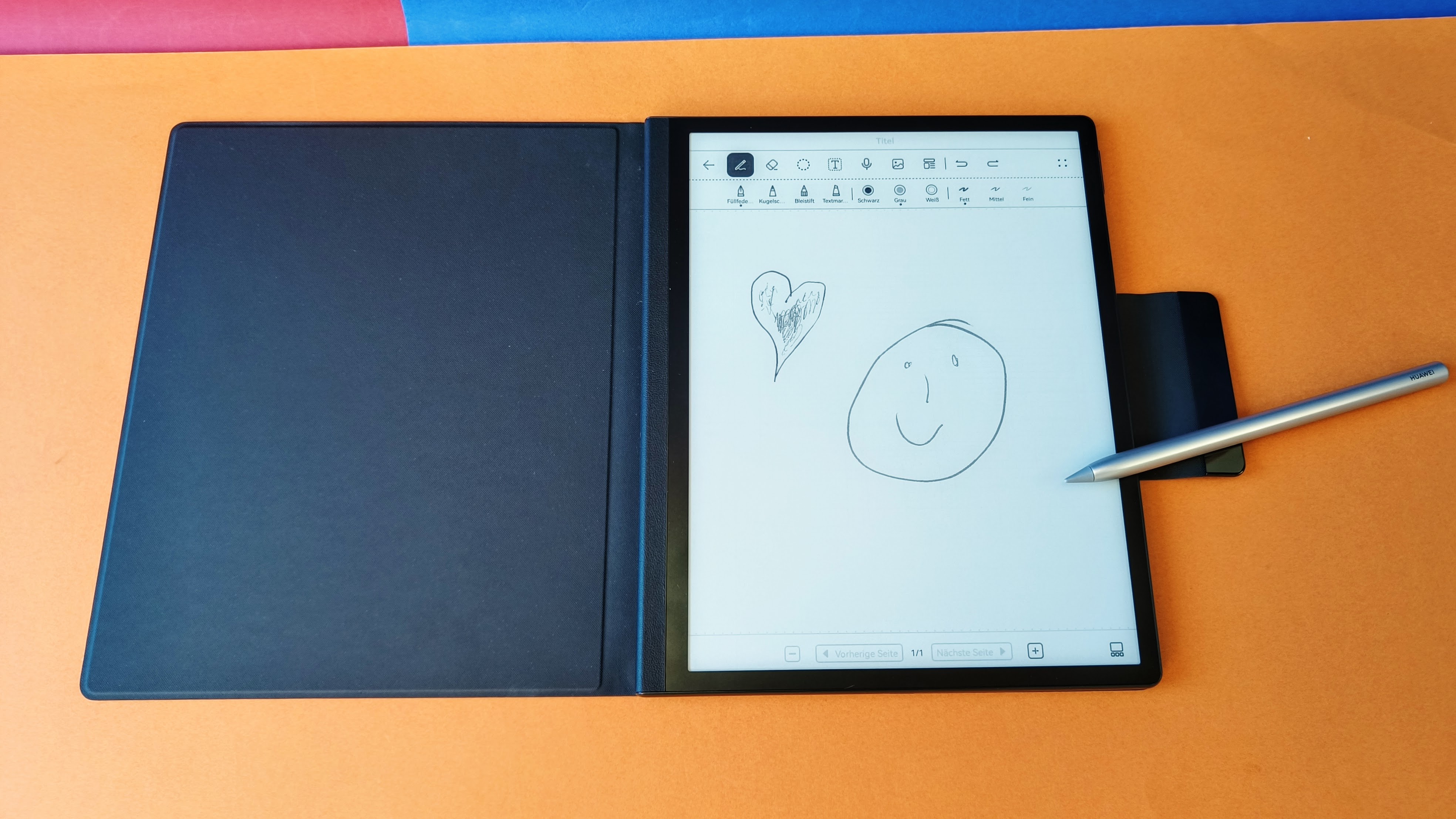 Allerdings kränkelt das MatePad Paper an zwei Dingen: Der Bildschirm baut sein Bild nur sehr verzögert auf – einer der Nachteile der E-Ink-Technologie. Das Blättern durch Menüs ist dadurch enorm langsam und fühlt sich an wie die Ewigkeit. Die Darstellung ist zudem nur in Monochrom in 16 Tönen möglich. Zwar erkennt der Stift präzise, wo man ihn ansetzt. Schnell zeichnen oder schraffieren gelingt damit aber nur bedingt. Dafür ist der Widerstand gefühlt zu stark und die Eingabe doch zu ungenau. Da hier auch nur wenige Graustufen verfügbar sind, eignen sich solche Geräte primär zum Schreiben oder groben Skizzieren. Zudem nutzt das Gerät Harmony OS ohne Zugang zu Google-Diensten. Dafür kann Huawei zwar nichts, schließlich ist das die Folge des US-Banns gegen das chinesische Unternehmen, trotzdem schränkt es die Möglichkeiten erheblich ein. Die einzige hierzulande relevante App war zum Testzeitpunkt Tolino. Mit der Anwendung können E-Books als epub- oder PDF-Datei gelesen werden, zudem ist es möglich, Bücher aus öffentlichen Büchereien auszuleihen (sofern diese daran teilnehmen). Notizen können dann per Cloud synchronisiert werden – allerdings nur mit Huawei-Lösungen.