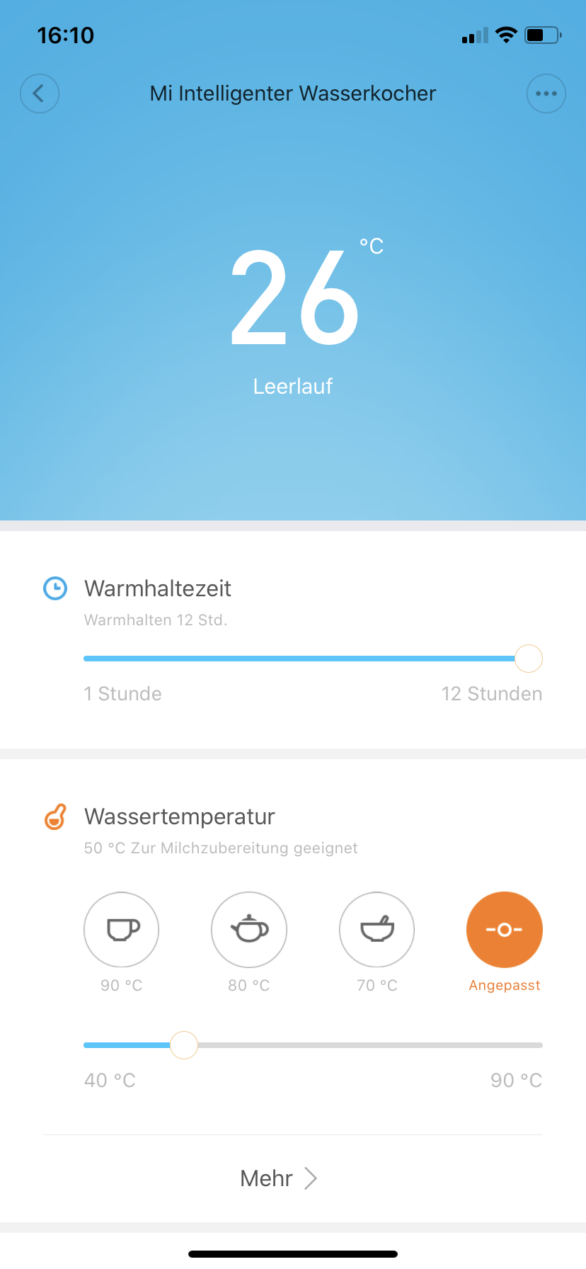 Nach der Verbindung von App und Wasserkocher wählt man auf dem Smartphone Wassertemperatur und Warmhaltezeit. Für die Wassertemperatur bietet die App fünf Temperaturstufen oder die manuelle Regulierung in 5-Grad-Schritten von 40 bis 90 Grad. Bis das Wasser seine Maximaltemperatur hat, braucht der Kocher rund 3 Minuten. Mit der Warmhaltefunktion bleibt das Wasser bis maximal 12 Stunden auf der gewünschten Temperatur. Wirklich sinnvoll erscheint uns ein so langer Zeitraum nicht, aber für das Warmhalten von Babynahrung ist die Funktion beispielsweise durchaus brauchbar. Der Wasserkocher lässt sich zudem mit dem Apple Homekit verbinden. Hierzu benötigt man den Aqara Hub. Wie die Anbindung damit funktioniert, erklärt unser Ratgeber: Gut und günstig? Smart-Home Xiaomi Aqara im Test .