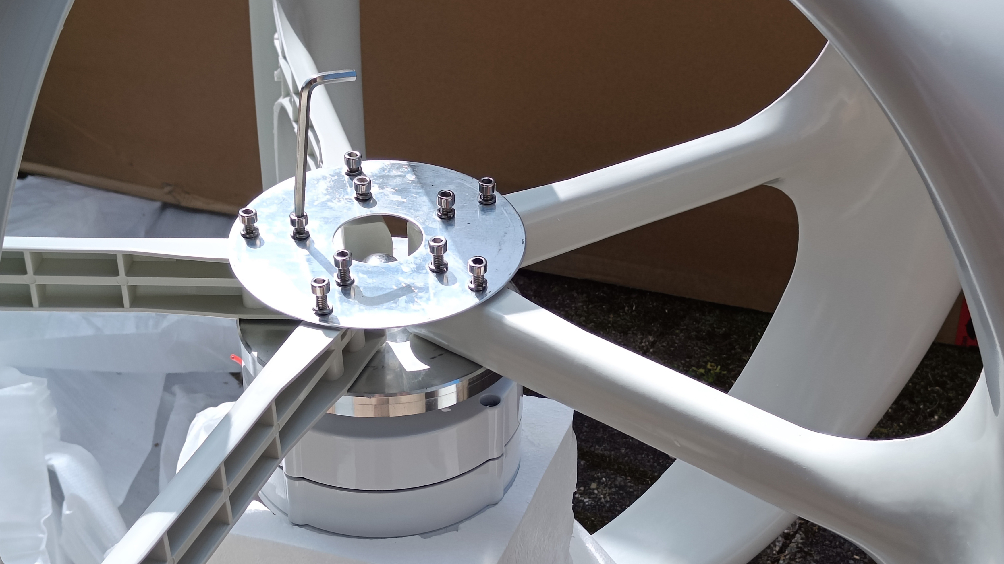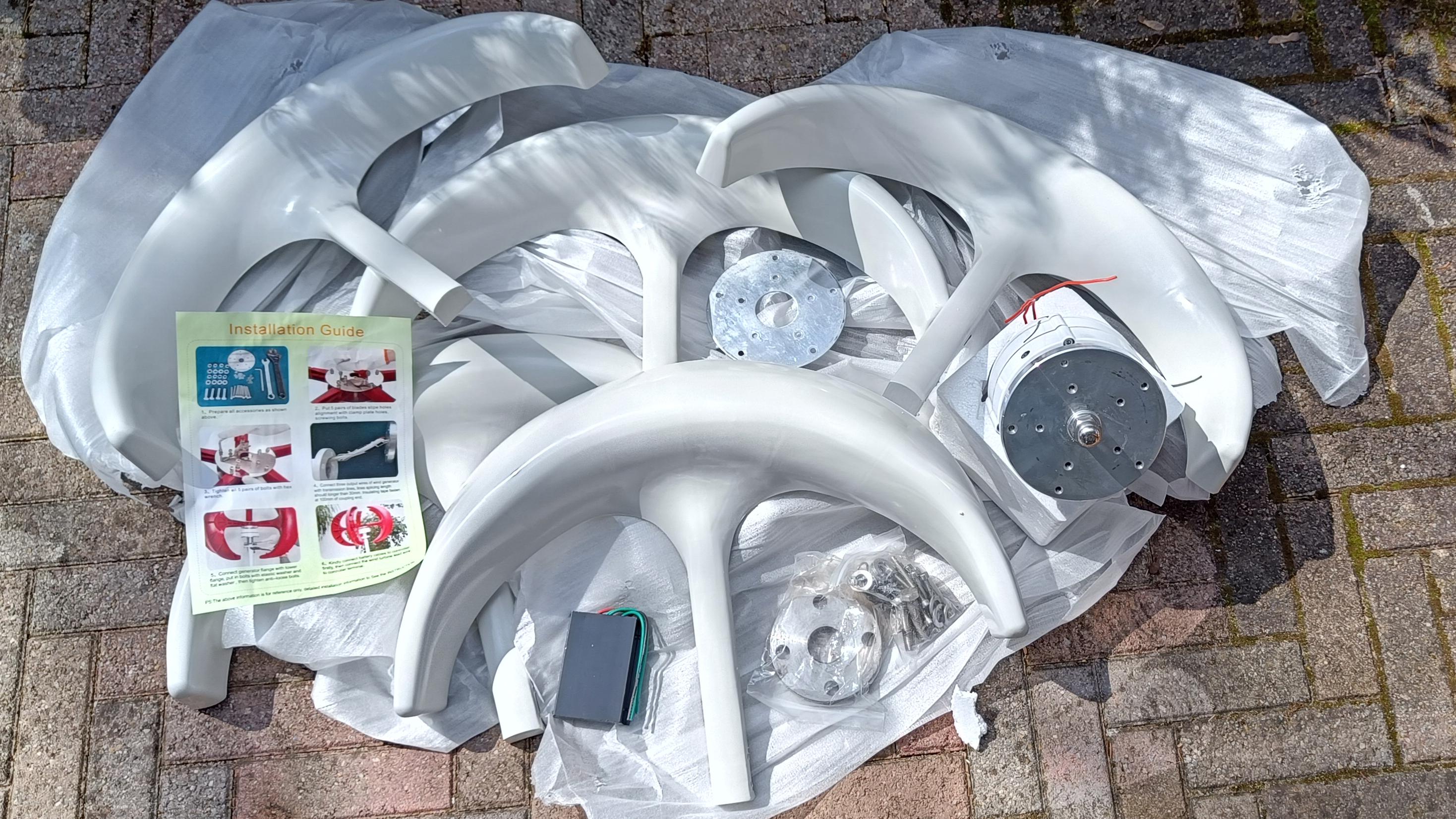 Unser Testgerät, eine Windmühle mit 12/24 Volt und einer maximalen Leistung von angeblich bis zu 400 Watt und einem passenden Inverter, gibt es für rund 183 Euro bei Banggood. Das Paket beinhaltet eine sehr grobe, aber immerhin bebilderte Anleitung, die Windrad-Grundeinheit mit Motor und Rotor-Befestigungsplatte, eine Tüte mit Schrauben und zwei Metallplatten, Muttern und Innensechskantschlüssel, sowie fünf Rotorblätter aus Kunststoff und einen kleinen Inverter ohne jegliche Beschriftung.