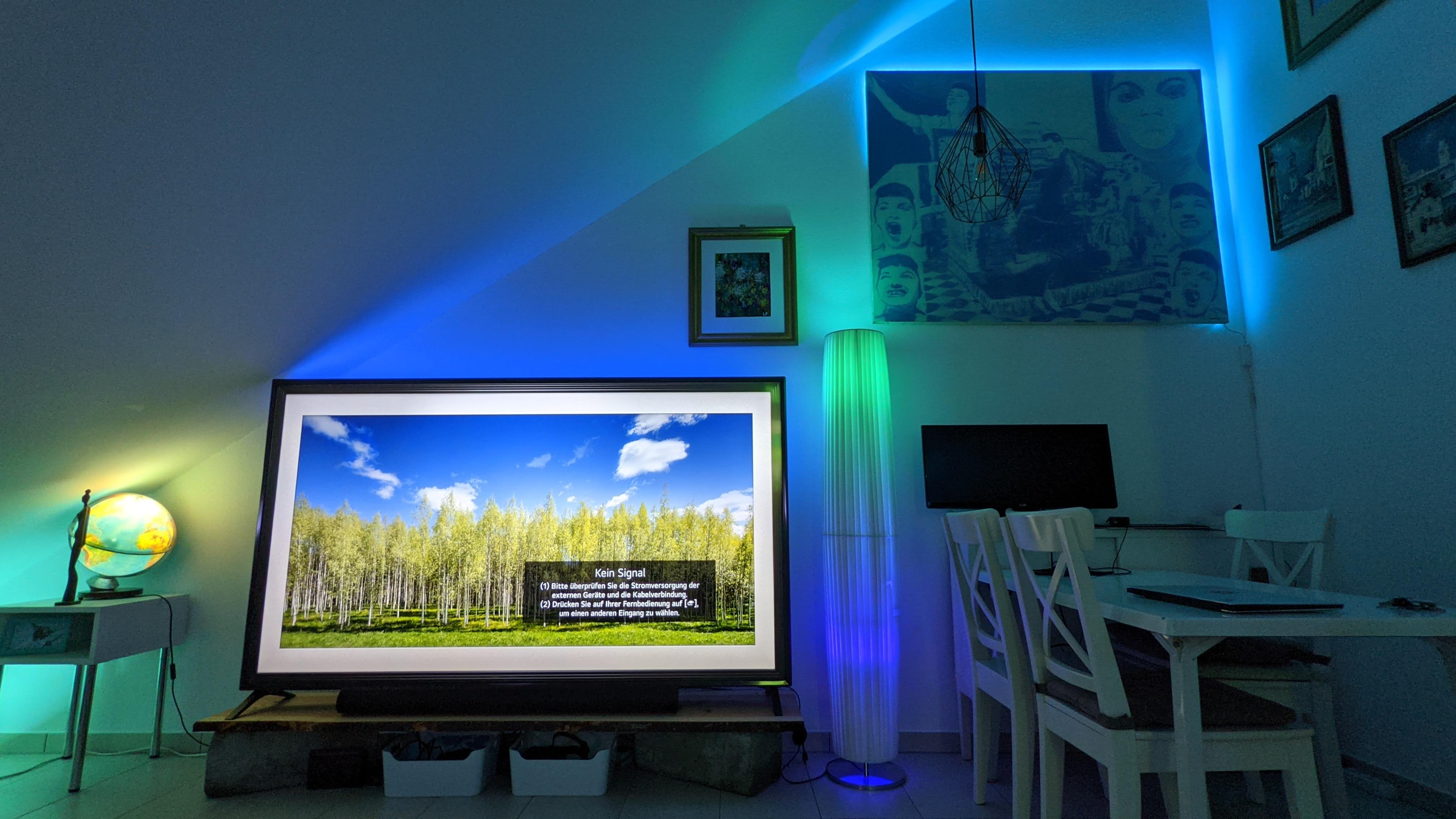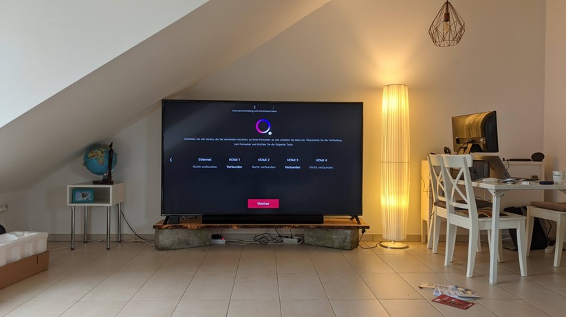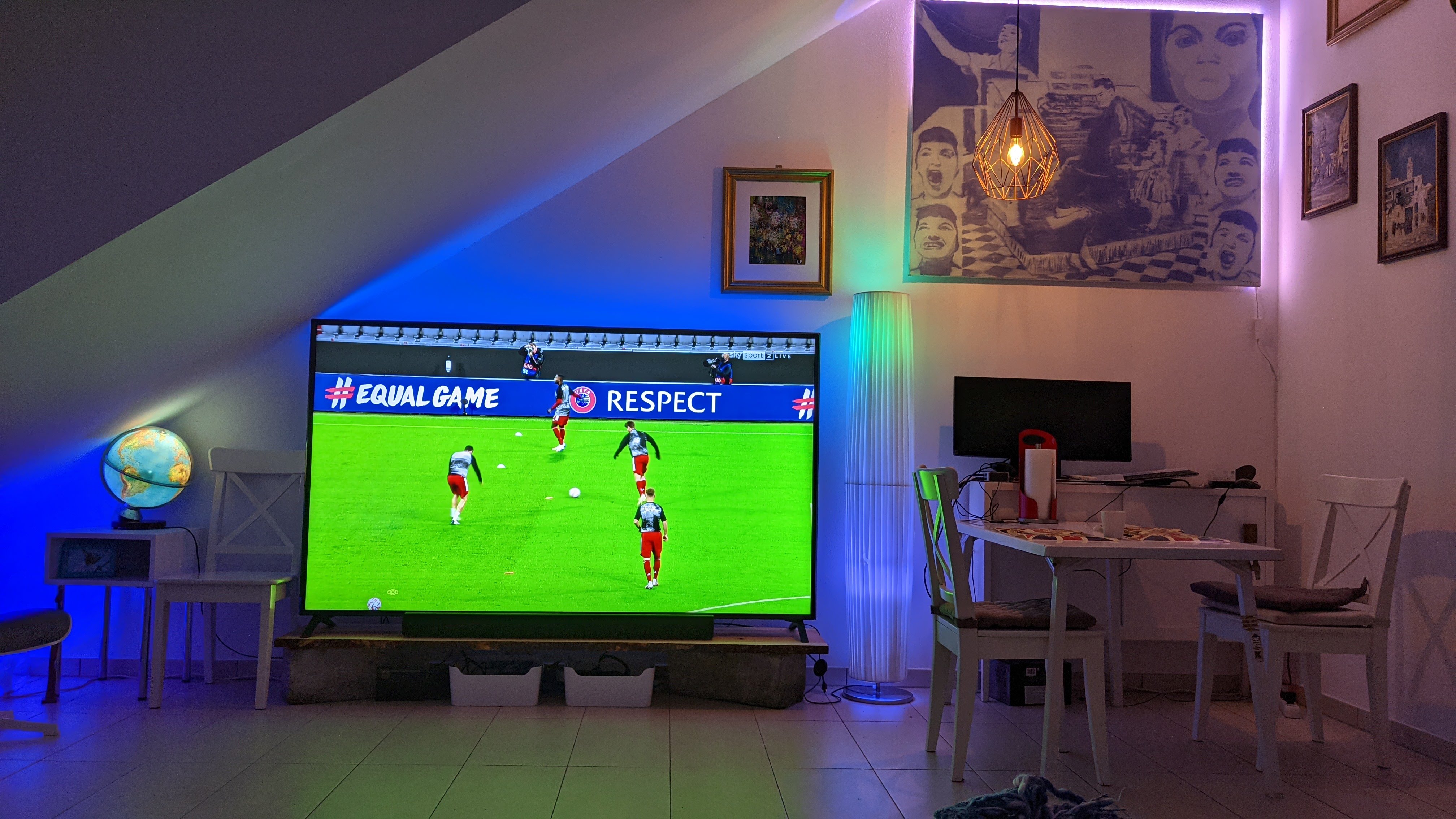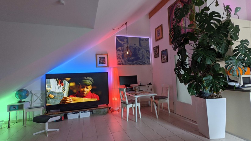 Wer sich überlegt, einen derart ausufernden TV zu kaufen, braucht Platz. Hier ist entsprechende Vorplanung gefragt. In unserem Fall sollte der 86-Zoll-Fernseher seitlich an eine Dachschräge passen, aber auf der anderen Seite noch genügend Platz für den Esstisch lassen. Dafür durfte das Sideboard nicht höher als 25 Zentimeter sein. Die Lösung: Zwei Betonsteine vom Bauhof mit einem darüber liegendem zwei Meter langem Brett aus dem Baumarkt. Darauf hat der Fernseher mit seiner Länge von 194 Zentimetern geradeso Platz. Mit Standfüßen ist er 118 Zentimeter hoch und 33 Zentimeter tief.
