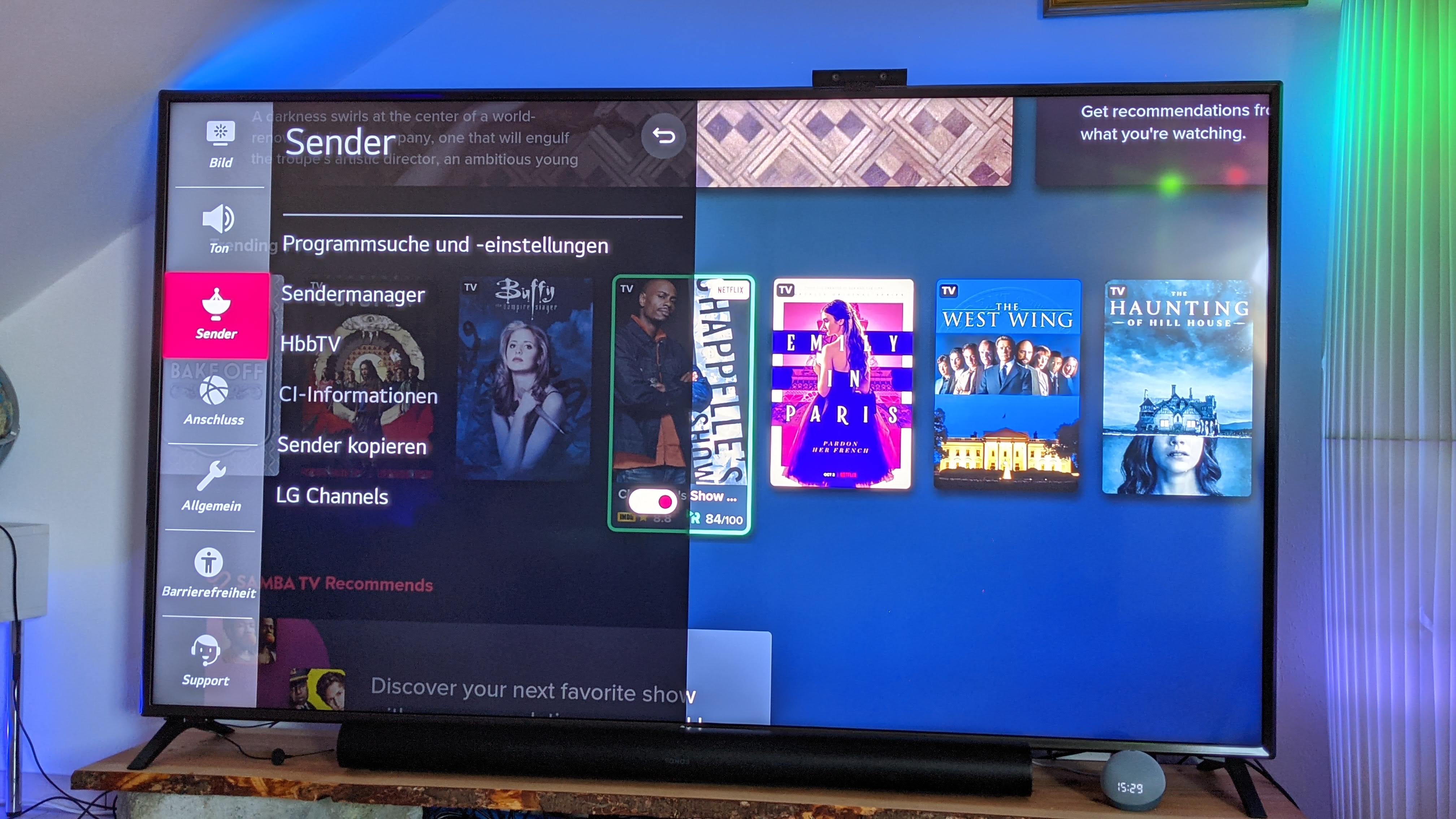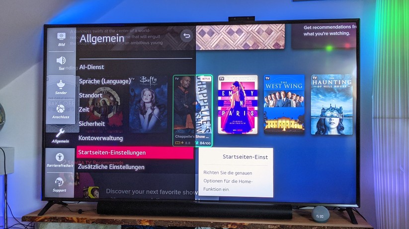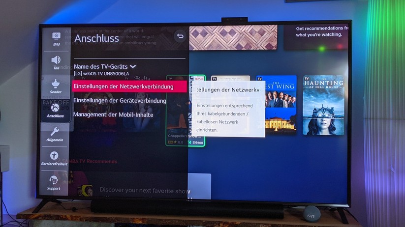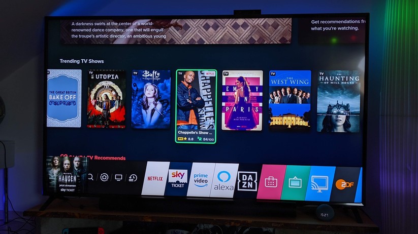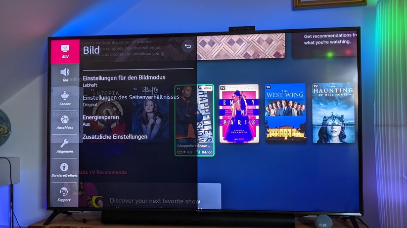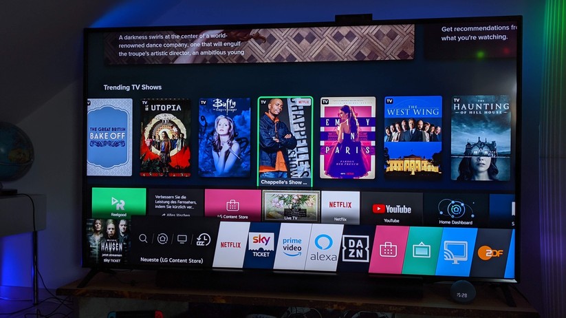 LG nutzt für beinahe alle seine Fernseher WebOS, so auch im LG 86UN85006LA. Installiert ist Version 5.1. Das Betriebssystem legt nach dem Drücken der Home-Taste auf der Fernbedienung seine Menüs in Kacheln am unteren Bildschirmrand über den eigentlich Fernsehinhalt. Das sieht schick aus und die Navigation funktioniert schnell und selbsterklärend. In den Kacheln sind die wichtigsten Apps bereits vorinstalliert. Dazu gehört Netflix und Prime Video, für beide Streaming-Dienste gibt es zudem eine eigene Taste auf der Fernbedienung. Wer will, kann den Amazon Sprachassistent Alexa mit einem längeren Druck auf die Prime-Video-Taste aktivieren. Außerdem gibt es unter anderem Sky Ticket, Dazn, ZDF, Youtube, Disney+ (Ratgeber) , Apple TV, Rakuten, Joyn und einen Webbrowser. Über den LG Content Store können weitere Apps nachinstalliert werden. Darunter Google Play Filme, Reelgood und Sky Q. Außerdem findet man dort jede Menge Spiele-, Fitness-, Streaming- und Unterhaltungs-Apps. Die Auswahl kann nicht annähernd mit der im Google Playstore mithalten. Dennoch ist hier über die Jahre ein beachtliches Portfolio gewachsen, die wichtigsten Streaming-Dienste sind abgedeckt.
