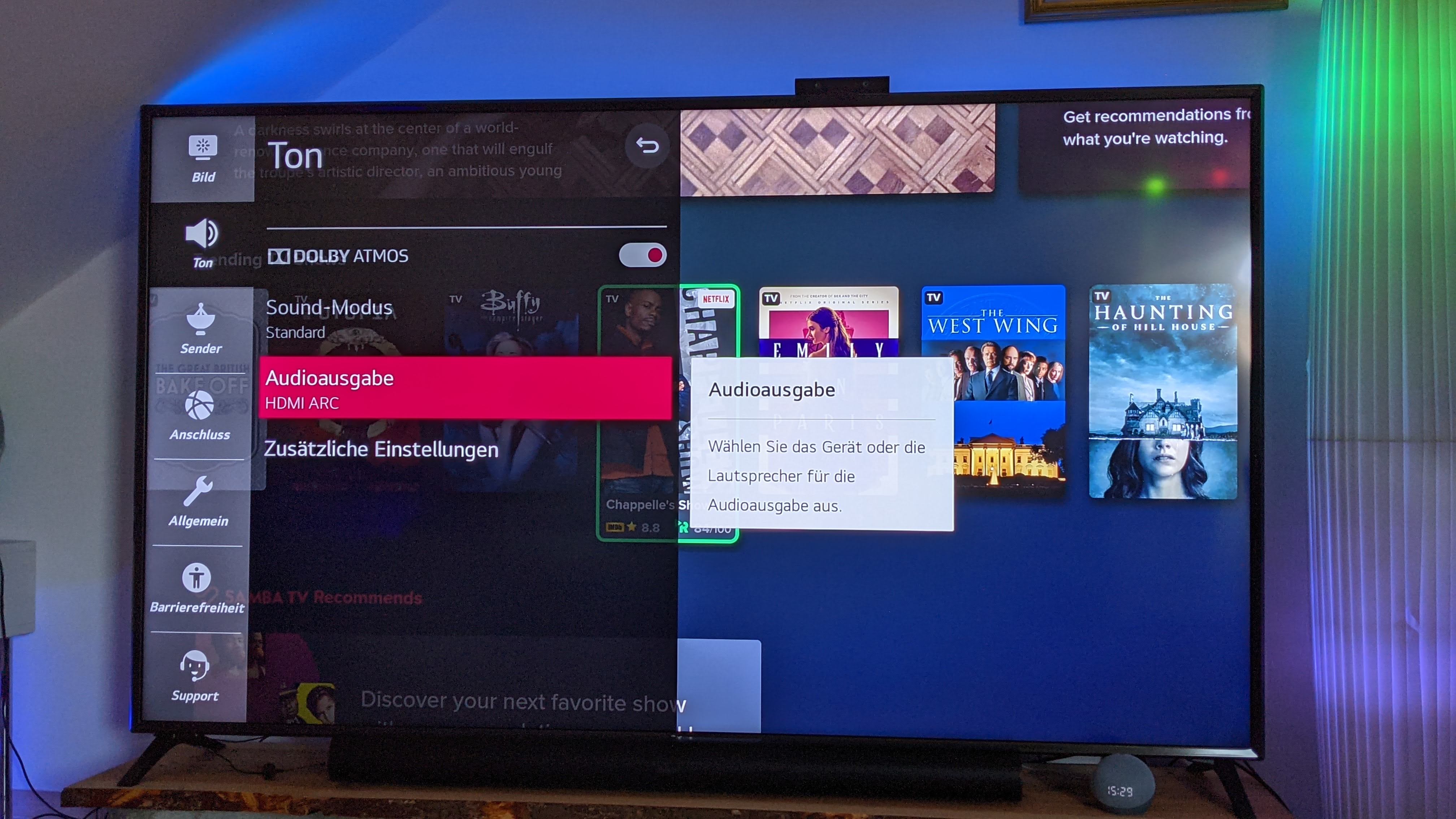 Für den Test der Dolby-Atmos-Funktionalität schließen wir die Premium-Soundbar Sonos Arc (Testbericht) am HDMI-2.1-Port mit eArc an. Stimmt nun auch noch der Zuspieler und liefert ein unkomprimiertes Dolby-Atmos-Signal, schwirrt der Klang dem Zuhörer nur so um die Ohren. Zwar ist der Unterschied zu komprimiertem Dolby Atmos nicht riesig, aber für die meisten durchaus deutlich.