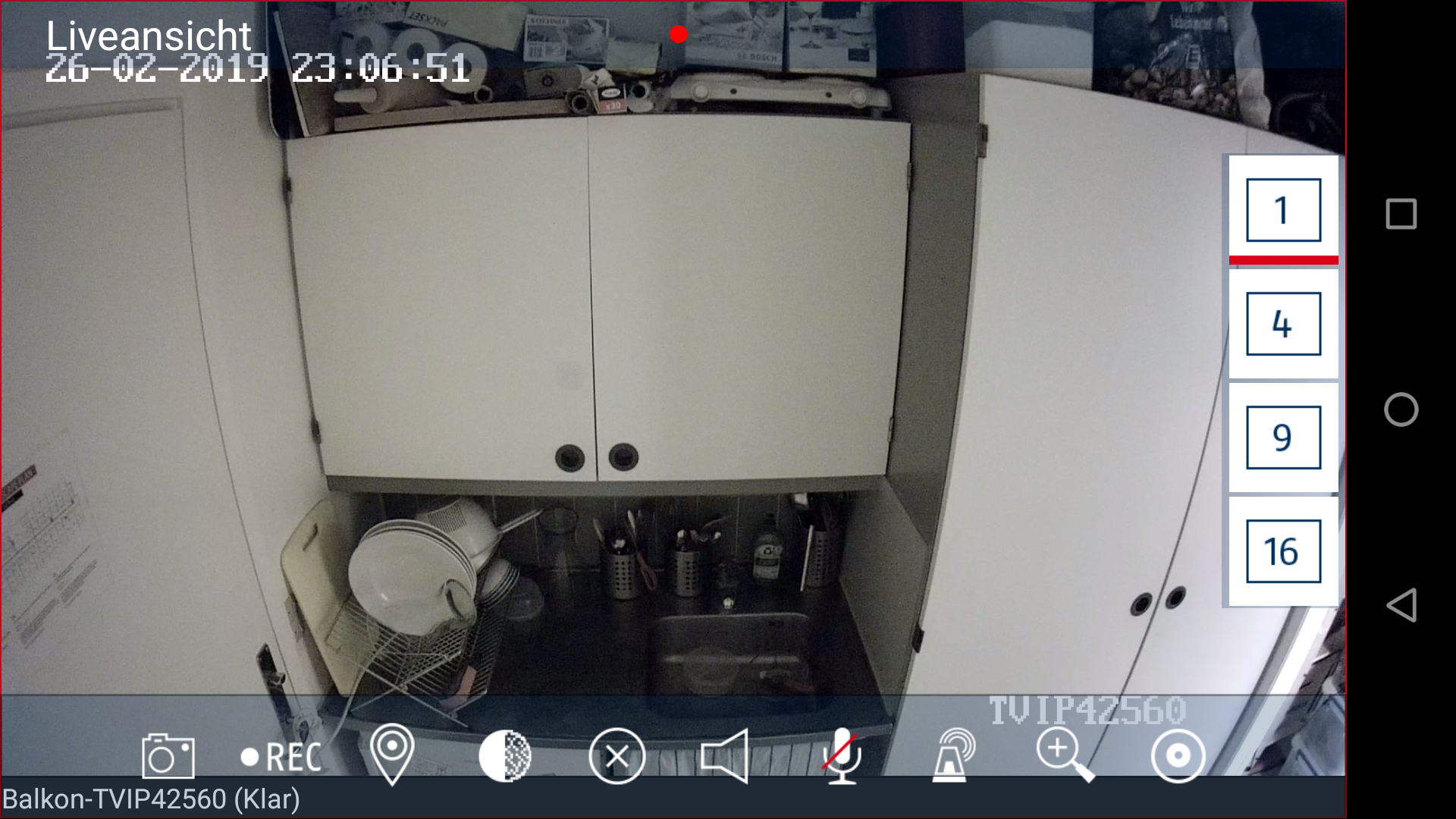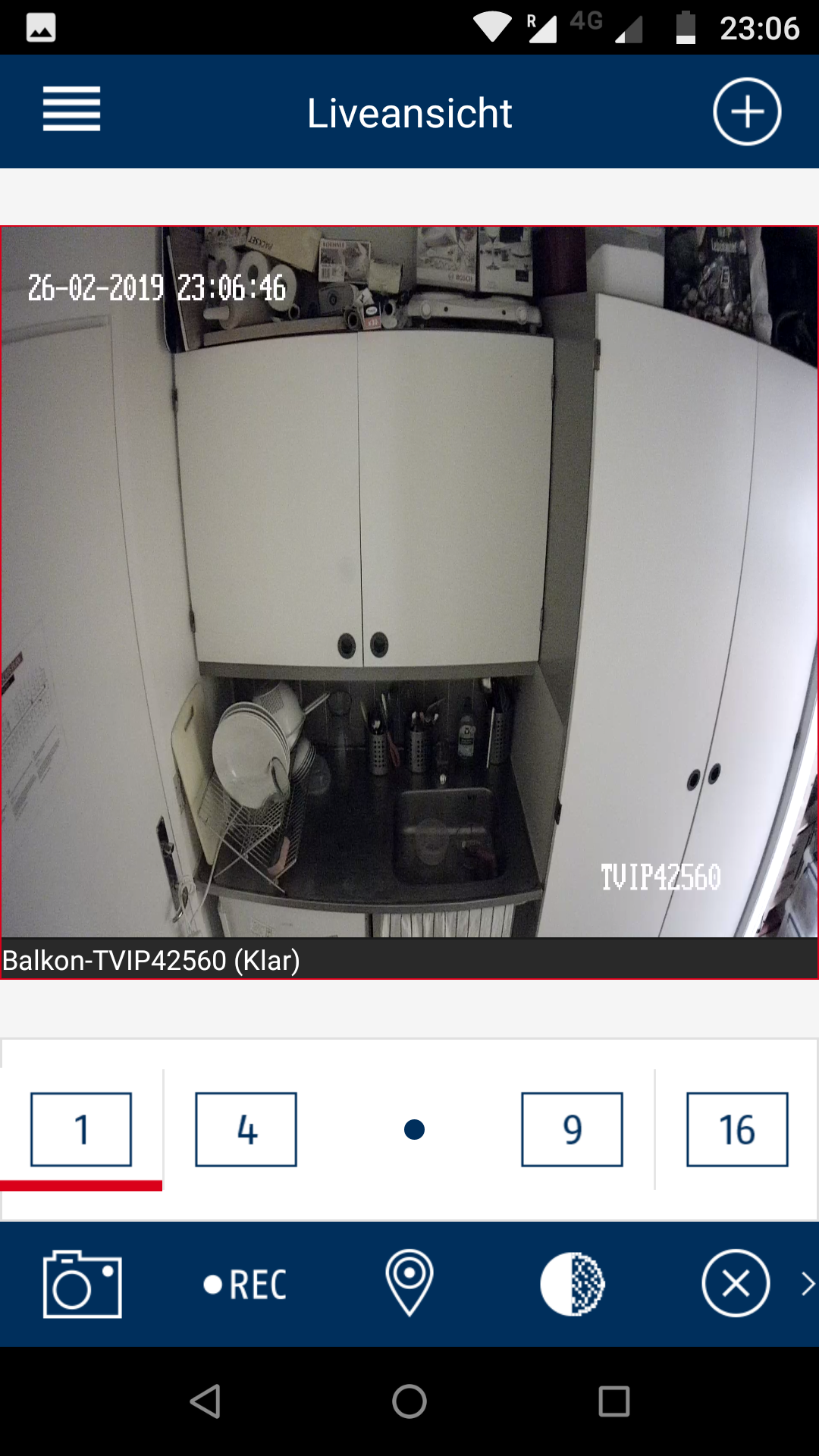 Über die App kann man bis zu 16 Kameras hinzufügen, Videos aufzeichnen, Screenshots machen und sich die Livebilder anzeigen lassen. Alle Aufnahmen der App werden auf dem Mobilgerät gespeichert, nicht auf dem IP-Rekorder. Funktionen wie der Digitalzoom sind sehr nützlich. Nützlich wäre auch eine Hilfefunktion in der App. Es ist nicht immer auf Anhieb klar, wofür die vielen schicken Buttons denn nun alle gedacht sind. Gemeinerweise zeigt die App nur manchmal an, wenn die Hardware ein bestimmtes Feature nicht unterstützt. Einen fehlenden Alarmausgang der Kamera meckert die App zutreffenderweise an, wenn man auf den Alarmknopf drückt. Eine nicht unterstützte PTZ-Funktion (Kameraschwenk via App) wird nicht angezeigt. Stattdessen präsentiert das Liveview ganz unschuldig grüne Pfeile, mit denen sich aber bei den Testkameras ohne PTZ nichts schwenken lässt.