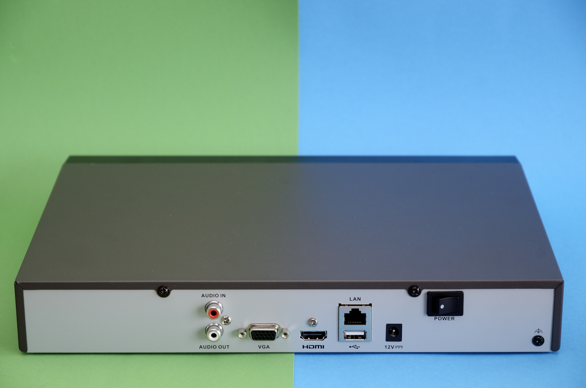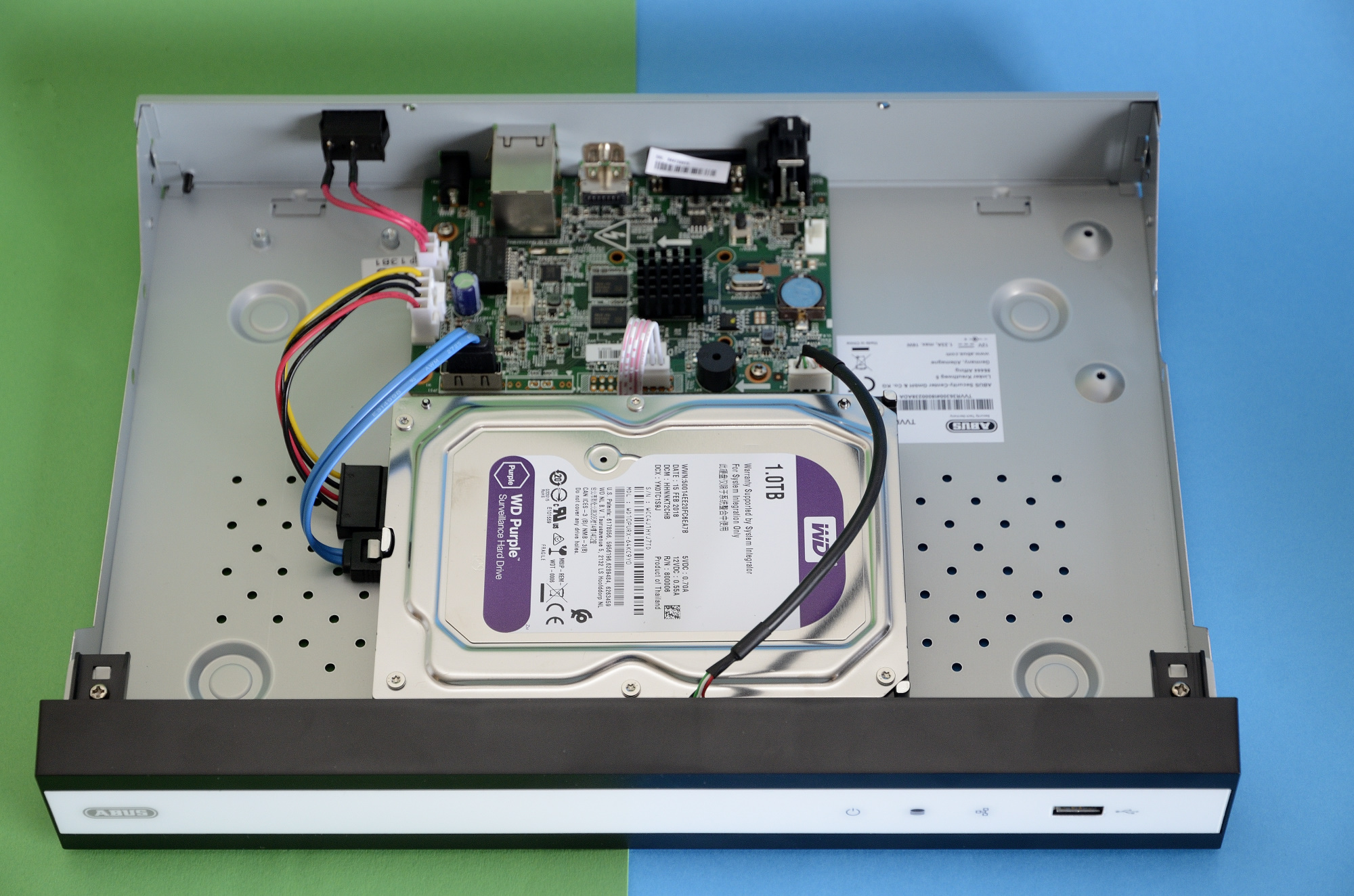 Die mitgelieferte Festplatte ist eine 1 TByte Western Digital Purple. Diese sind für den Dauerbetrieb in Überwachungssystemen ausgelegt. Der IP-Rekorder verfügt über einen Ein-/Ausschalter an der Rückseite. Zum Energiesparen ist der Schalter nicht geeignet, das Gerät wird über ein externes Netzteil mit Strom versorgt, obschon im geräumigen Gehäuse genug Platz für ein integriertes Netzteil gewesen wäre.