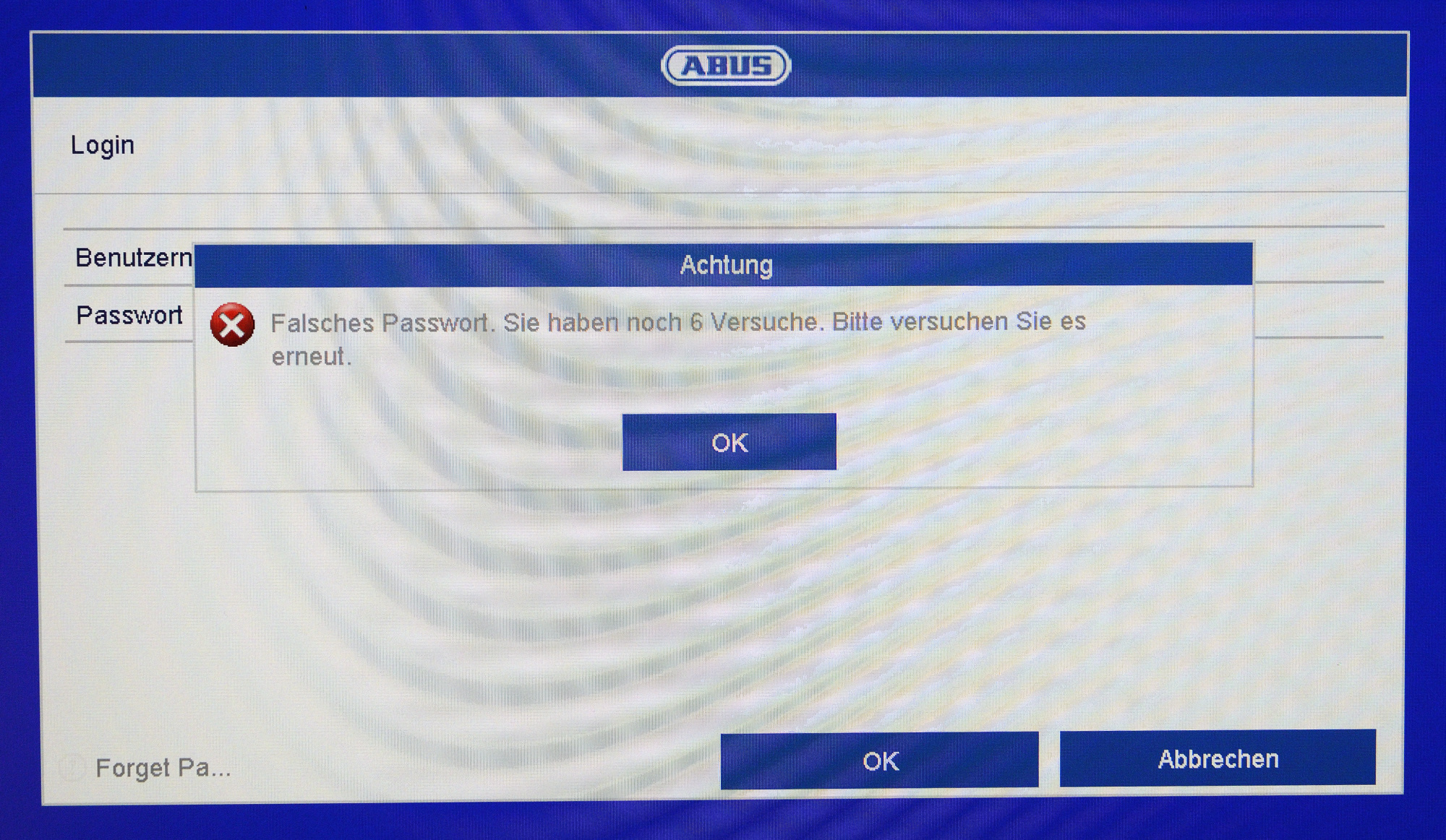 An den IP-Rekorder kann man per USB eine Tastatur anschließen, es nützt nur leider nichts. Im Test wurde sie nicht erkannt. Das Handbuch empfiehlt nur die Bildschirmtastatur, welche mit der Maus gesteuert wird. Abus liefert eine gebrandete Funkmaus mit, wir haben eine kabelgebundene USB-Maus verwendet. Die Passworteingabe per Maus bereitet wenig Freude. Speziell bei den von der GUI geforderten komplexen und langen Passwörtern ist es umständlich und zeitraubend. Weil das eingegebene Passwort nicht einmal auf Wunsch im Klartext angezeigt werden kann, ist die Gefahr von Vertippern groß. Da heißt es Konzentration bewahren: Nach 7 Fehlversuchen ist das Gerät nämlich dauerhaft gesperrt und man muss den Abus-Support um Hilfe ersuchen.