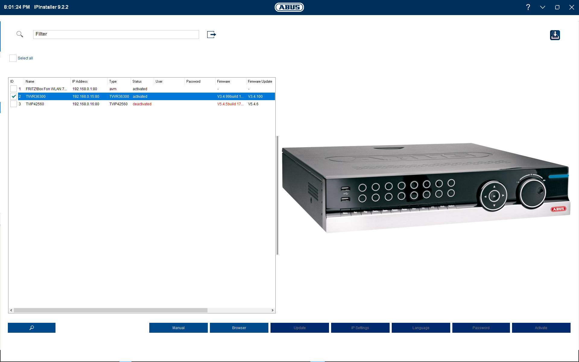 Der von uns getestete Abus IP-Installer ist eine einfach gehaltene Desktop-Software. Im Installer selbst sind nur einige Grundkonfigurationen möglich. Der Zugriff auf Geräte wie die Kameras und den IP-Rekorder erfolgt per Browser, hier ist dann die komplette Benutzeroberfläche der Geräte verfügbar.