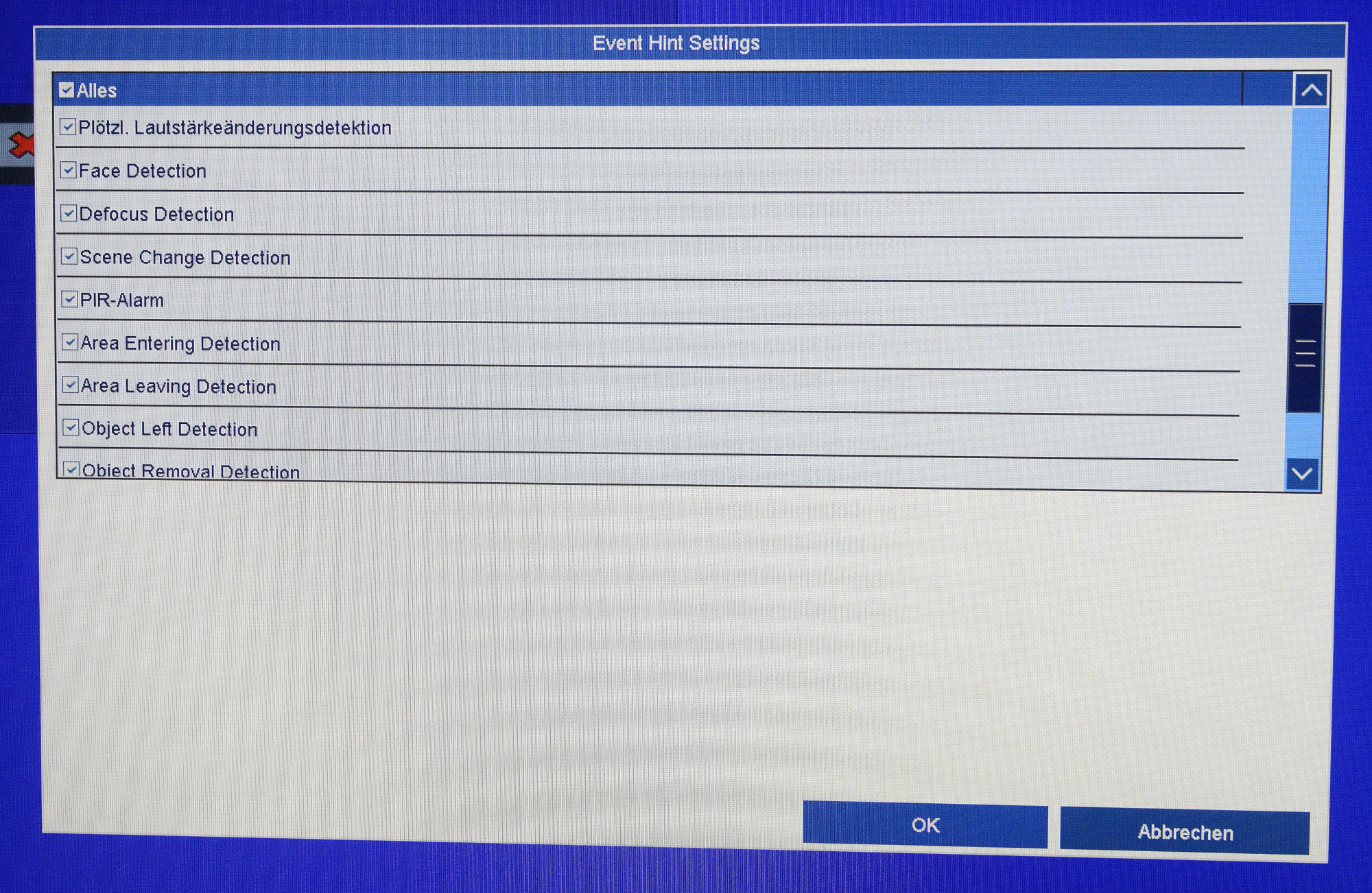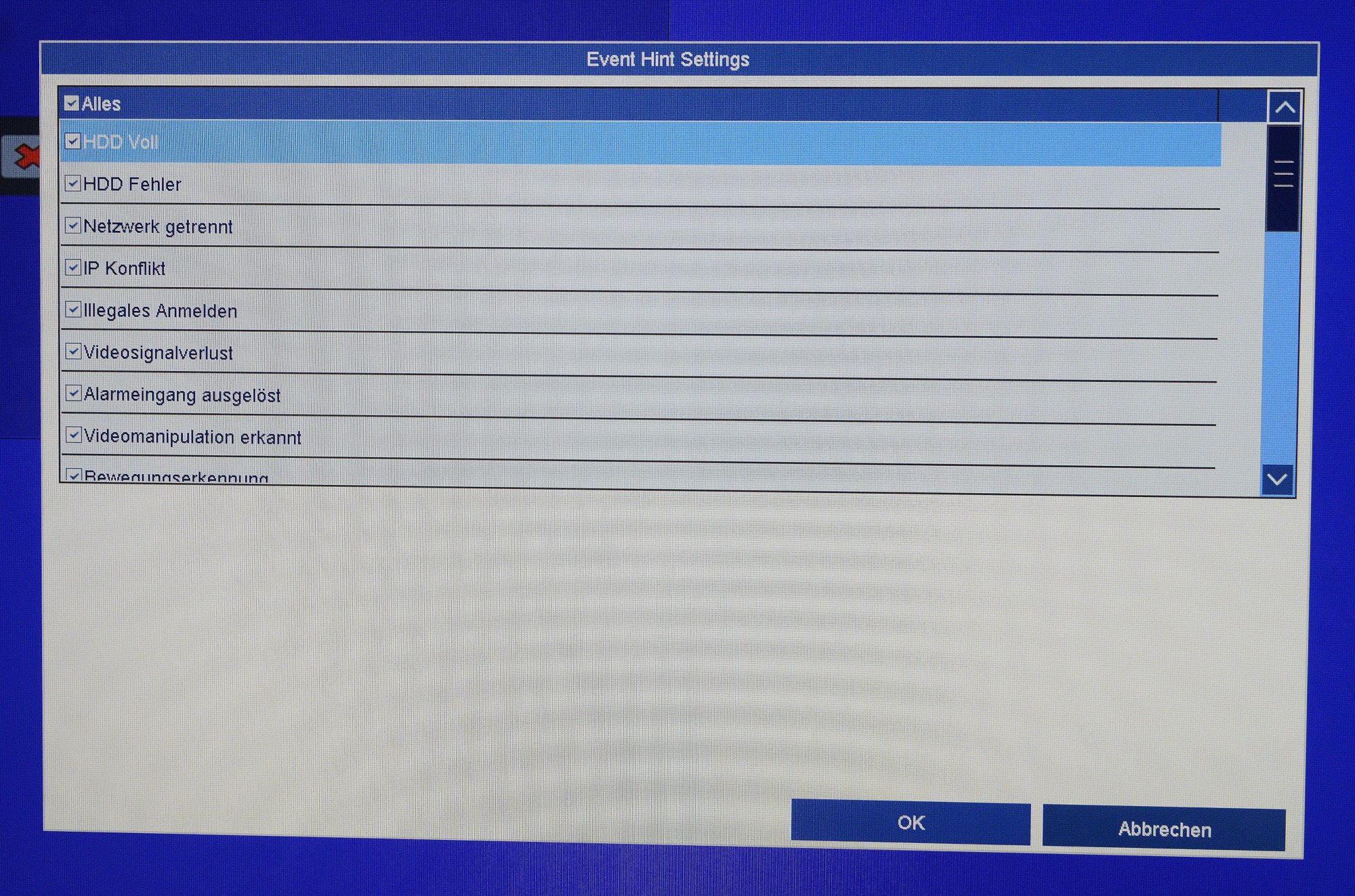 Gut: Wenn die Netzwerkverbindung unterbrochen ist, gibt es am Bildschirm sofort eine Fehlermeldung. Überhaupt ist das Gerät bei Fehlermeldungen gut aufgestellt. In den „Event Hint“-Einstellungen gibt es eine Vielzahl von Anpassungsmöglichkeiten. Alarmmeldungen kann der Bildschirm beispielsweise ausgeben, wenn jemand einen Raum betritt, wenn er ihn verlässt oder wenn eine Video-Manipulation oder eine Veränderung der Umgebungslautstärke erkannt wird. Abus bietet hier zahlreiche Optionen, die allerdings nicht von jeder Kamera vollumfänglich unterstützt werden.