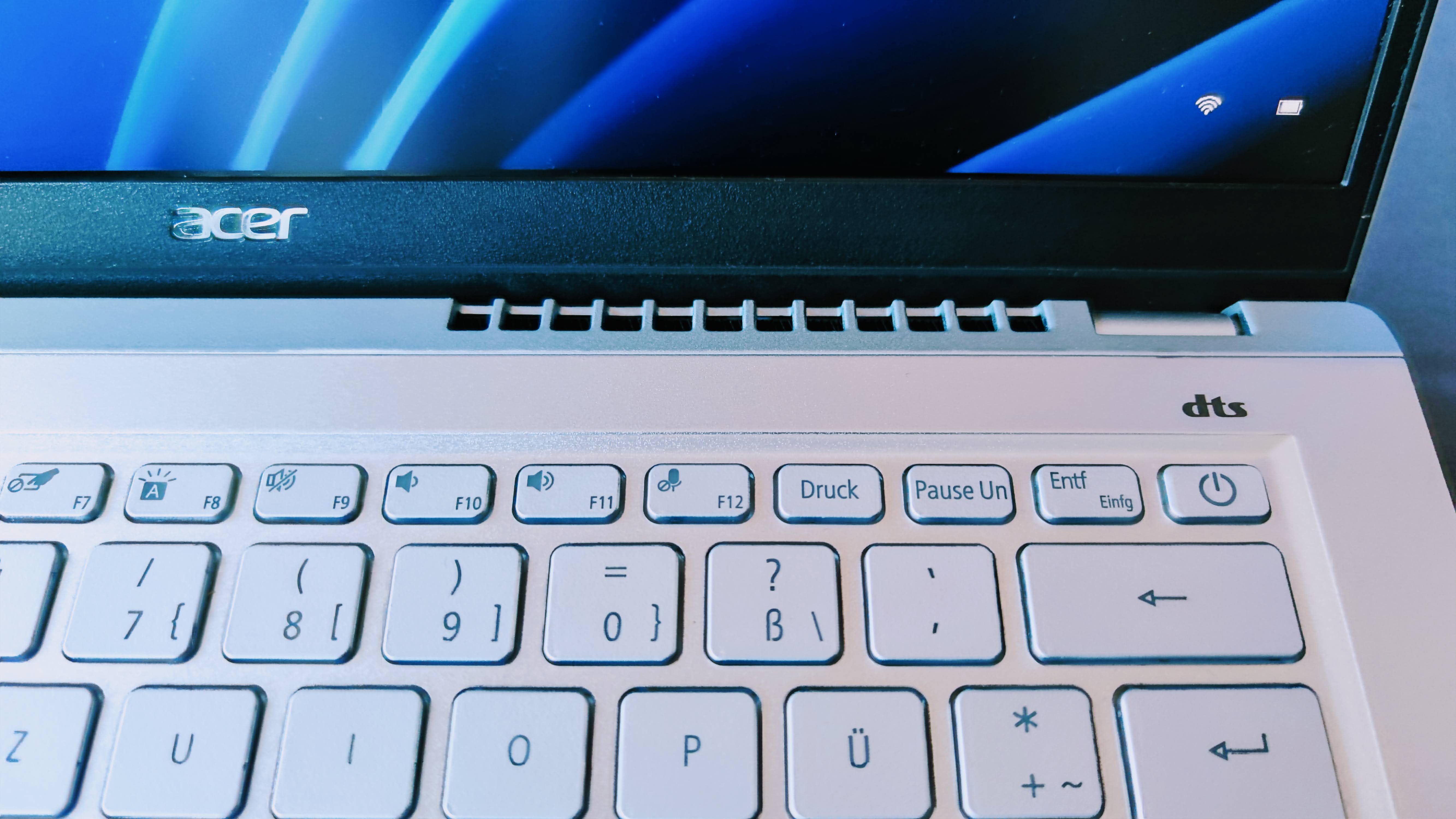 Die Chiclet-Tastatur arbeitet angenehm leise und bietet einen soliden Druckpunkt mit kurzem Hub. Dieser könnte noch eine Spur markanter sein, um ein besseres haptisches Feedback zu liefern. Alles in allem tippt es sich mit dem Swift 3 aber gut und schnell, das Touchpad macht zudem einen verlässlichen Job. Die Beleuchtung der Tasten ist praktisch, wenn man bei wenig Licht mit dem Rechner arbeitet. Allerdings erscheint uns das Konzept für den Tag nicht ganz durchdacht. Da die Tasten selbst silbern sind und die Schriftzeichen in Weiß aufleuchten, kann man bei Tageslicht die Beschriftung kaum noch erkennen. Hier sollte man zum Stromsparen die Beleuchtung lieber deaktivieren, wenn es noch hell ist.