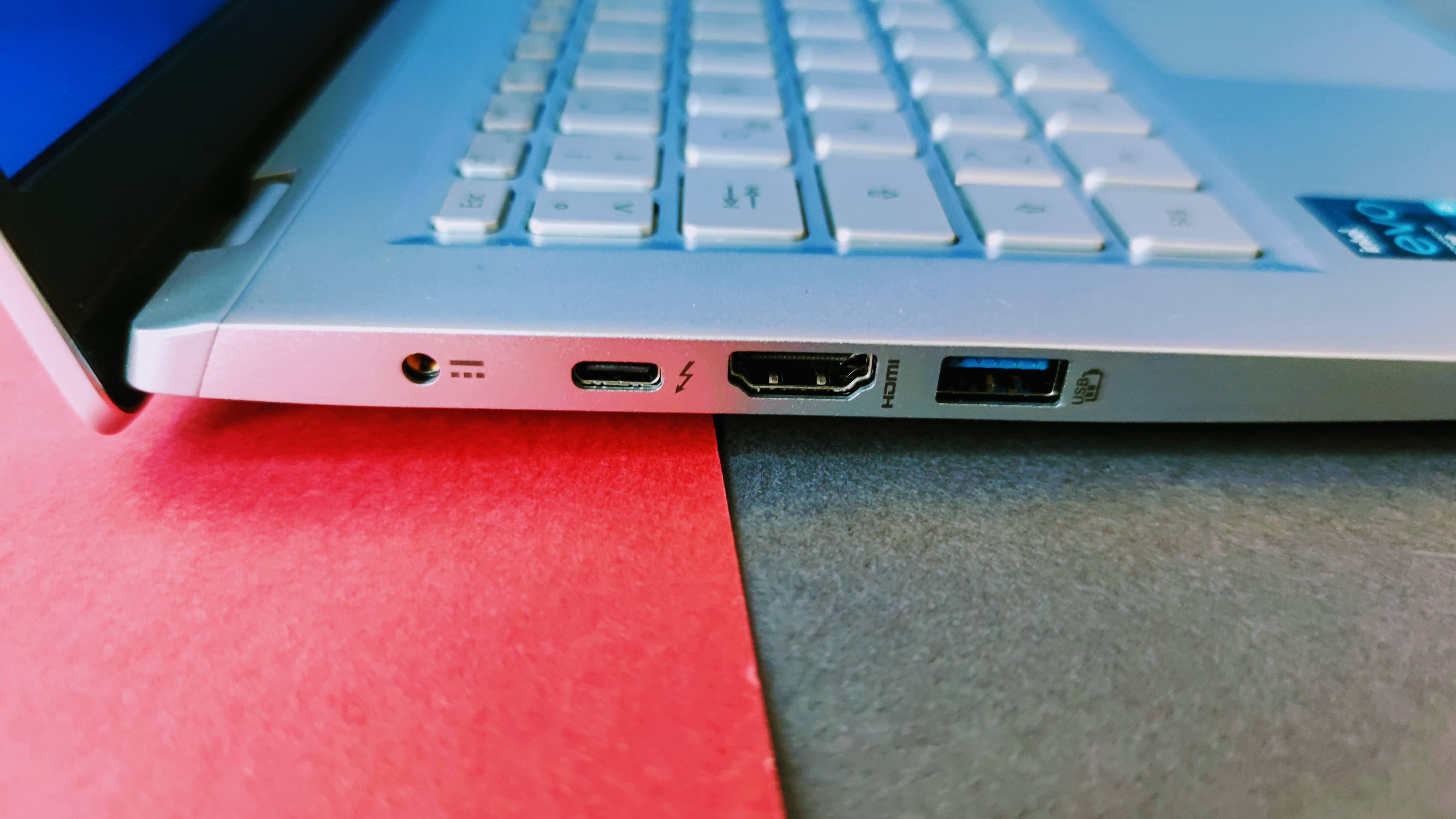 Lobenswert ist das Angebot an Anschlüssen. Neben dem laut Evo-Zertifikat obligatorischen Thunderbolt-4-Steckplatz nach USB-C finden sich zwei USB-A-Slots (USB 3.0) sowie ein HDMI-Anschluss für externe Monitore. Letzteres ist gerade bei kompakten Laptops selten zu finden. Damit verfüg das Gerät über zwei Videoausgänge. Einen Klinkenausgang für Kopfhörer ist ebenfalls an Bord, ein Speicherkartenleser fehlt allerdings.