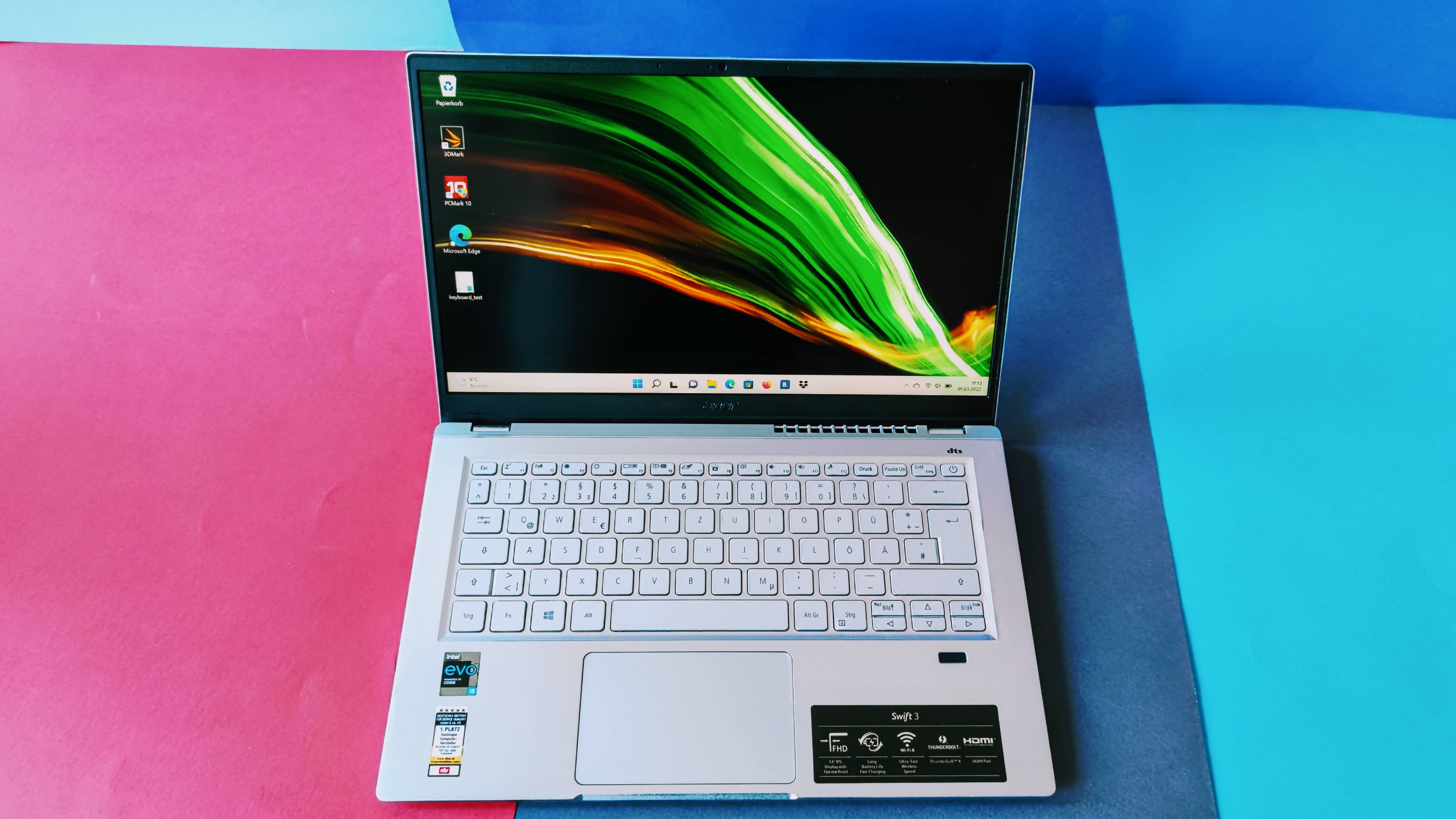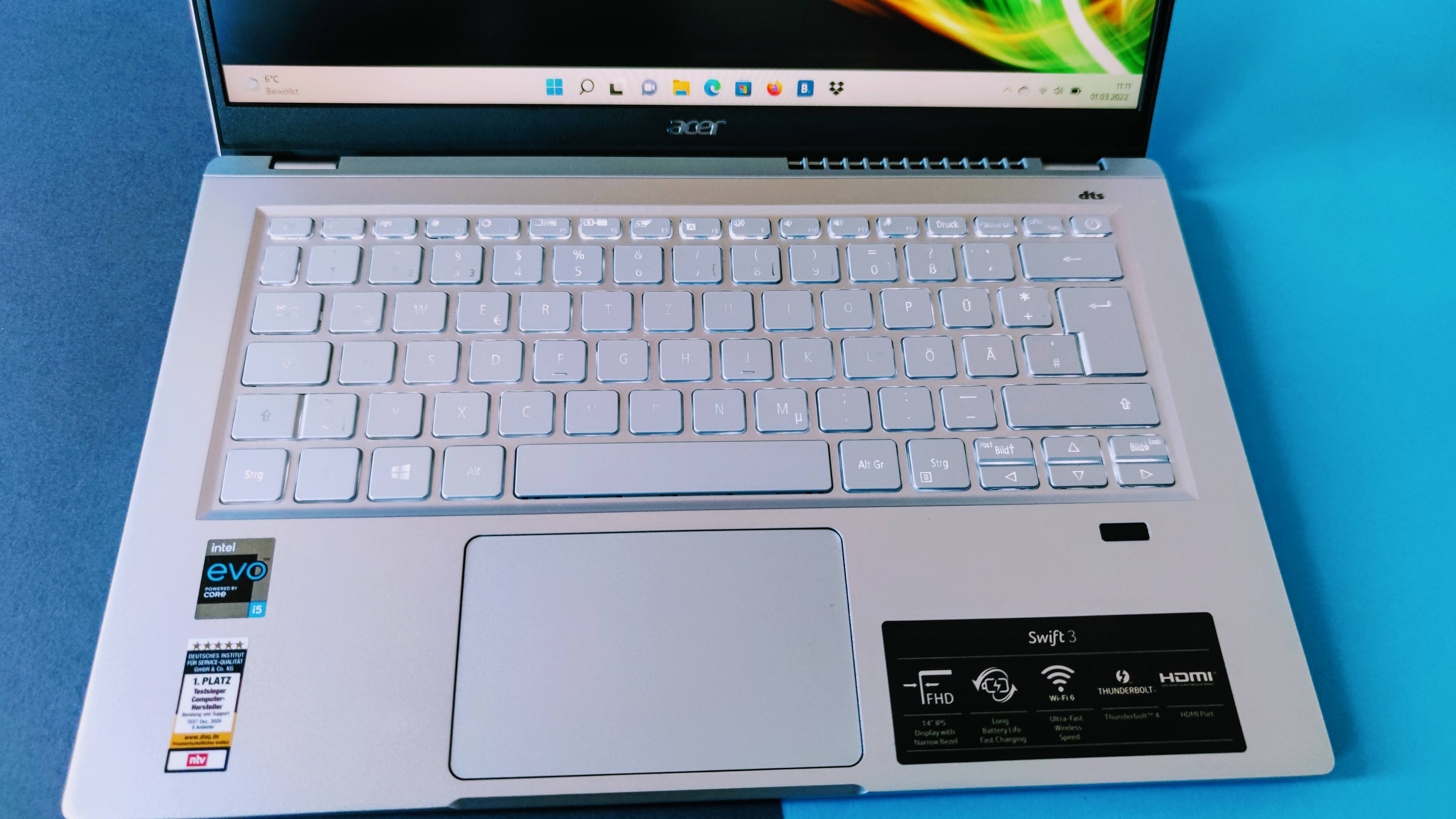 16 GByte RAM sind dem Preis mehr als angemessen, die meisten Konkurrenten in dieser Preisklasse bieten nur 8 GByte RAM. Der Arbeitsspeicher ist fest verlötet und damit nicht erweiterbar, was bei kompakten Rechnern aber üblich ist. Acer liefert das Swift 3 bereits mit Windows 11 aus. Als Datenspeicher nutzt das Acer Swift 3 eine flotte NVMe-SSD mit 512 GByte Speicherkapazität. Beim Benchmark von PCmark erreichten wir damit 2500 Punkte, das ist bisher der beste Wert aus unseren Tests für Massenspeicher in einem Notebook. Die Lesegeschwindigkeit liegt bei 312 MByte/s. Damit liegt es auf dem ähnlich hohen Niveau des Lenovo Yoga Slim 7 (Testbericht). Dank Support von Wi-Fi 6 ist das Notebook schnell im heimischen WLAN unterwegs und nutzt Bluetooth 5.1 für die Verbindung mit externen Geräten.