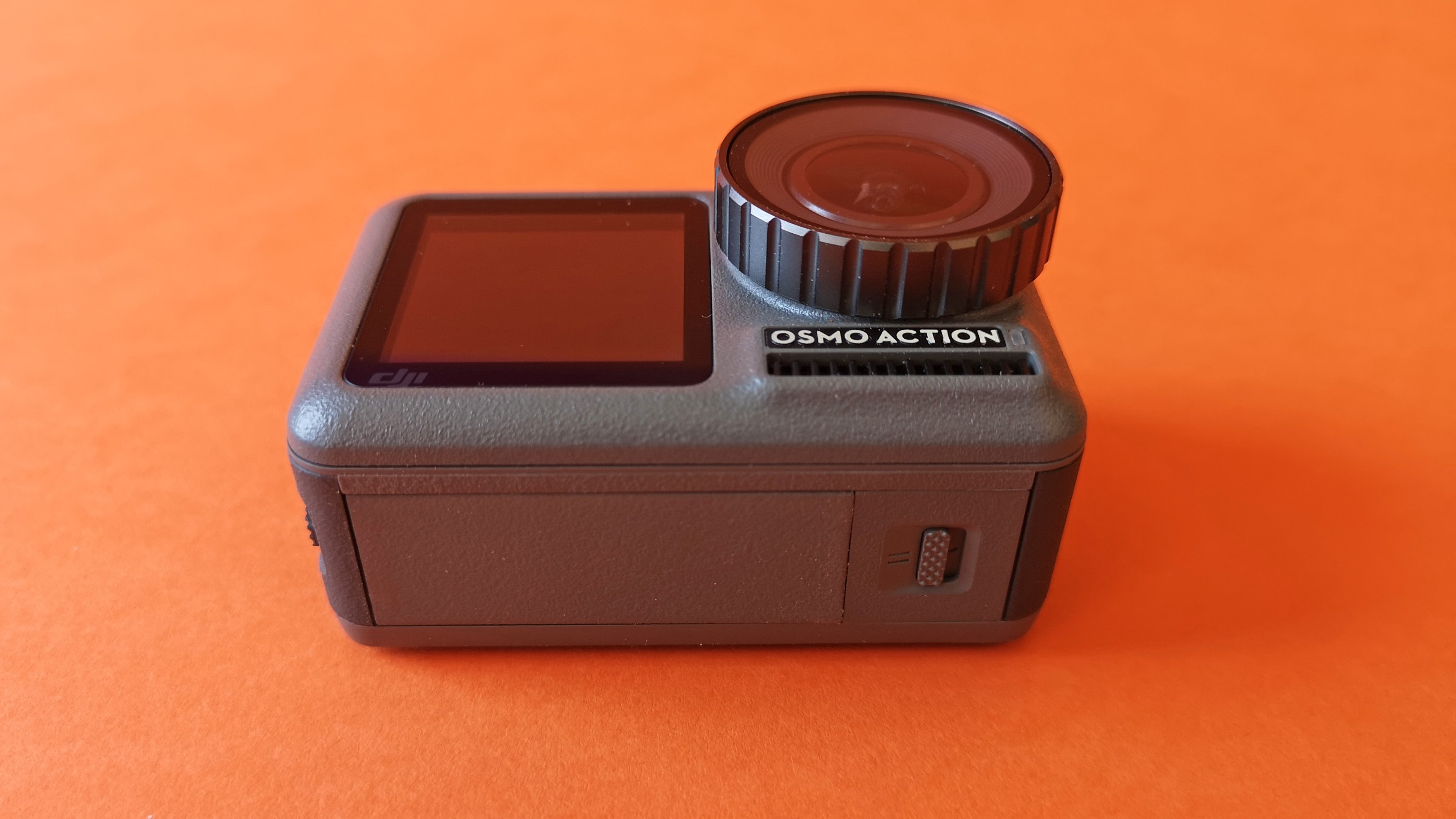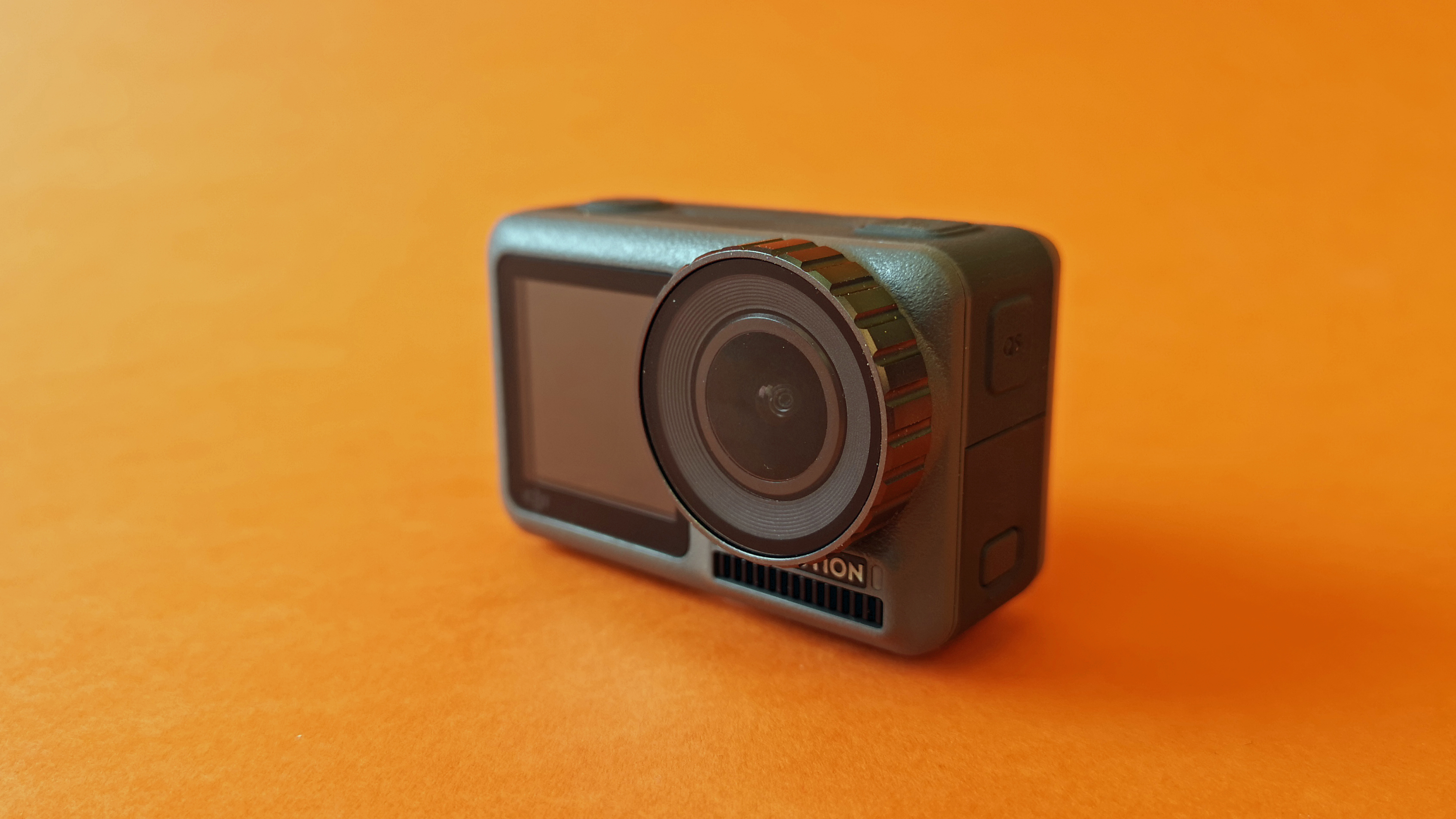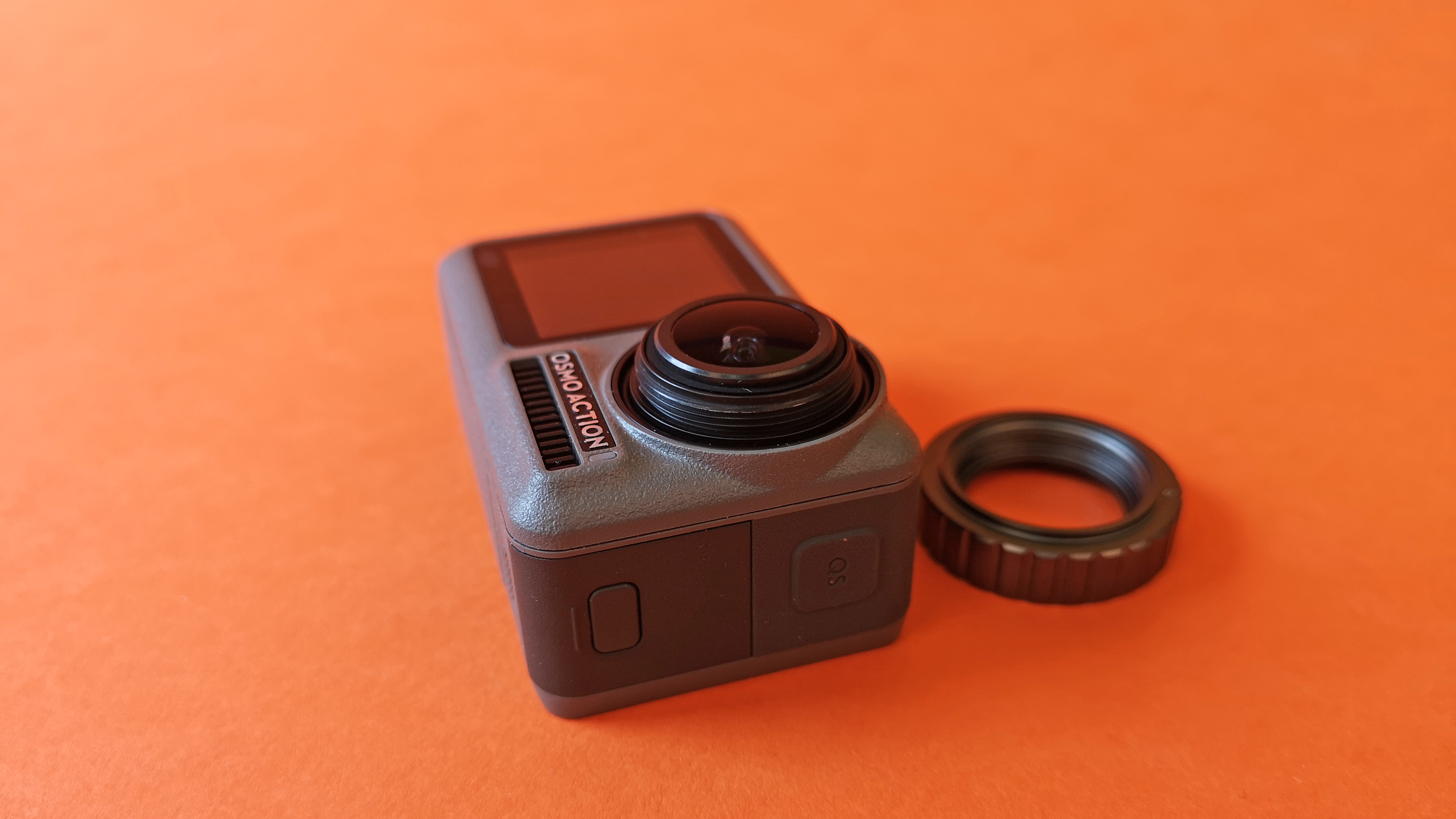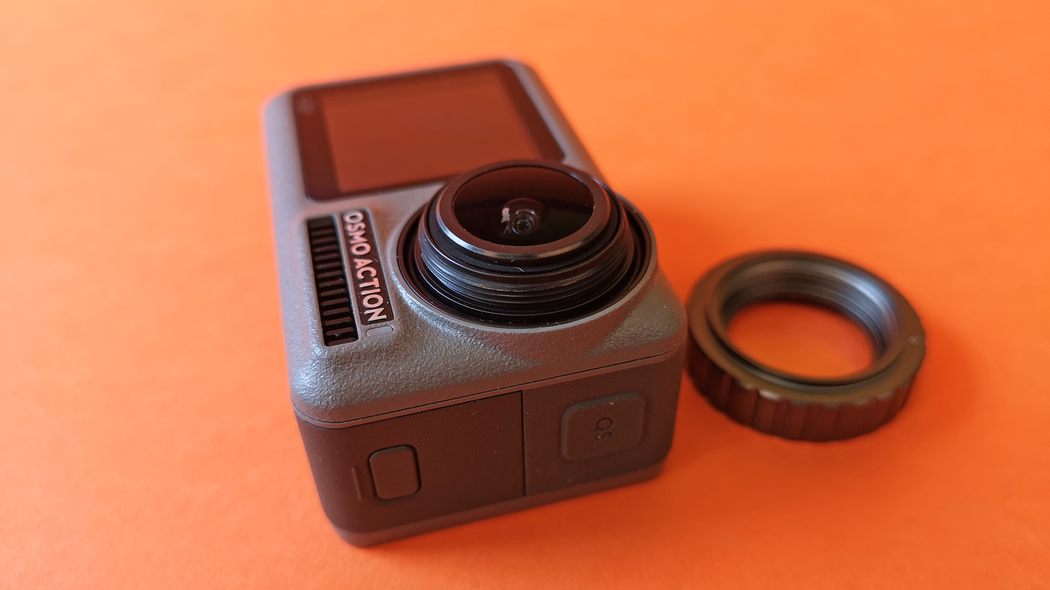 Die Kameralinse steht deutlich aus dem Gehäuse hervor. Im Gegensatz zur Konkurrenz hat DJI eine wechselbare Schutzlinse verbaut. Diese wird einfach aufgeschraubt und lässt sich so mit wenigen Handgriffen und ganz ohne Werkzeug austauschen. Zusätzliche Farbfilter (etwa für Unterwasseraufnahmen) oder ND-Filter sind so schnell und zuverlässig befestigt.