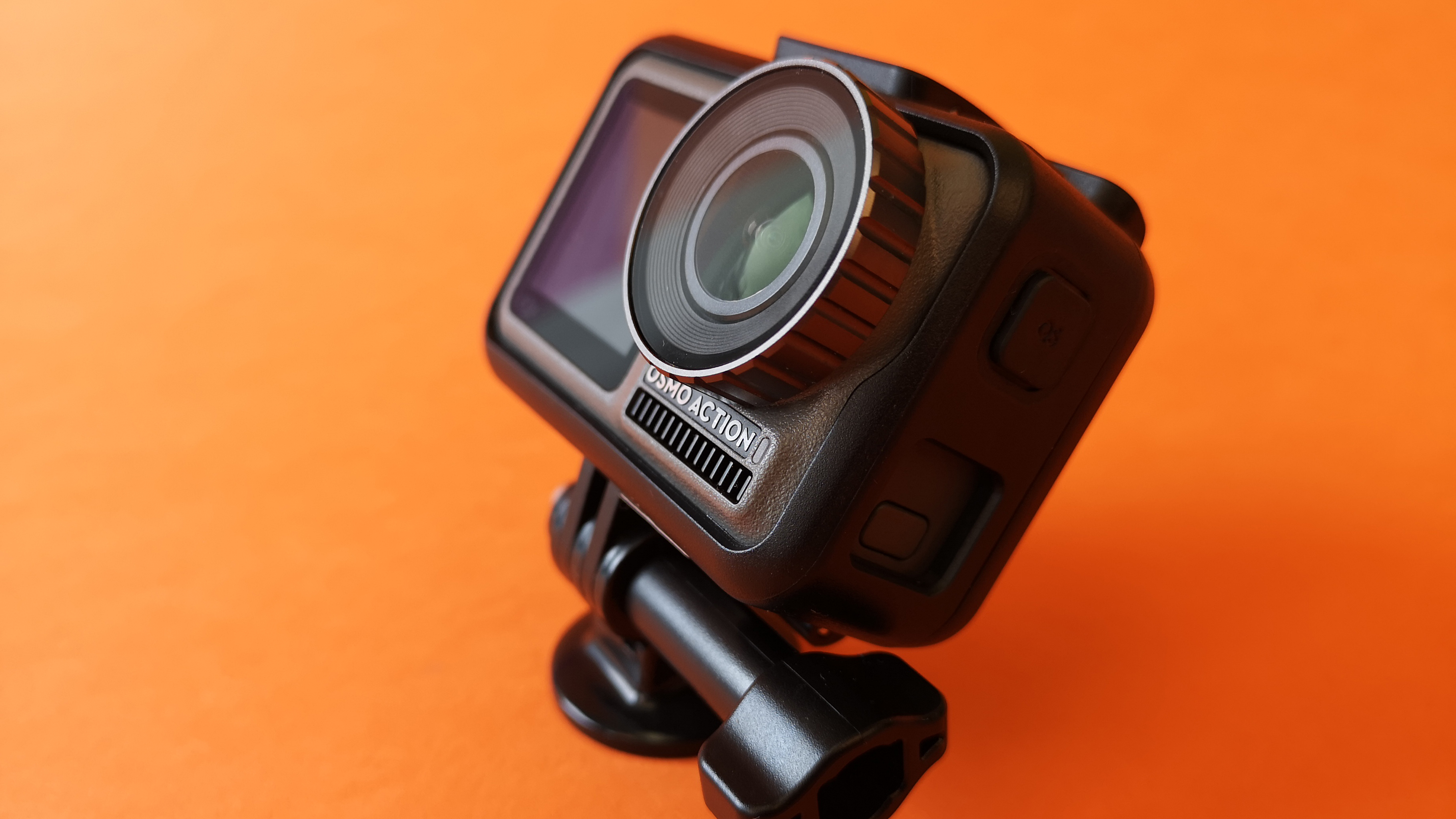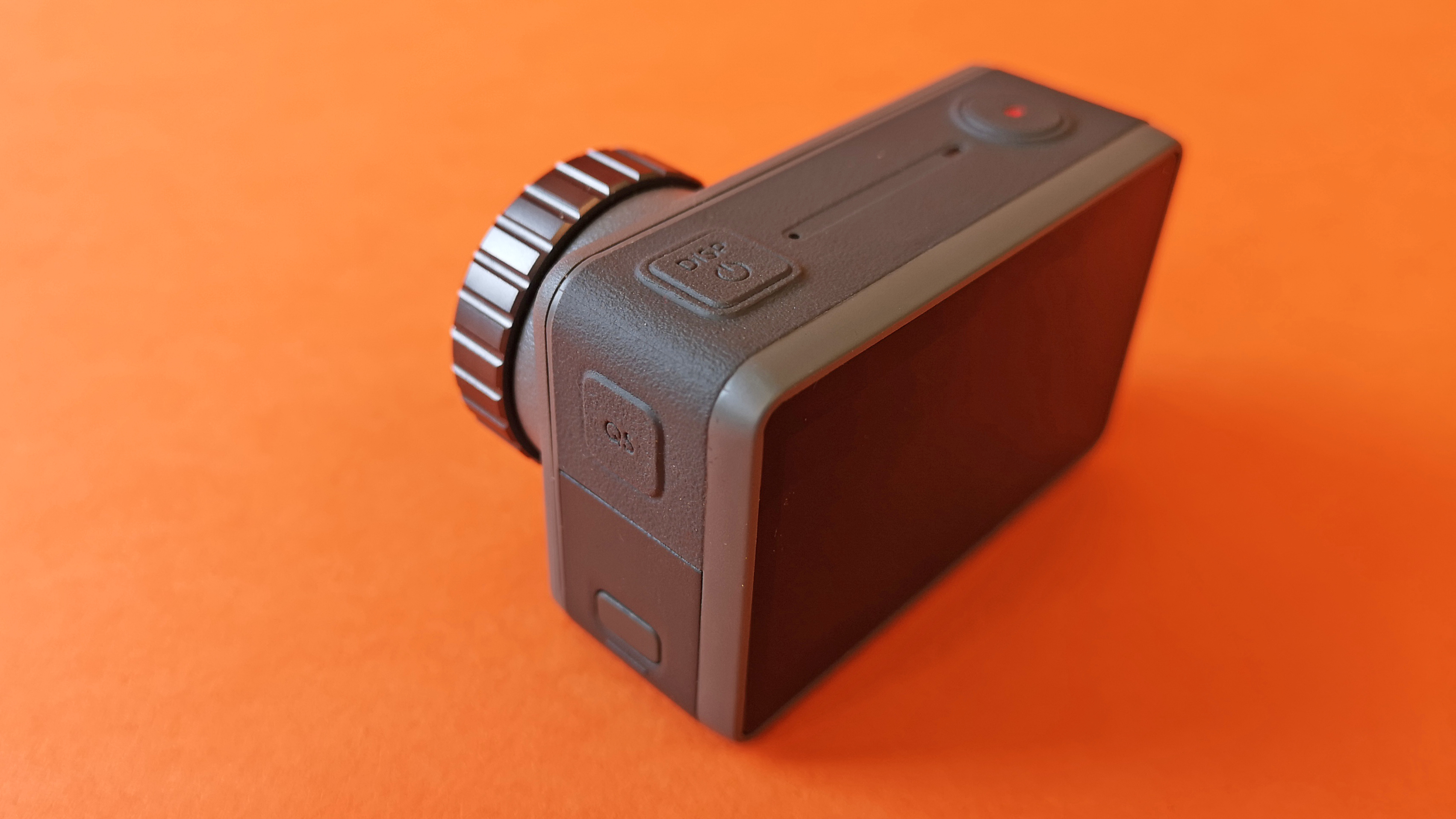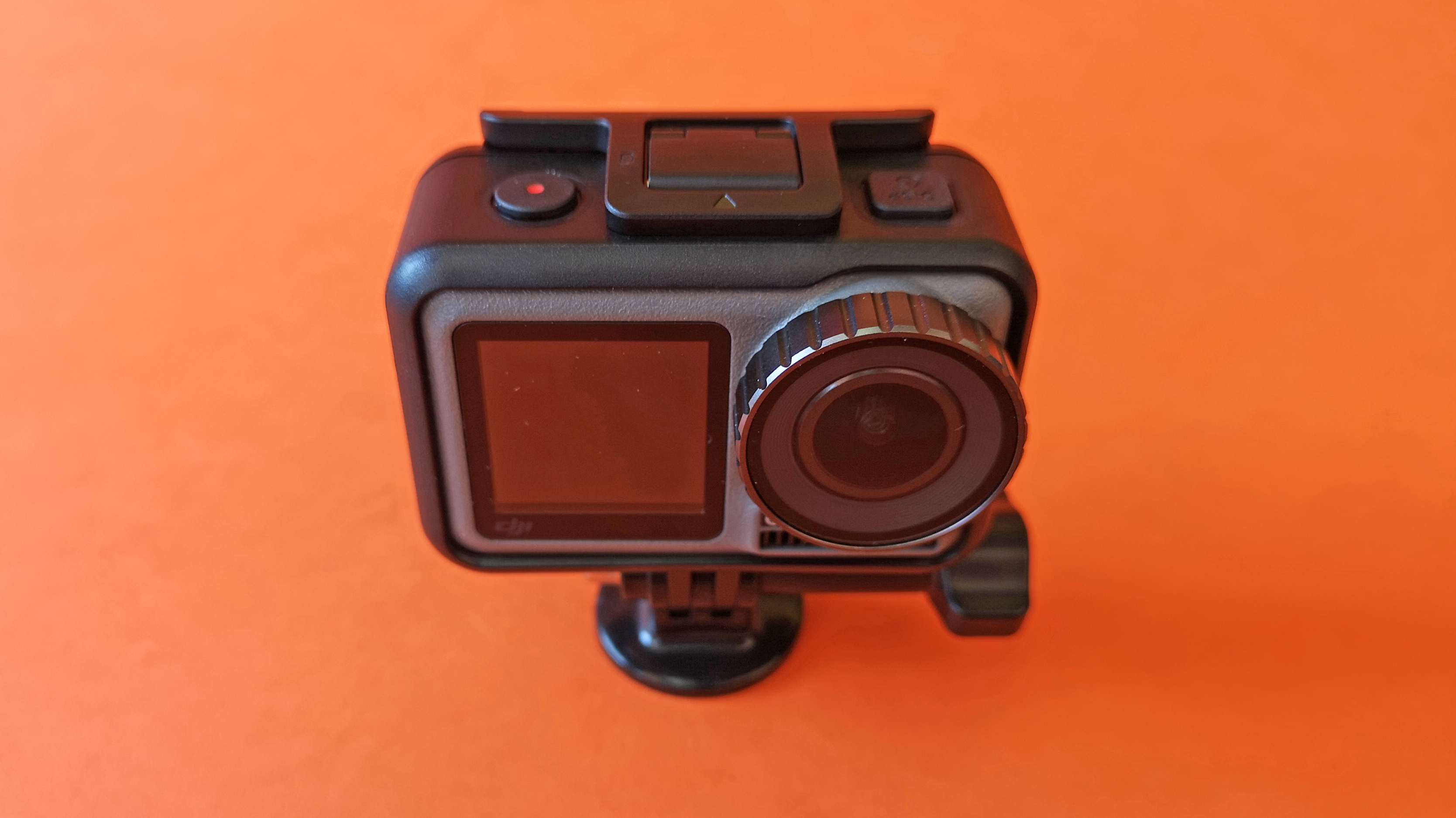 Die Kameralinse steht deutlich aus dem Gehäuse hervor. Im Gegensatz zur Konkurrenz hat DJI eine wechselbare Schutzlinse verbaut. Diese wird einfach aufgeschraubt und lässt sich so mit wenigen Handgriffen und ganz ohne Werkzeug austauschen. Zusätzliche Farbfilter (etwa für Unterwasseraufnahmen) oder ND-Filter sind so schnell und zuverlässig befestigt.