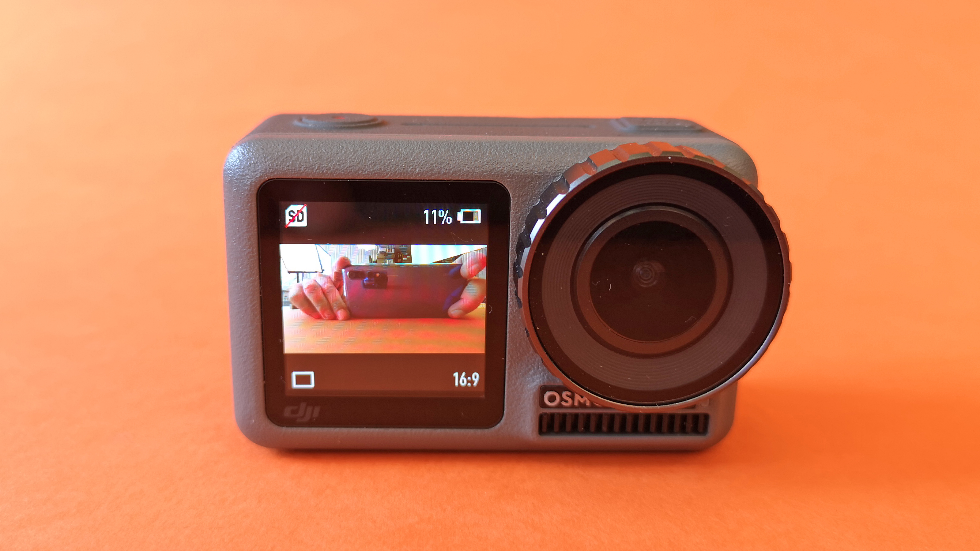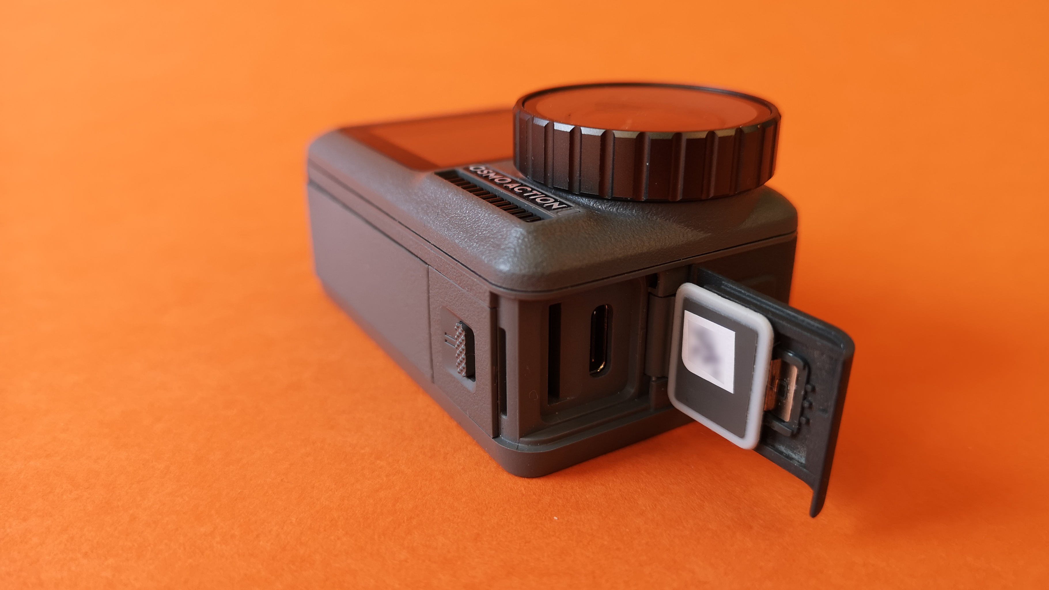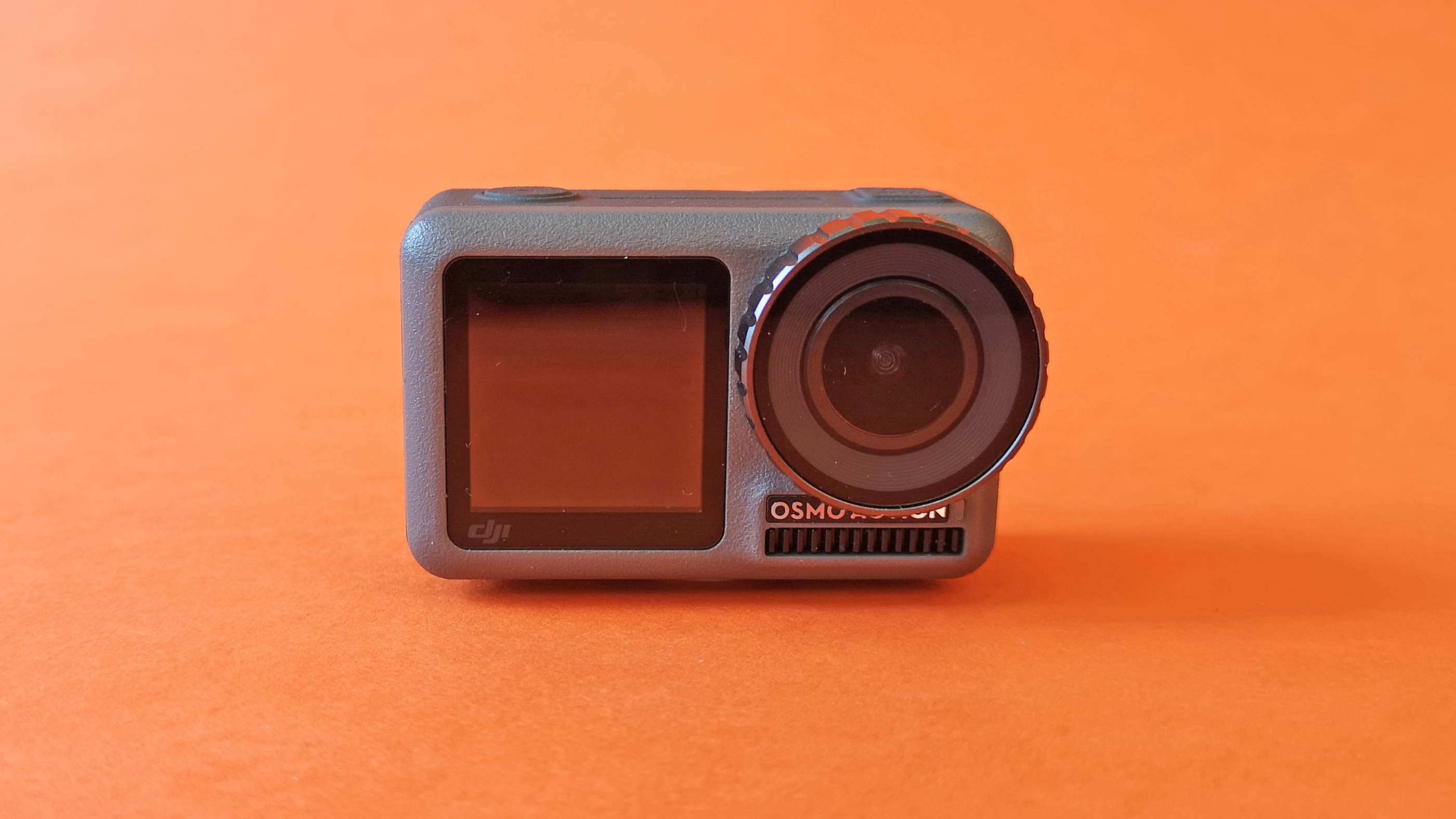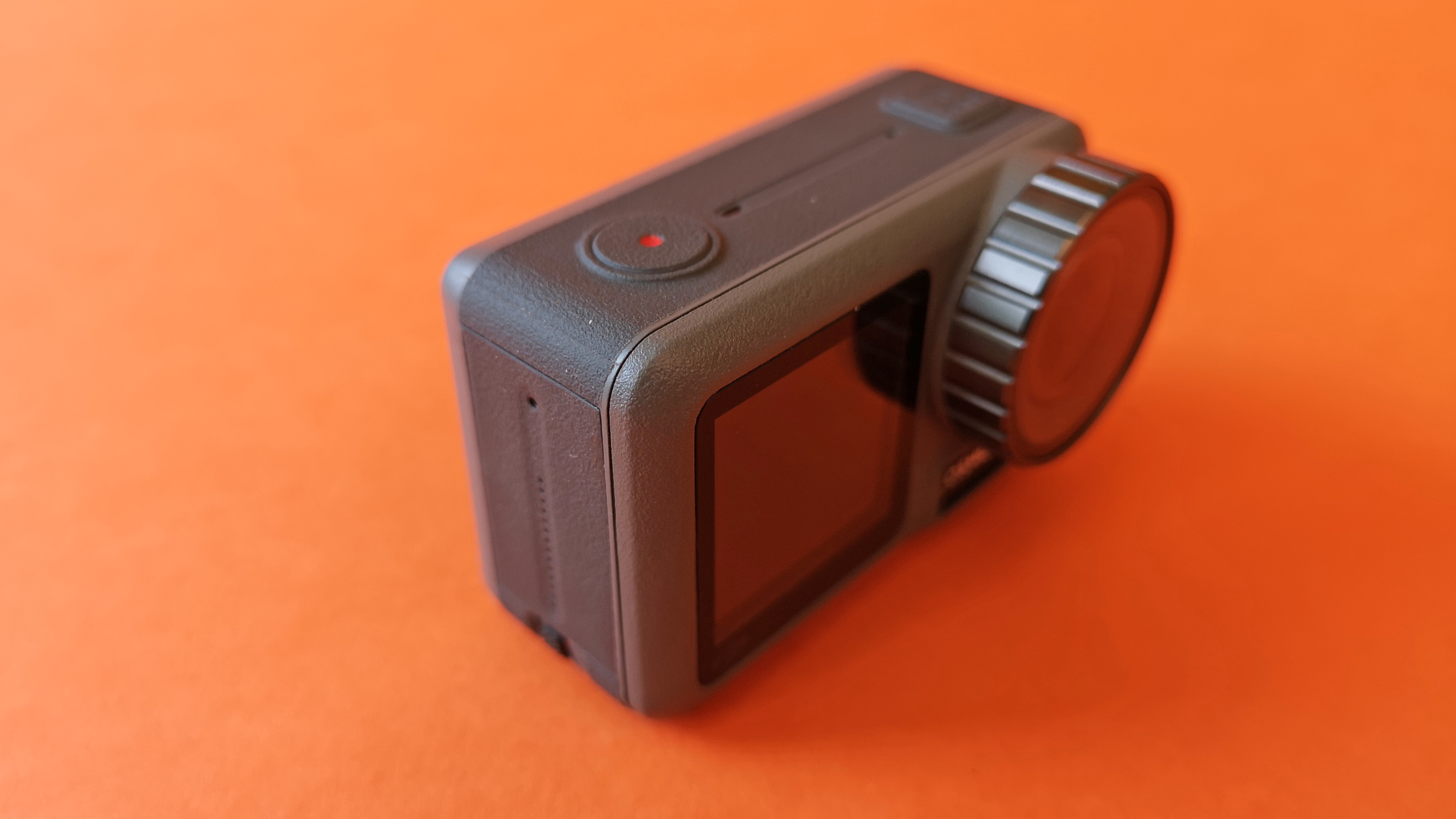 Die Kameralinse steht deutlich aus dem Gehäuse hervor. Im Gegensatz zur Konkurrenz hat DJI eine wechselbare Schutzlinse verbaut. Diese wird einfach aufgeschraubt und lässt sich so mit wenigen Handgriffen und ganz ohne Werkzeug austauschen. Zusätzliche Farbfilter (etwa für Unterwasseraufnahmen) oder ND-Filter sind so schnell und zuverlässig befestigt.