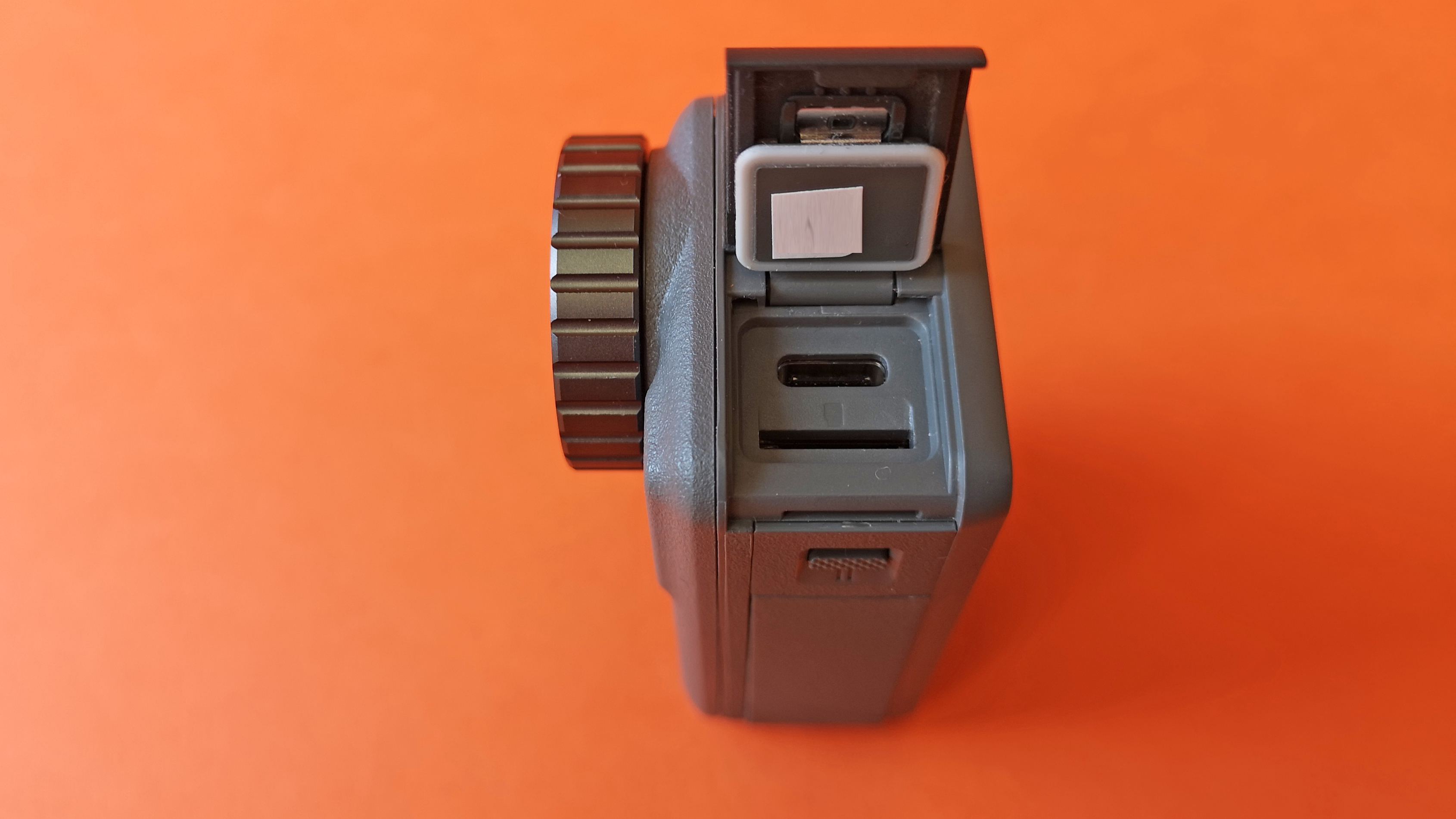 Der Micro-SD-Speicherkarteneinschub und die USB-C-Buchse zum Laden des Akkus sitzen ebenfalls auf der linken Seite. Sie sind durch eine Klappe geschützt. Um den Akku aus dem Schacht auf der Unterseite zu entfernen, müssen zuvor zwei kleine Sicherungen gelöst werden. Unbeabsichtigtes Auswerfen des Akkus wird zuverlässig verhindert.