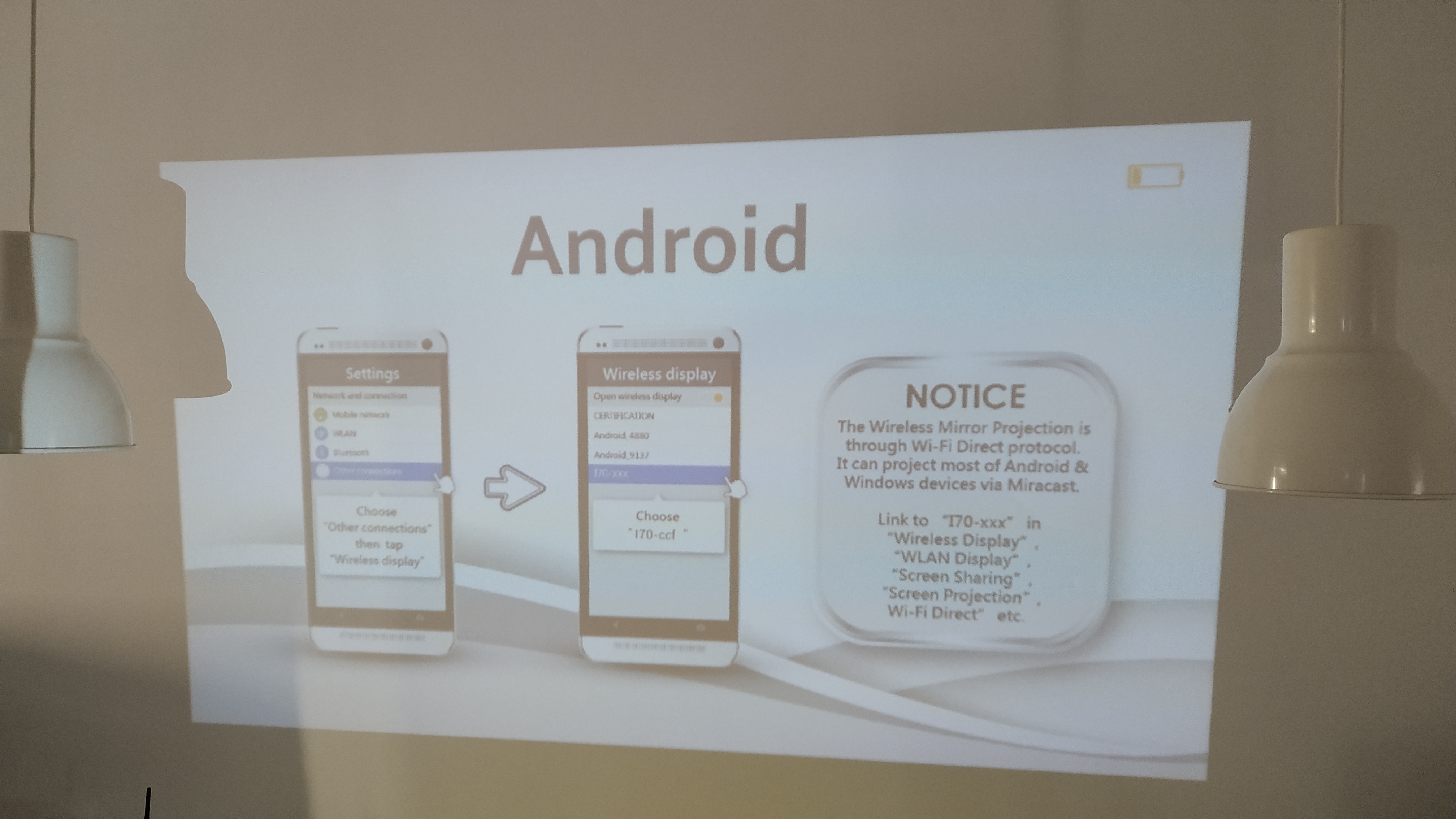 Die Verbindung mit einem Android-Smartphone über WLAN funktionierte im Test problemlos, ebenso das Spiegeln von Inhalten vom verbundenen Handy. Allerdings funktionieren nicht alle Streaming-Dienste mit der bei Android genutzten Miracast-Technologie – abgesehen davon, dass nicht alle Android-Smartphones Miracast unterstützen. Im Test war es kein Problem die Prime-Instant-Video-App zu nutzen, während bei Netflix kein Bild auf den Beamer gespiegelt wurde.