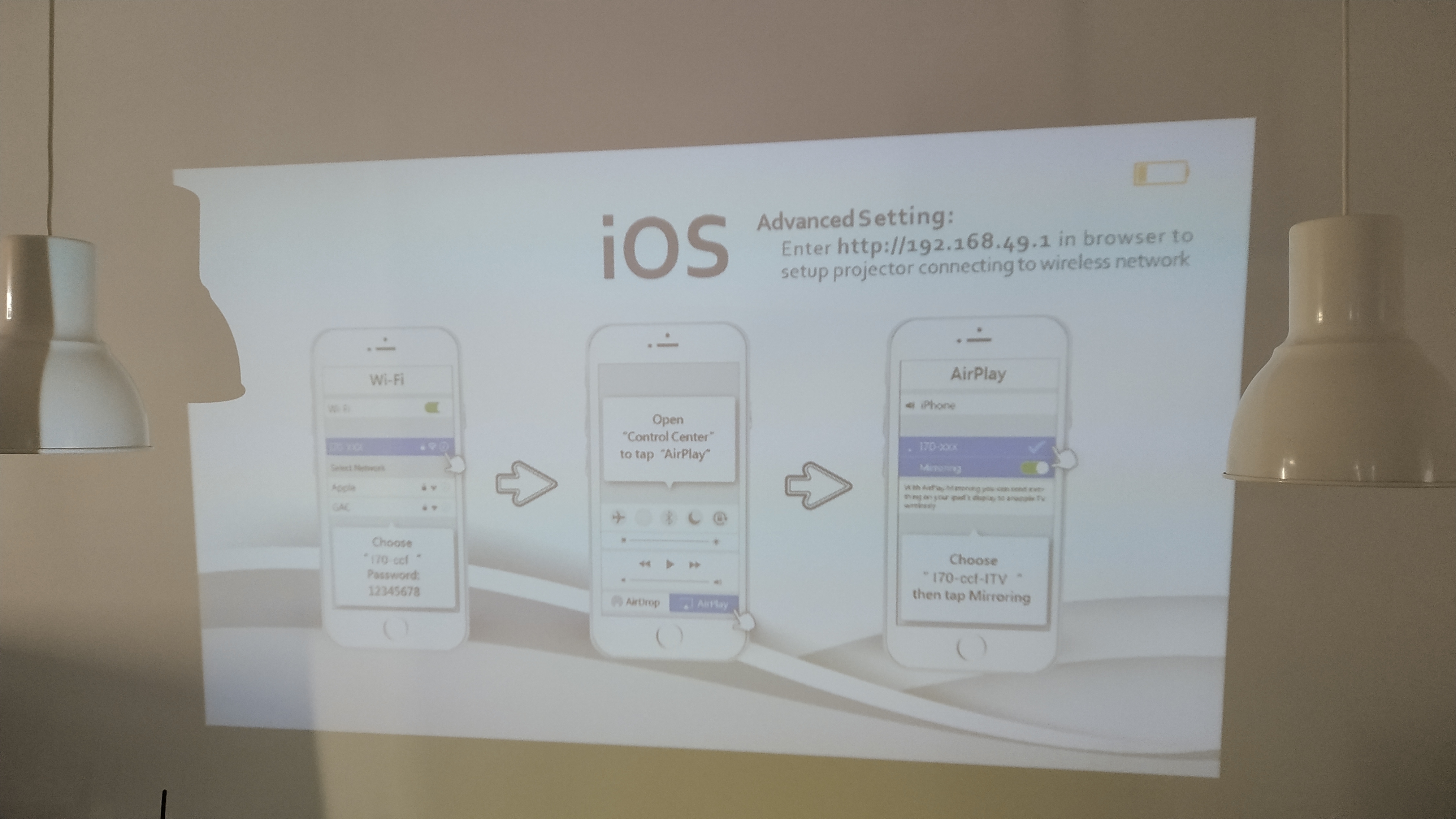 Der Aiptek Mobilecinema i70 besitzt weder eine Fernbedienung noch Bedienelemente direkt am Gerät. Es gibt demzufolge auch keine Möglichkeit Einstellungen bezüglich Bildformat, Farbdarstellung oder Lautstärke vorzunehmen. Die Steuerung von Inhalten erfolgt jeweils über das per HDMI oder WLAN angeschlossene Gerät. Die drahtlose Verbindung um Inhalte von Android- und iOS-Smartphones auf das Gerät zu spiegeln erfolgt per On-Screen-Wizard nach dem Einschalten des Aiptek Mobilecinema i70. Zum Wechseln zwischen dem Modus für Android oder iOS drückt der Nutzer bei eingeschaltetem Beamer einmal kurz den Power-Button.