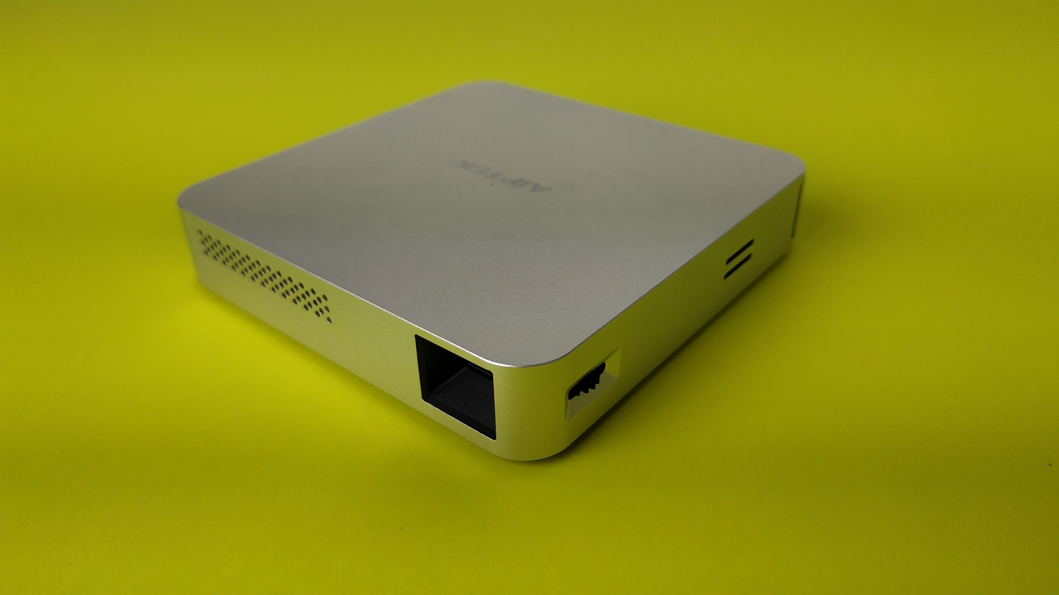 Die Linse des Beamers sitzt vorne rechts, um die Ecke findet sich ein Drehrädchen zum Einstellen der Schärfe. Rechts davon strahlt der Lautsprecher aus dem Gehäuse. Auf der linken Seite im hinteren Bereich ist der Einschalter untergebracht. Die Auflösung des Aiptek Mobilecinema i70 beträgt 854 × 480 Pixel, die maximale Helligkeit laut Datenblatt 70 Lumen. Die maximale Projektionsgröße gibt der Hersteller mit 80 Zoll an. Neben der Möglichkeit Inhalte über den HDMI-Eingang auf den Beamer zu bekommen gibt es dank integriertem WLAN-Modul nach 802.11 a, b, g, n und ac Unterstützung für Android-Geräte (via Miracast) und iOS-Devices (via Airplay).