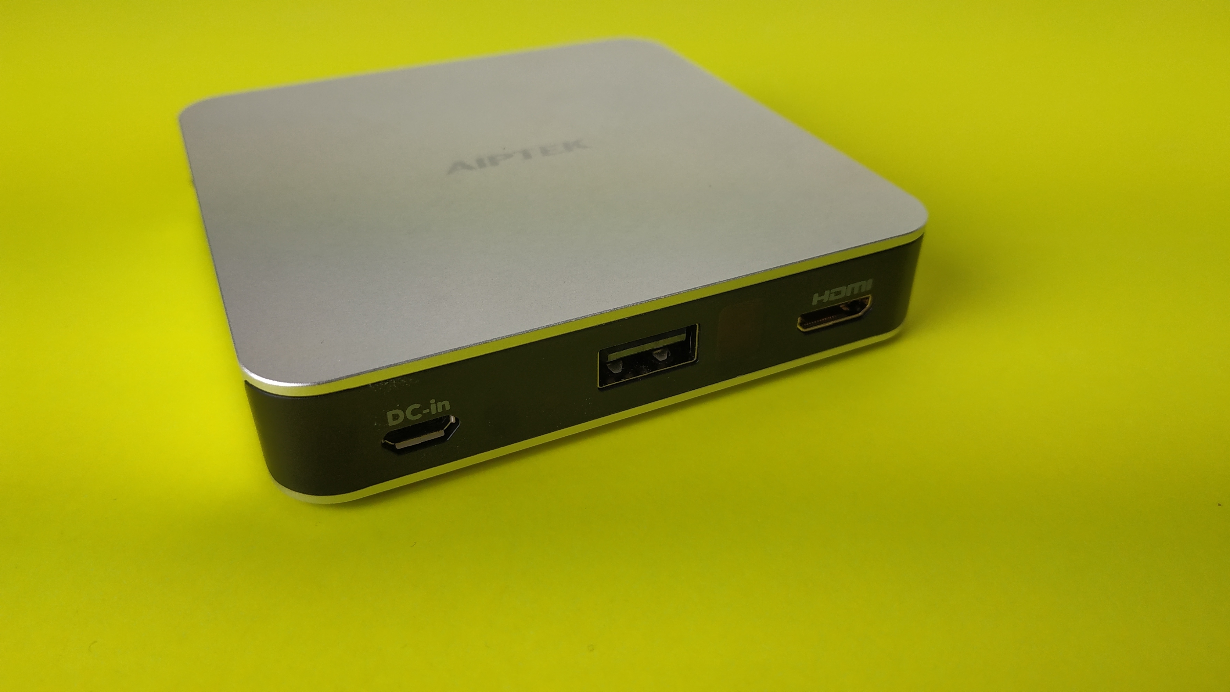 Gerade einmal 85 × 85 × 17 mm misst der Aiptek Mobilecinema i70 und wiegt nur 132 g. Somit passt der Beamer sogar in die vordere Hosentasche. Er ist also, was seine Abmessungen angeht, prädestiniert für den mobilen Einsatz. Das Gehäuse zeigte sich uns im Test gut verarbeitet. Es besteht zum größten Teil aus Aluminium, Unterseite und Rückseite sind aus schwarzem Kunststoff. Wie üblich gibt es unten in den Ecken vier kleine Gummi-Füßchen, damit der Beamer rutschfest auf Oberflächen steht.