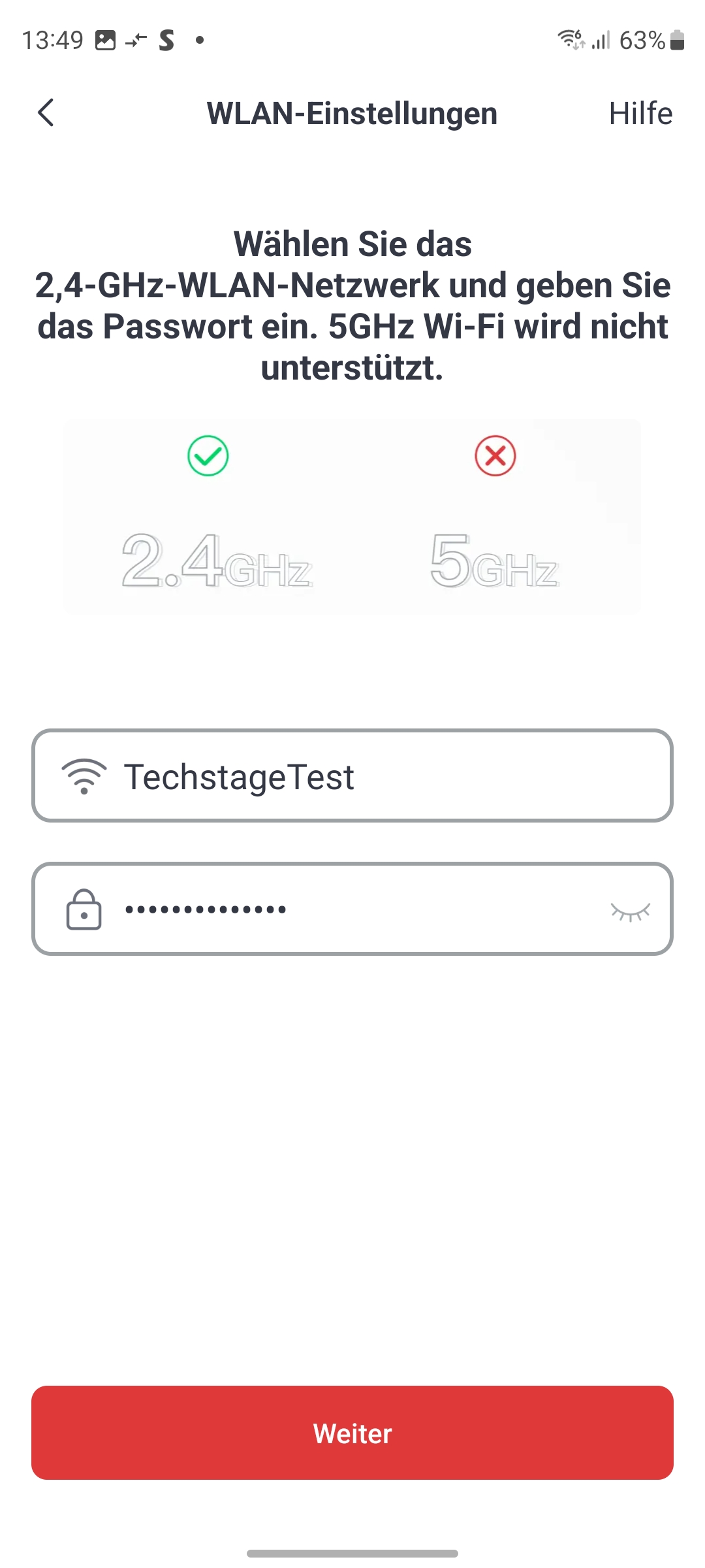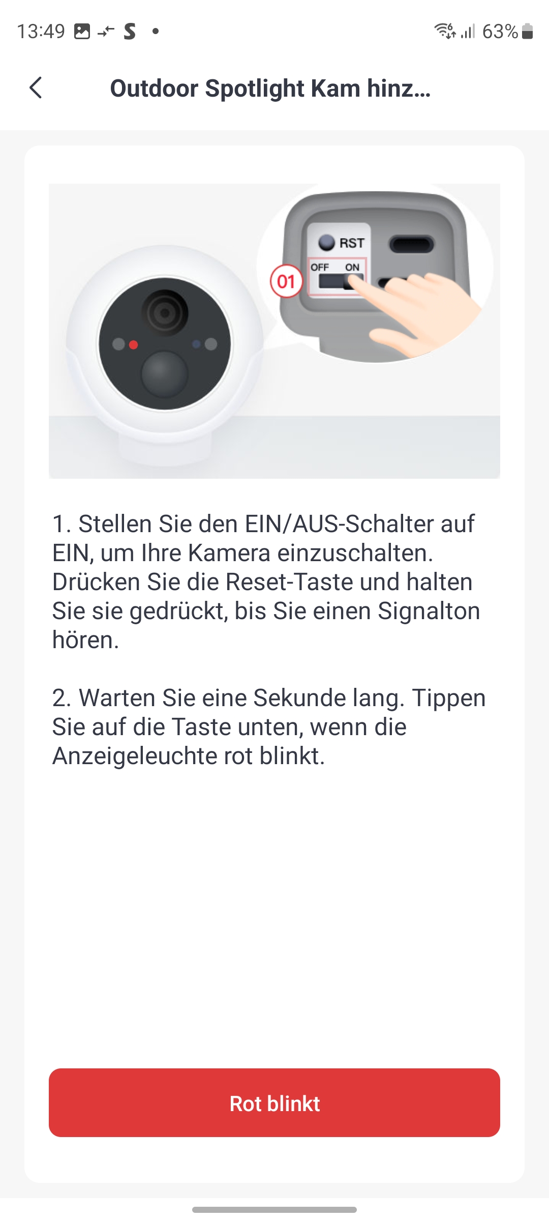 Die App ist übersichtlich gestaltet und bietet am unteren Bildschirmrand die Optionen Home, Szenen, Shop und Profil. Unter Home werden die installierten Geräte angezeigt, die einzelnen Zimmern zugeordnet werden können. Da die Kamera auch über Bluetooth verfügt, wird sie ganz oben mit „Outdoor Spotlight Kam“ angezeigt. Ein Installationsassistent führt durch das Setup und zeigt anhand von animierten Grafiken und Beschreibungen die einzelnen Schritte der Inbetriebnahme. Sollte sich die Kamera nicht im Kopplungsmodus befinden, drückt man die Reset-Taste an der Rückseite so lange, bis ein Signalton aus der Kamera zu hören ist. Jetzt wartet man einen Moment, bis die Status-LED an der Vorderseite über dem Objektiv in Rot blinkt. Anschließend tippt man auf die Schaltfläche „Rot blinkt“ und gibt auf der nächsten Seite das WLAN-Passwort ein, wobei die Kamera nur 2,4-GHz-Netze unterstützt. Nun erzeugt die App einen QR-Code, den man im Abstand von 10 bis 20 Zentimeter vor das Objektiv hält. Das erfolgreiche Einlesen des QR-Codes signalisiert die Kamera mit einem Signalton. Danach verbindet sich die Kamera mit dem WLAN und steht anschließend in der App bereit.