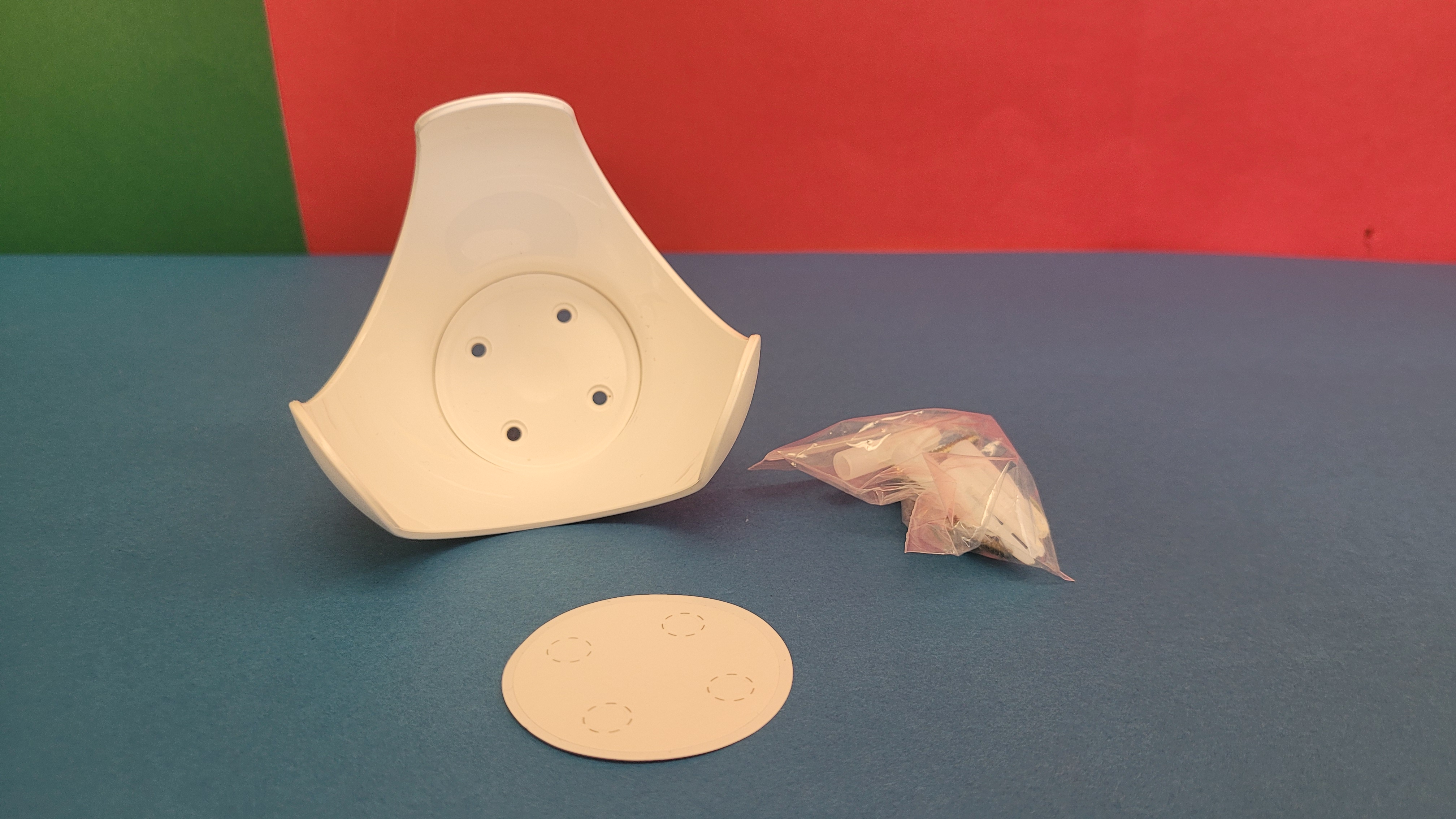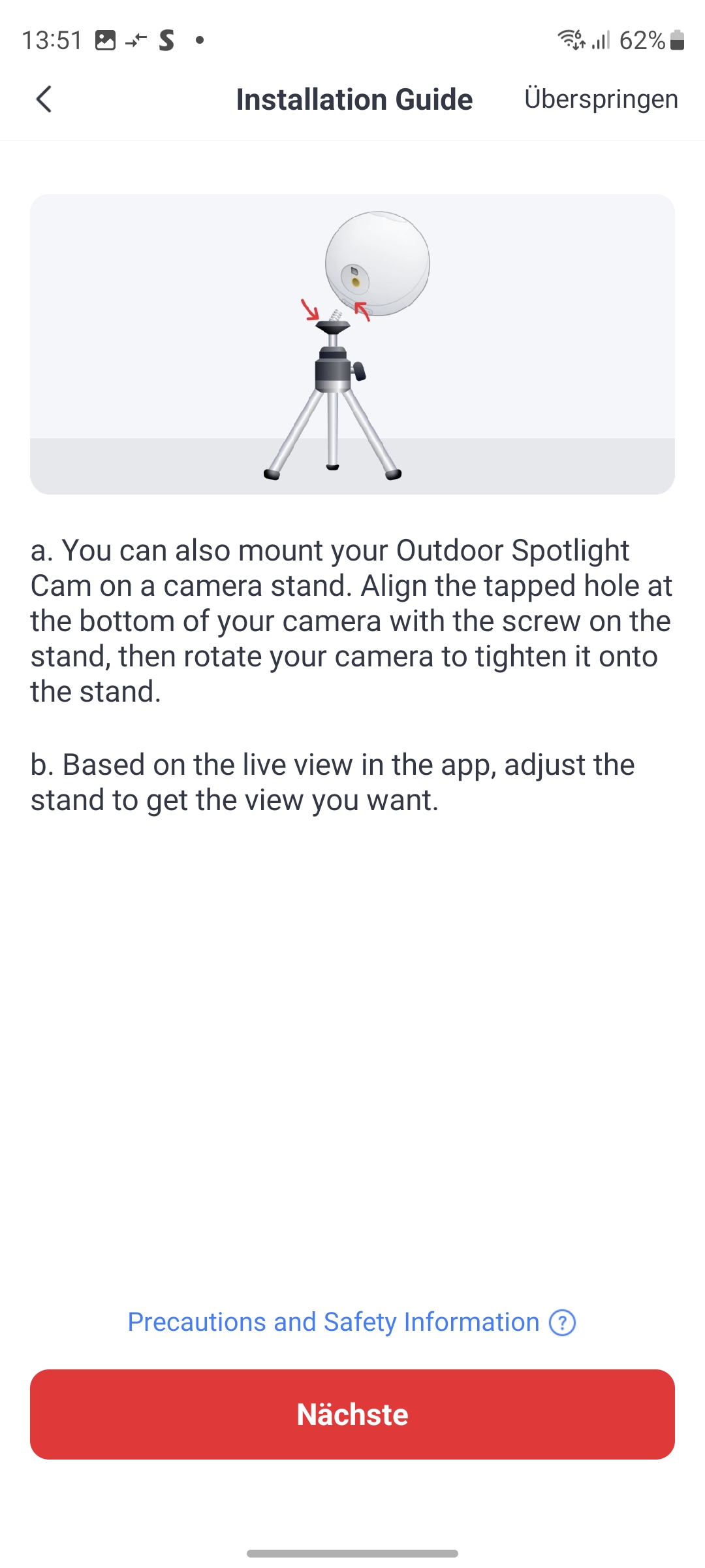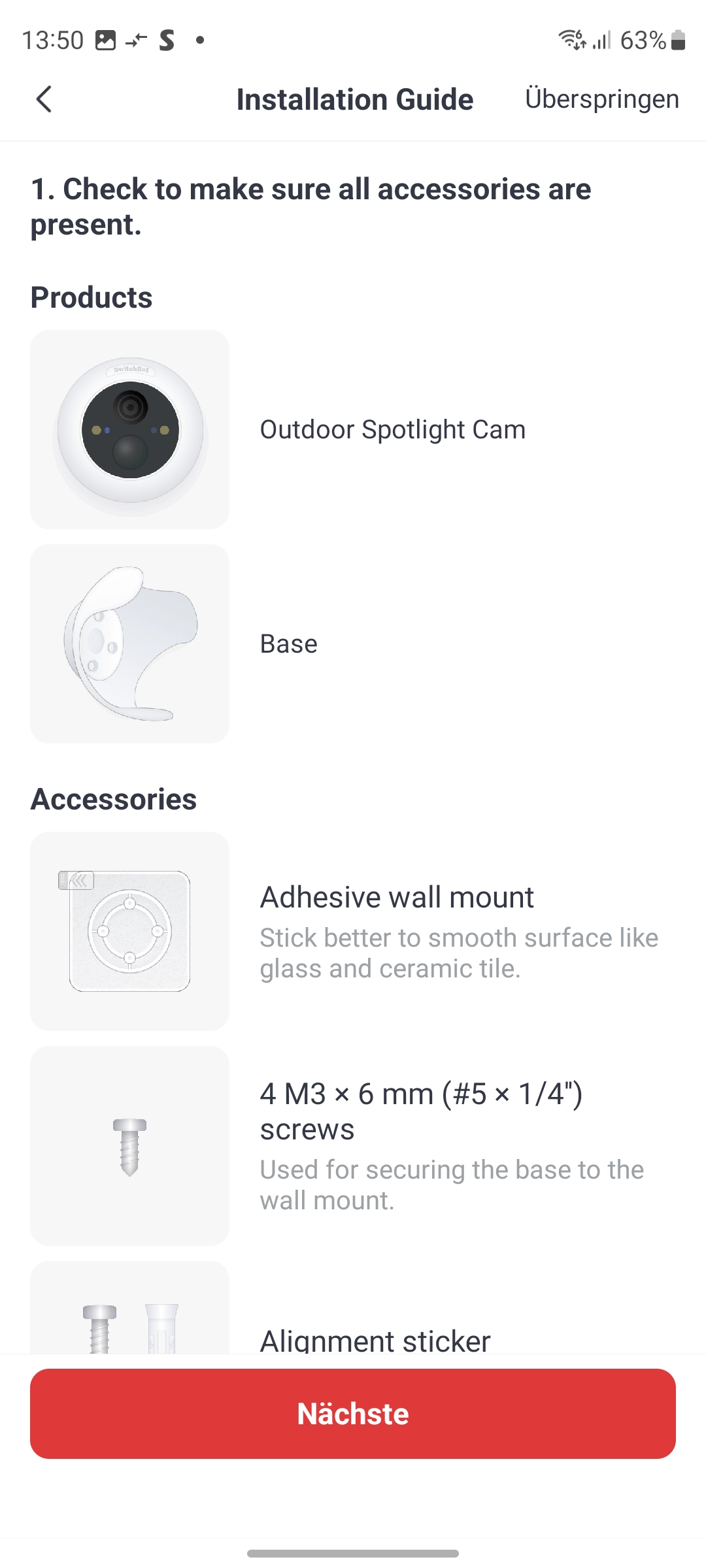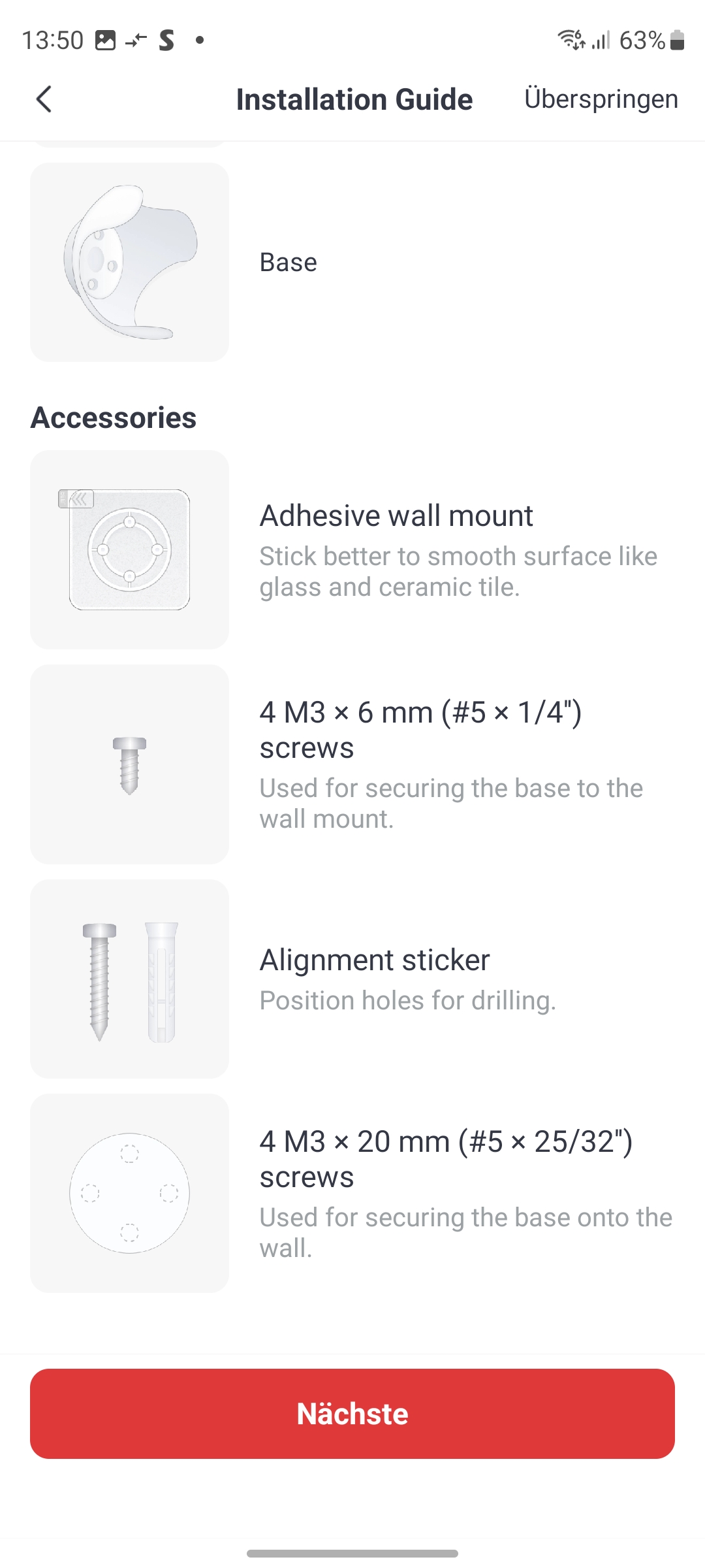 Der Lieferumfang enthält neben der Kamera eine verschraubbare Halterung inklusive Schrauben und Dübel sowie eine Bohrschablone und ein englischsprachiges Benutzerhandbuch. Ein deutsches Handbuch haben wir nicht gefunden, auch nicht im Support-Bereich des Herstellers. Immerhin existiert eine deutsche Q&A. Mitgeliefert wird außerdem ein Klebepad mit Schraubfassung, mit der man die Kamera sehr leicht an glatten Oberflächen montieren kann (siehe auch Bildergalerie).