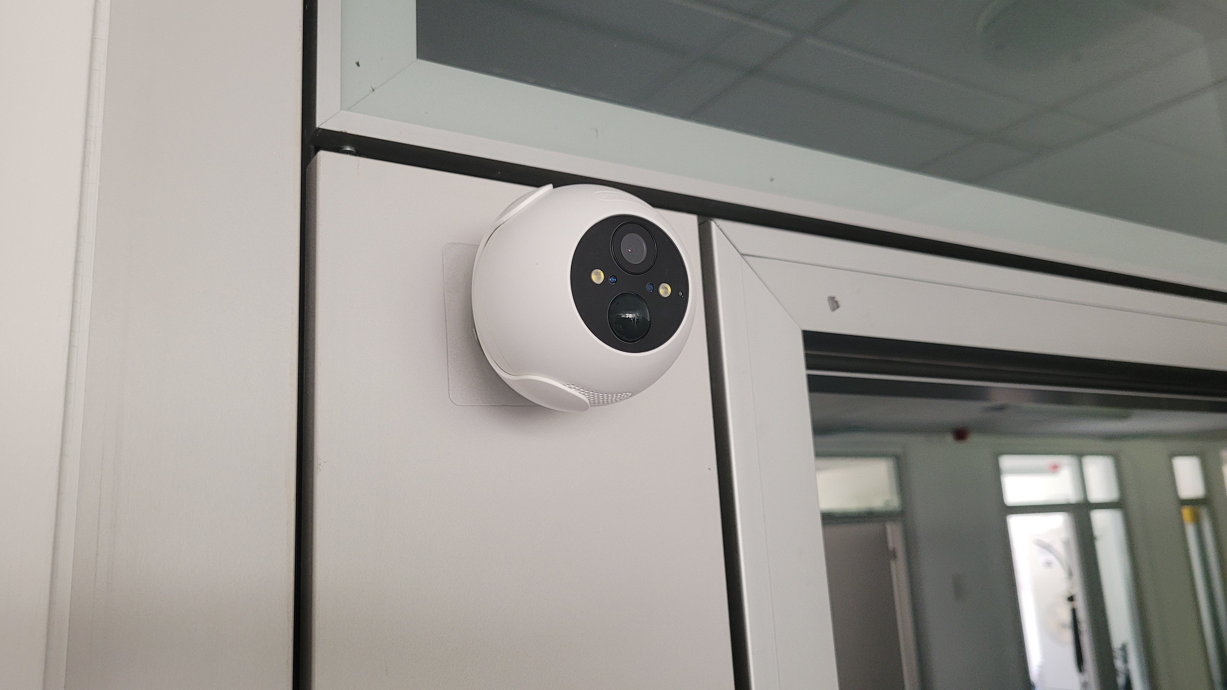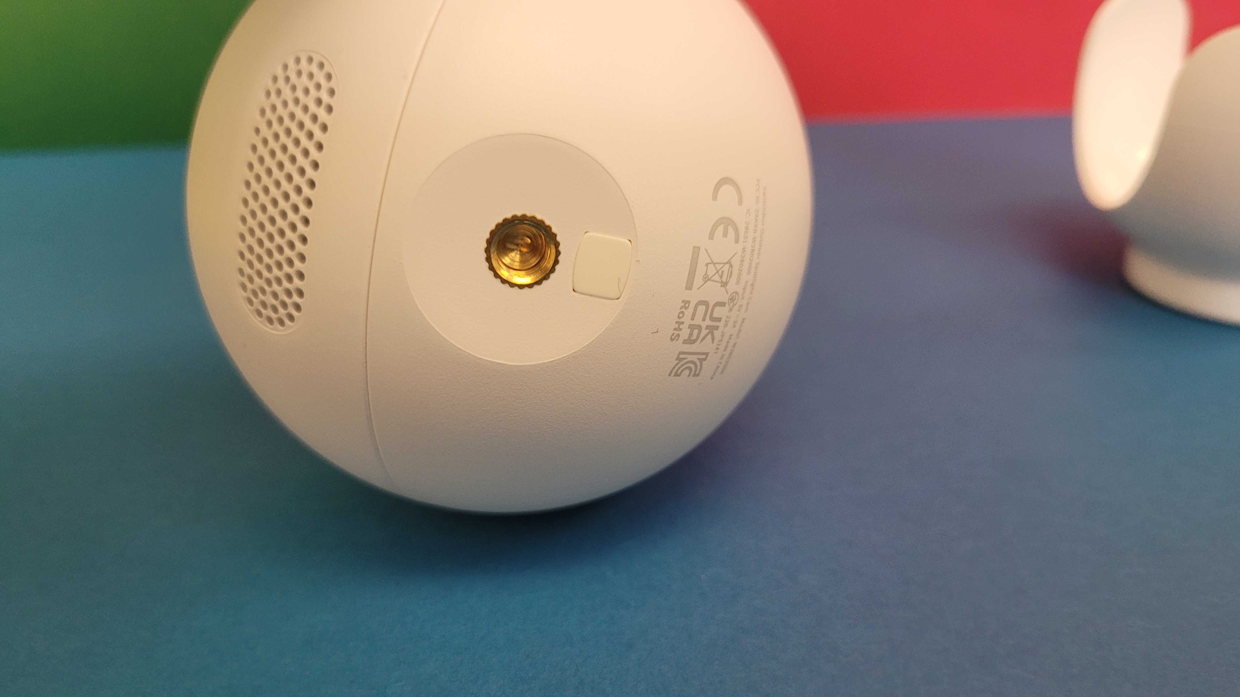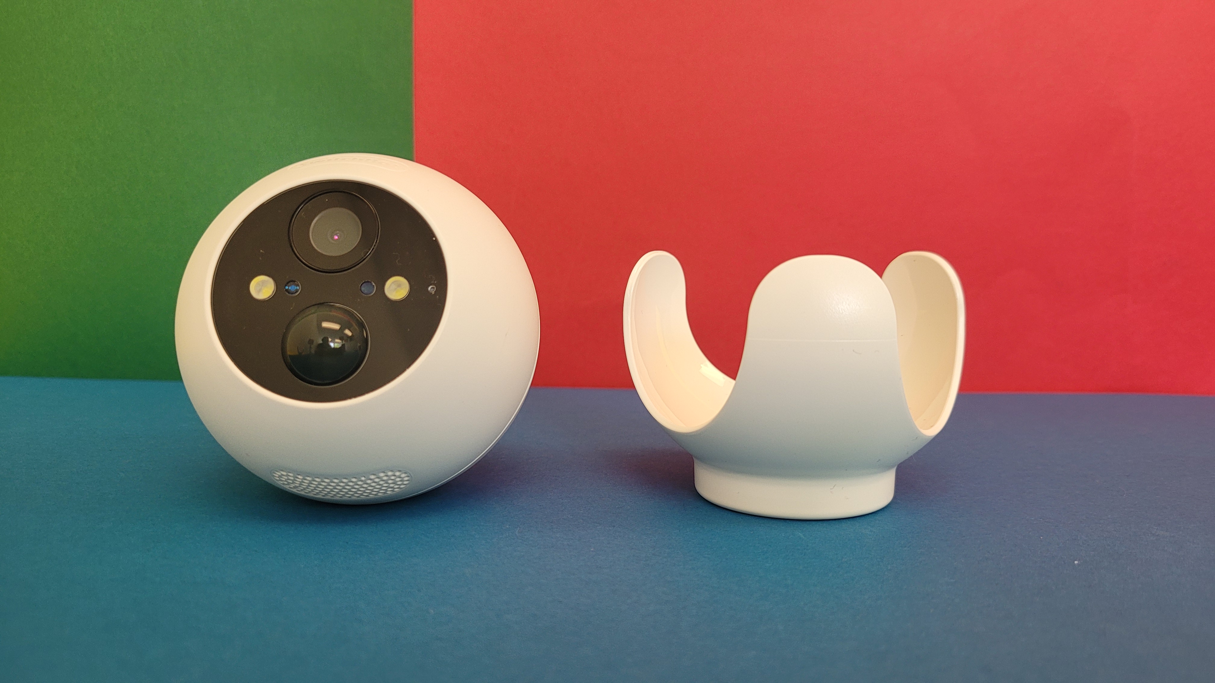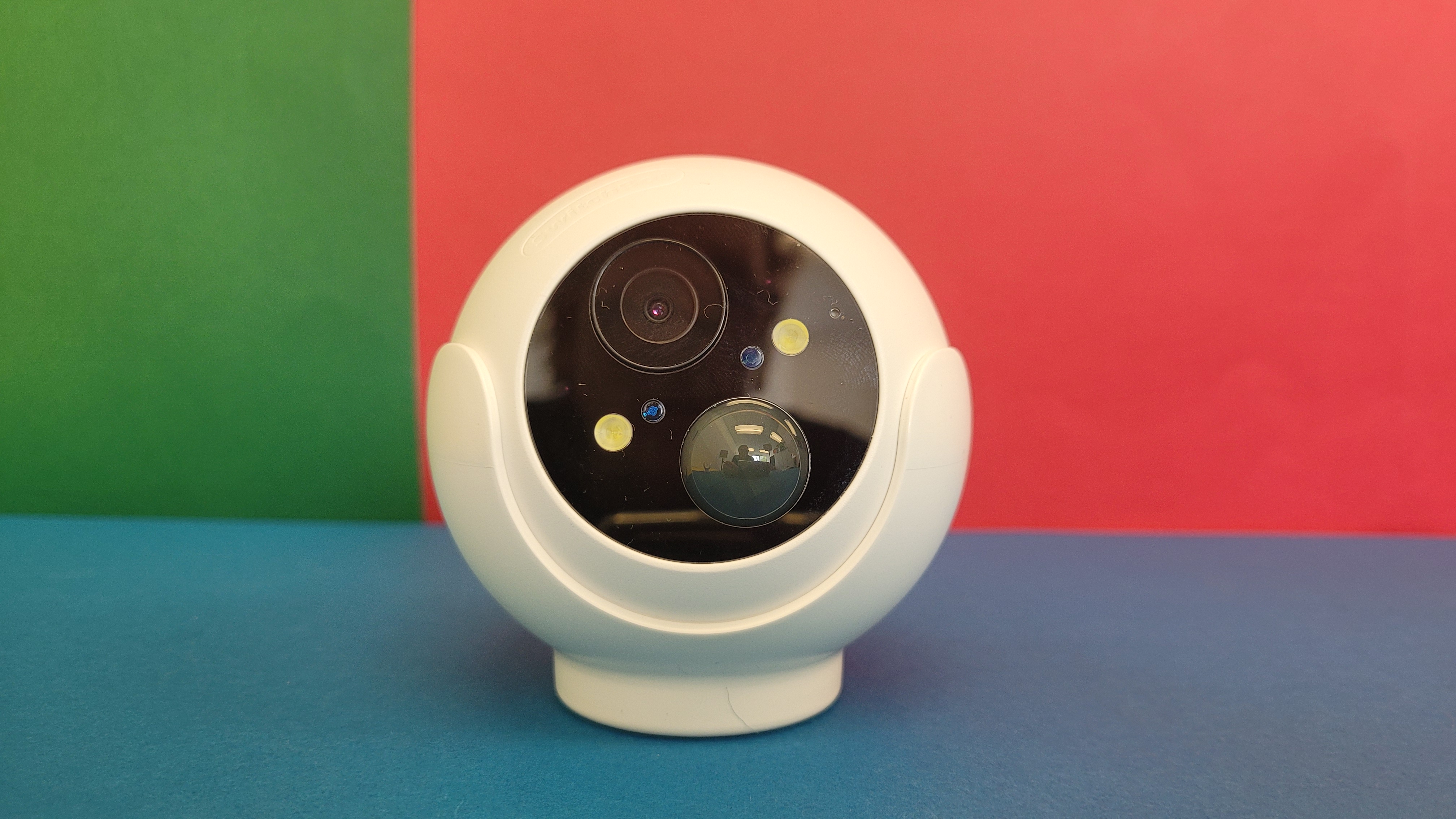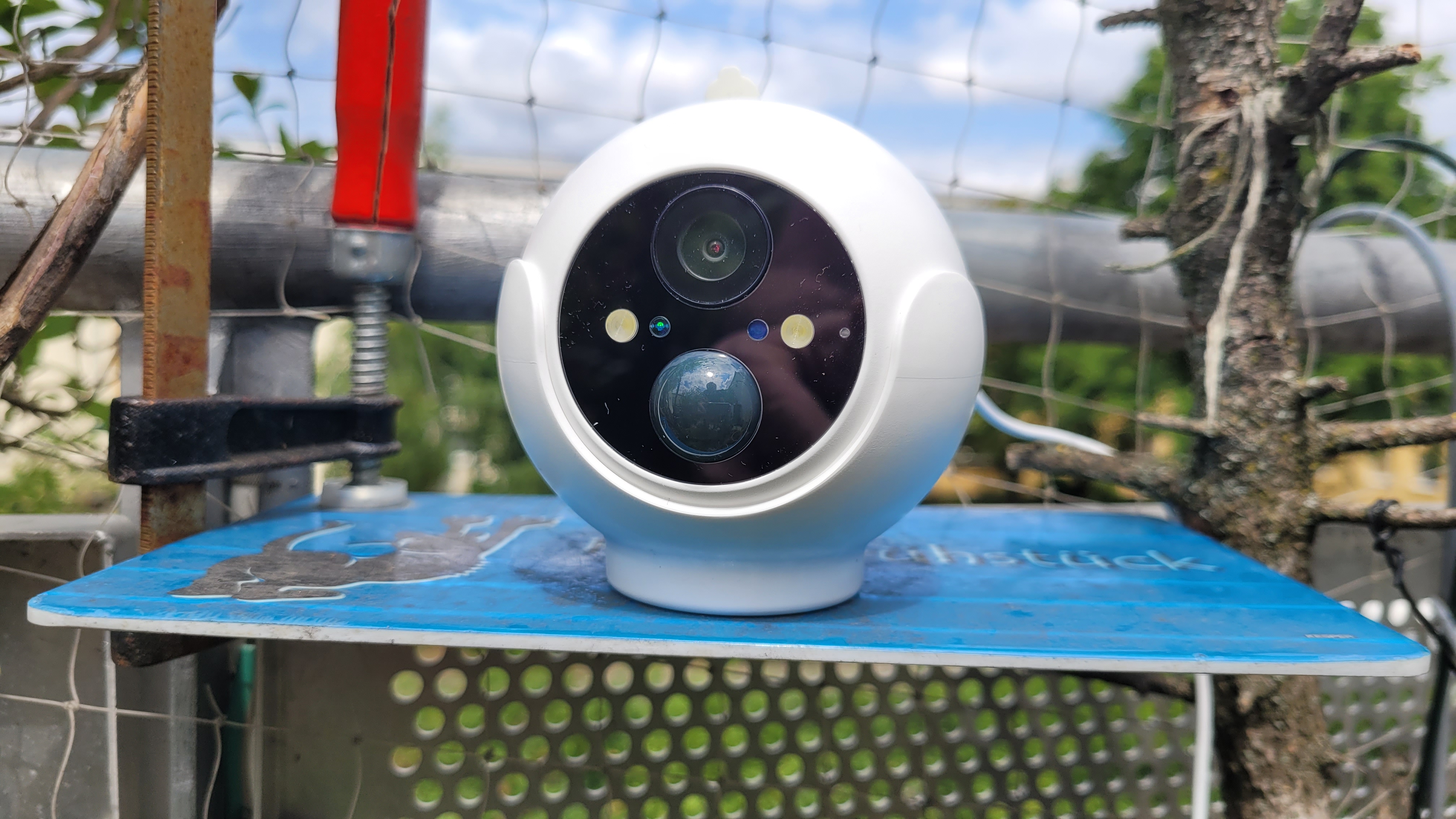 Die 320 Gramm schwere Switchbot Outdoor Spotlight kommt in einem runden Gehäuse mit einem Durchmesser von 86 mm. Das hebt sie von den typischen Kameras in Bullet-Form ab und macht sie nahezu einzigartig. An der Vorderseite ist die „Kugel“ abgeflacht und anstelle des weißen Plastikgehäuses tritt eine schwarze Abdeckung, in die Objektiv, Kameralinse, PIR-Bewegungssensor, Infrarot- und LED-Lichter, Lichtsensor und Mikrofon eingelassen sind. Letzteres sorgt in Verbindung mit dem an der Unterseite positionierten Lautsprecher, über den eine bis zu 100 dB laute Sirene ertönen kann, die Zwei-Wege-Audiofunktion. Damit kann man Gespräche mit Personen vor der Kamera führen. Die Audioqualität geht dabei in Ordnung und reicht völlig für den kommunikativen Austausch mit zum Beispiel einem Paketboten aus.