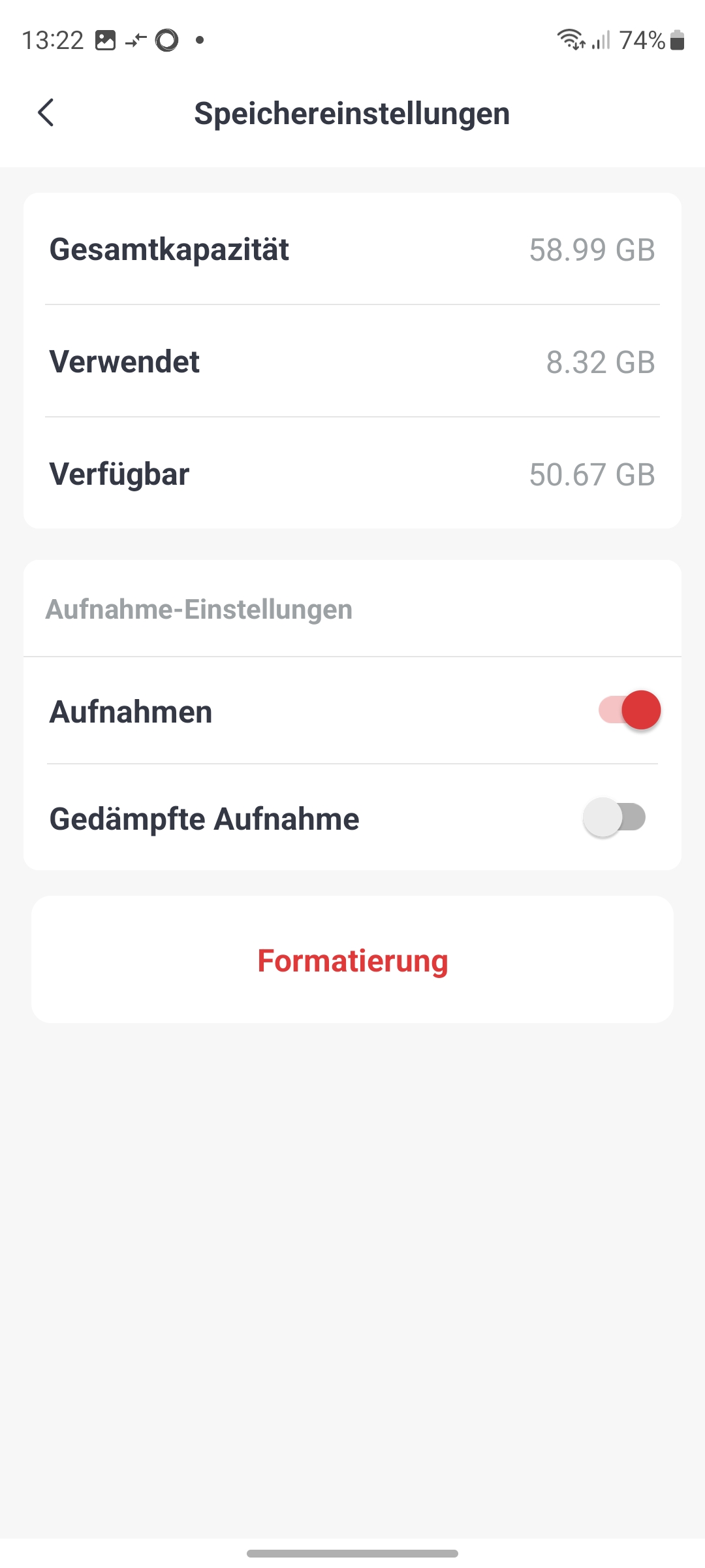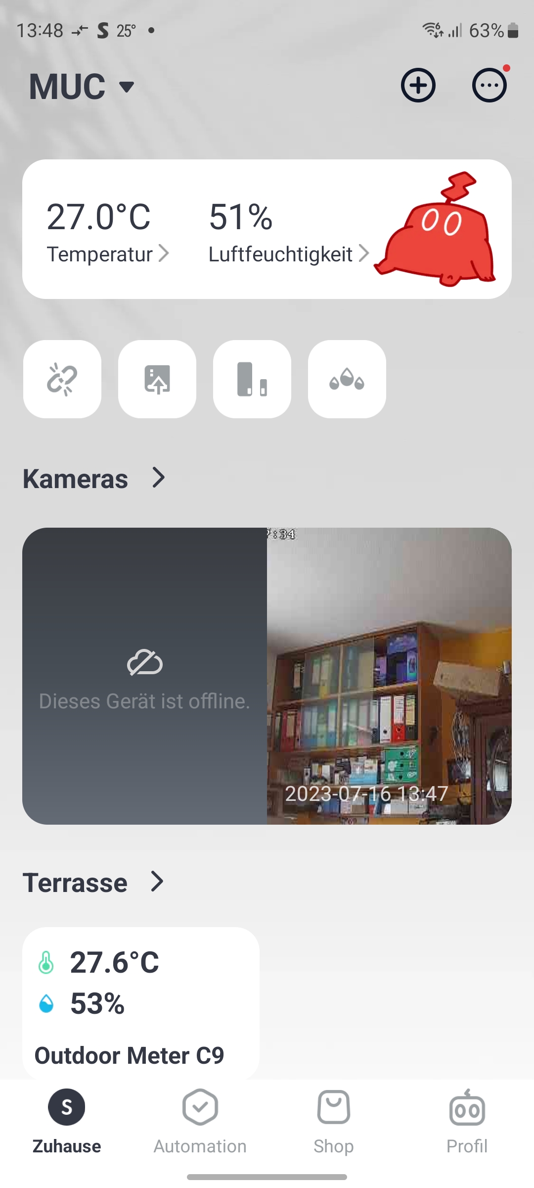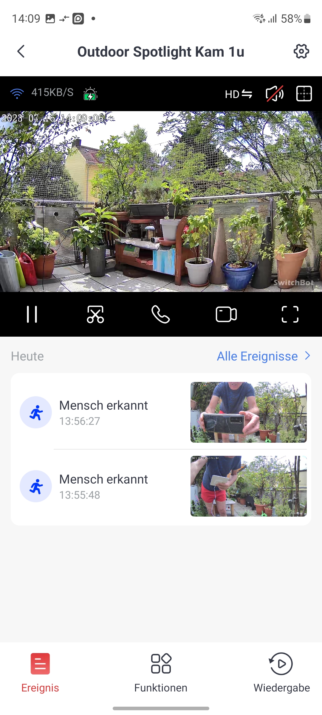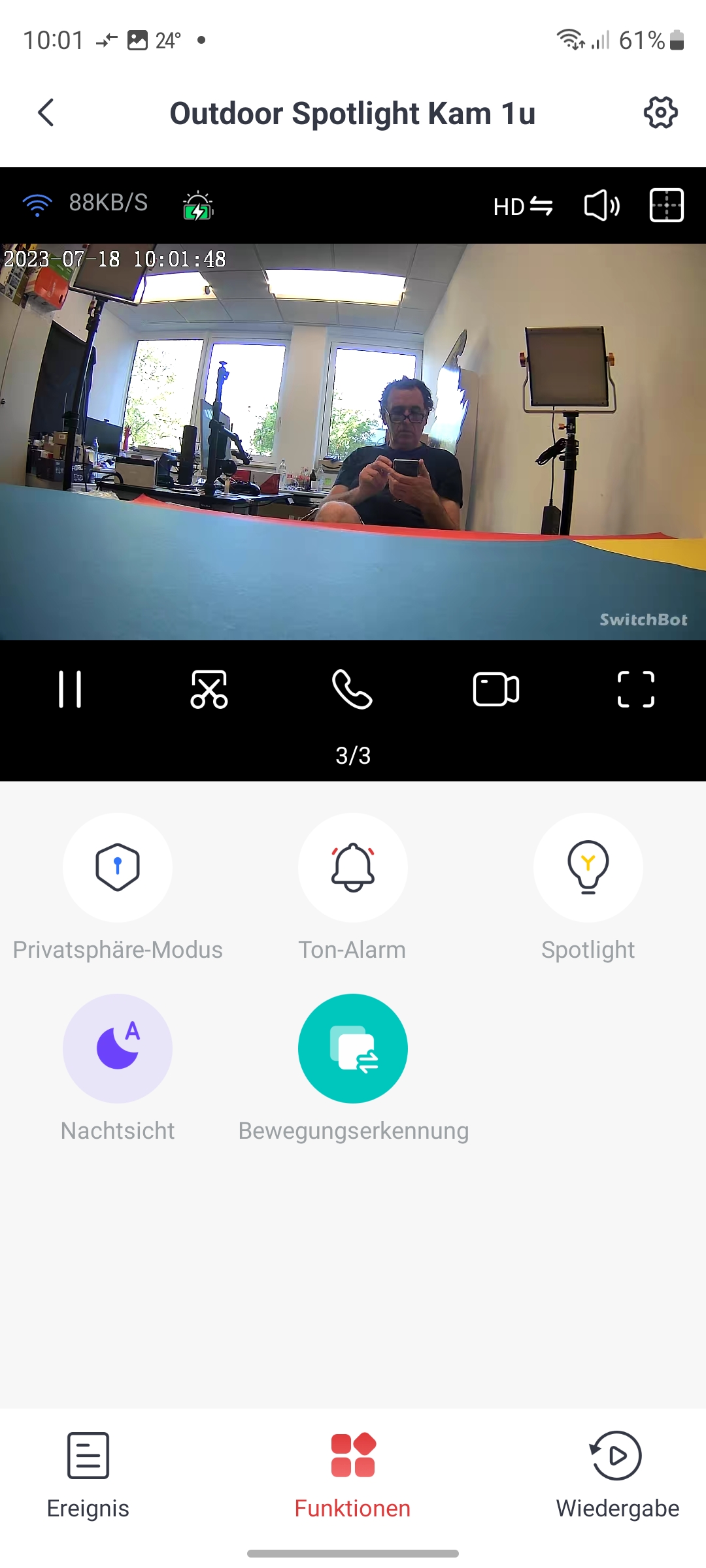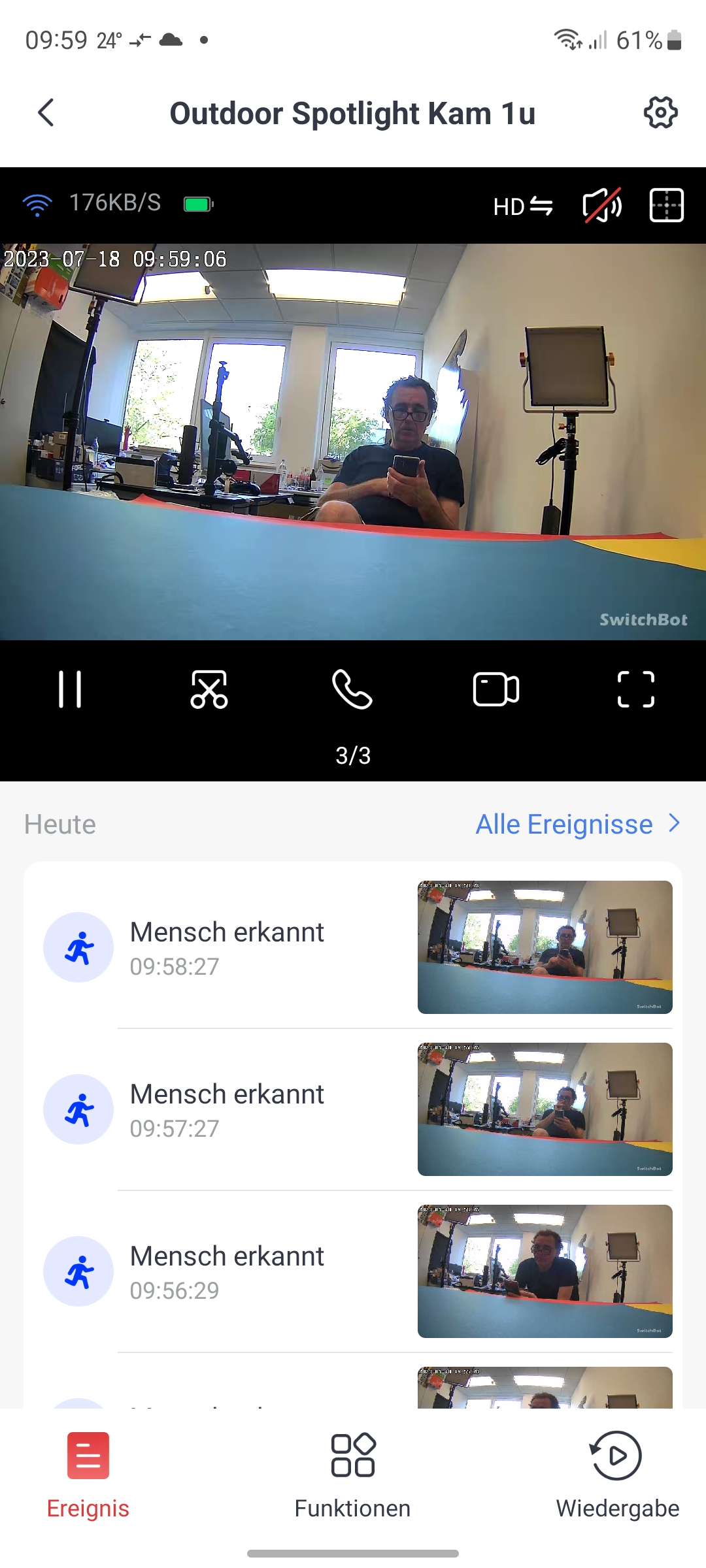 Die Kamera wird unter Home mit einer Kachel angezeigt (siehe auch Bildergalerie). Außerdem zeigt die Kamera-Kachel noch die letzte registrierte Bewegung an. Tippt man auf die Kachel, öffnet sich Bedienoberfläche der Kamera. Im oberen Bereich erscheint der Livestream mit Angabe der WLAN-Empfangsqualität inklusive der aktuellen Datenrate, der Auflösung (HD oder SD), dem Status der Tonausgabe sowie ganz rechts ein Symbol zur gleichzeitigen Darstellung von vier Kamera-Streams. Hat man mehrerer Switchbot-Kameras installiert, signalisiert das die App am unteren Rand des Livestreams mit etwa 4/4. Mit einer Wischgeste können Anwender zwischen den Livestreams der einzelnen Kameras hin- und herwechseln. Die Darstellung der Livestreams erfolgt zügig. Über das Telefonhörer-Symbol kann man die Gegensprechfunktion der Kamera aktivieren und über das Kamera-Symbol eine Aufnahme starten. Wer nur einen Screenshot der aktuellen Ansicht anfertigen möchte, tippt auf das Scheren-Symbol. Und zur Vollbildansicht gelangt man über das Viereck-Symbol rechts unterhalb des Livestreams.