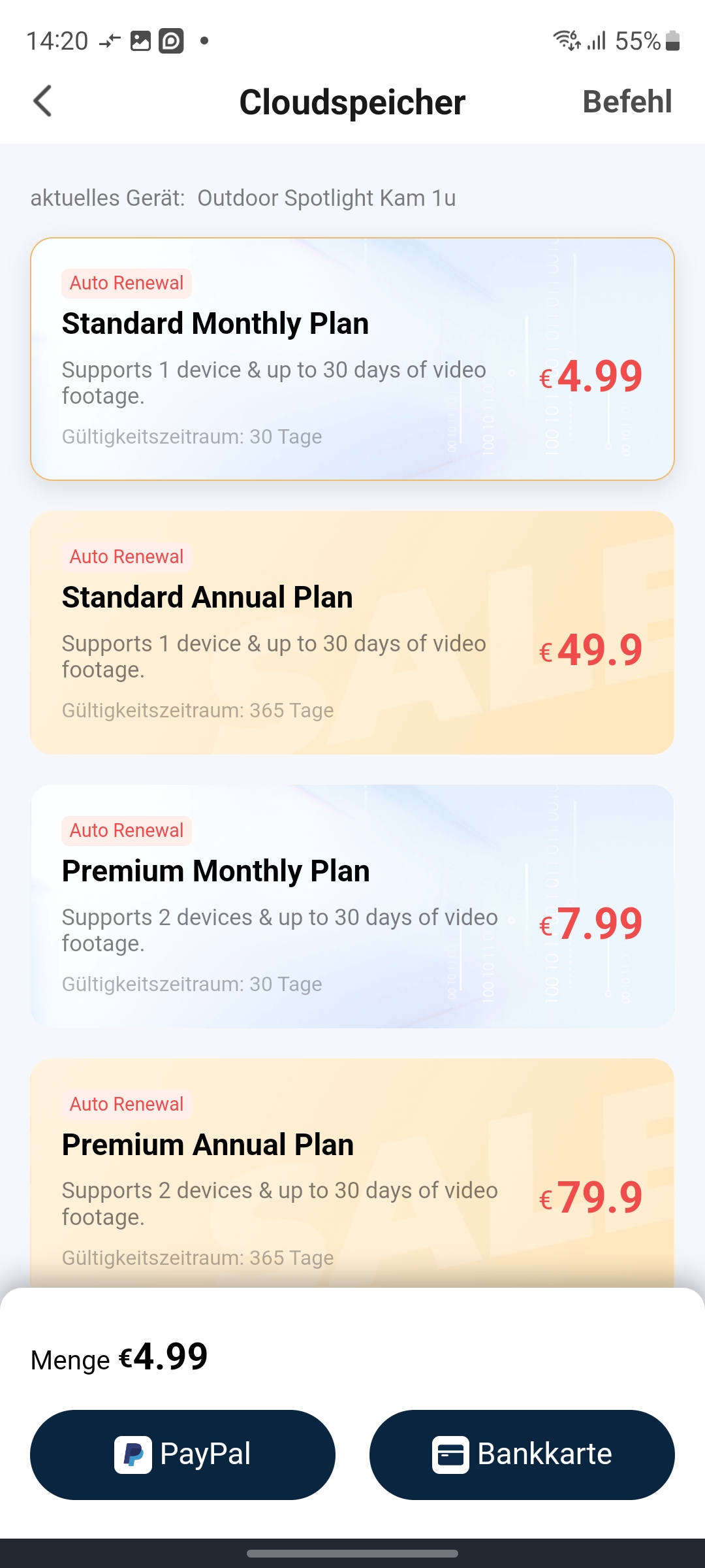 Videos zeichnet die Akku-betriebene Überwachungskamera nur nach einer Bewegungserkennung auf. Eine kontinuierliche Aufnahme unterstützt das Outdoor-Modell anders als die PTZ-Innenkamera (Testbericht) nicht. Für die lokale Speicherung bietet die Kamera einen microSD-Card-Slot. Ein Speichermedium zählt allerdings nicht zum Lieferumfang. Optional bietet Switchbot auch verschiedene Cloud-Abos an. Der Standard-Plan kostet pro Monat 5 Euro und pro Jahr 50 Euro. Er umfasst die Speicherung von Videos von einer Kamera für bis zu 30 Tage. Für zwei Überwachungskameras kostet das Abo 8 Euro pro Monat und 80 Euro pro Jahr. Sollen Videos von drei Kameras in der Cloud gespeichert werden, kostet das Abo 10 Euro monatlich oder 100 Euro jährlich. Die Videos werden in einem europäischen Rechenzentrum verschlüsselt unter Einhaltung der DSGVO gespeichert.