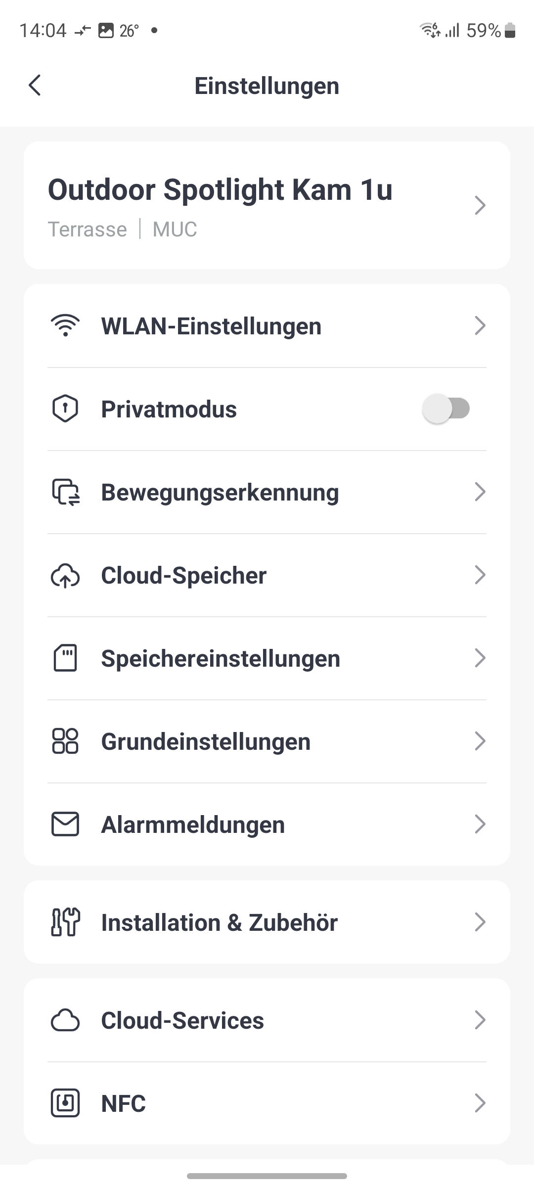 In der Menüleiste am unteren Bildschirmrand gelangen Anwender zu Ereignissen, zu weiteren Funktionen sowie zum Wiedergabemenü. Leider führt ein Klick auf ein bestimmtes Ereignis nur zu einem Screenshot, nicht aber zur Aufnahme. Das haben andere Hersteller, etwa Eufy (Themenwelt), besser gelöst und spielen das fragliche Video gleich ab. Im Abschnitt Funktionen können Anwender Features wie Privatsphäre-Modus, Ton-Alarm, Nachtsichtmodus, Bewegungserkennung und das Spotlight aktivieren. Die Übersetzungen der einzelnen Funktion deuten manchmal nicht unbedingt auf die eigentliche Funktion hin. „Privatsphäre-Modus“ schaltet die Kamera aus. „Kamera deaktivieren“ wäre an dieser Stelle hilfreicher. Und „Ton-Alarm“ wäre mit „Sirene“ besser übersetzt. Ist letztere aktiv, ertönt zusätzlich zu einer Benachrichtigung ein Ton bei einer erkannten Bewegung. Unter Einstellungen, die man über das Symbol rechts oben erreicht, können Anwender im Abschnitt Bewegungserkennung zwischen drei Alarmtönen, Lautstärke und Dauer die Sirene konfigurieren. Außerdem können sie dort die Empfindlichkeit der Erkennung zwischen „Niedrig“, „Mittel“ und „Hoch“ einstellen. Die einzelnen Stufen erläutert die App dabei (siehe auch Bildergalerie).