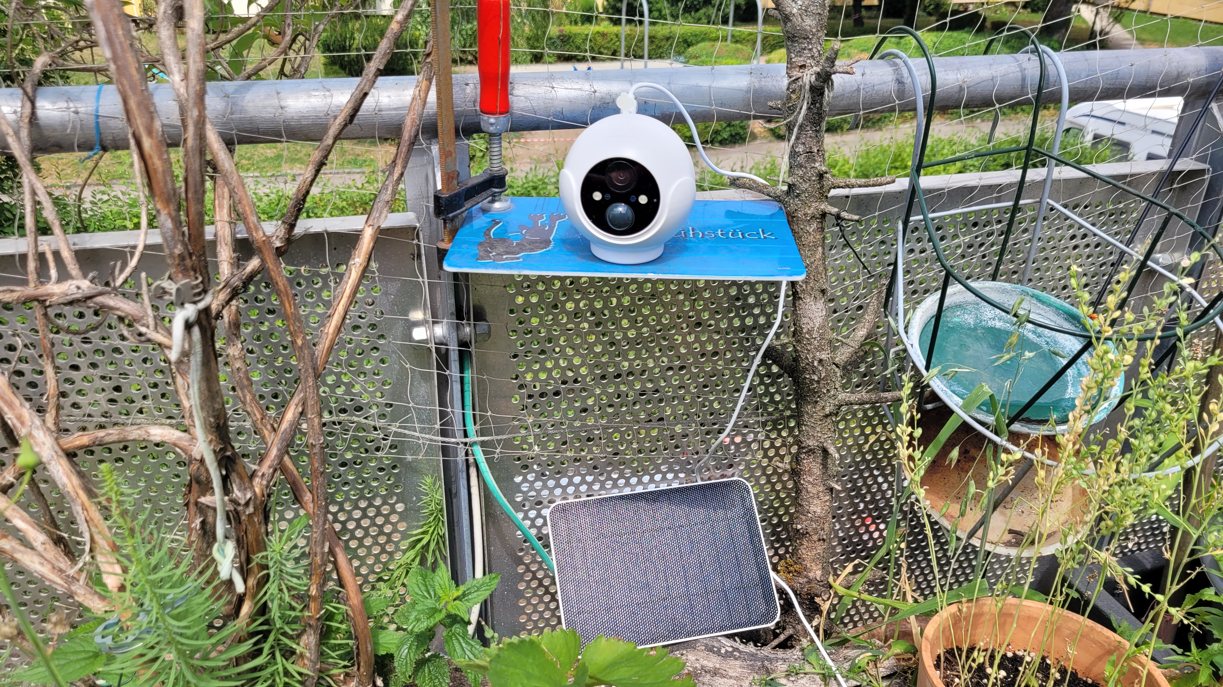 Auf der Rückseite findet man hinter einer weichen Silikonabdeckung den microSD-Card-Slot, links daneben den Ein-/Ausschalter, darüber eine Reset-Taste und den USB-C-Anschluss zum Laden der Batterie. Daran kann man auch das passende 3-Watt-Solarpanel anschließen. Zum Testzeitpunkt im Juli reicht dieses aus, um die Batterie aufzuladen respektive die Kapazität bei 100 Prozent zu halten. Mit anderen Überwachungskameras haben wir allerdings die Erfahrung gemacht, dass während der Wintermonate die Sonne häufig nicht zu sehen ist und somit das Solarpanel die Batterie nicht mit Energie versorgen kann. Der integrierte 10.000 mAh starke Akku soll aber bis zu 90 Tage halten. Auch wenn dieser Wert sicher nicht im Winter erreicht wird, dürfte die Kapazität ausreichen, bis bei der nächsten Schönwetterperiode das Solarpanel den Akku laden kann.
