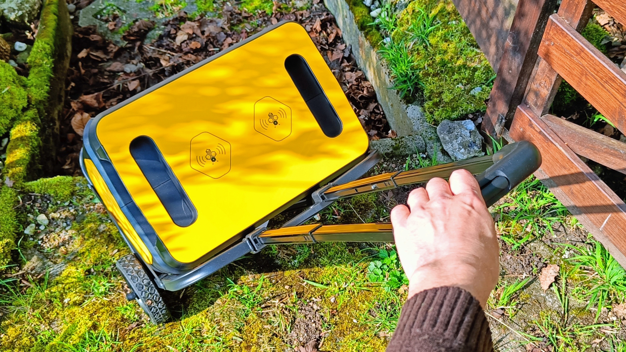 Nach dem Auspacken entladen wir die Blackbee 2000 zunächst vollständig und machen währenddessen die ersten Leistungstests im Garten. Der Rasen ist nach einer kalten Frühlingsnacht allerdings noch extrem feucht, was bei ungeschützten Anschlüssen und riesiger Akkukapazität keine gute Kombination ist. Während wir hier bei anderen Powerstations mit einer extra Unterlage arbeiten müssen, ist das dank der Sackkarre dieses Mal unnötig. Die erhöhte Position auf der Karre schützt den Stromspeicher sowohl vor Feuchtigkeit als auch vor Dreck – einfach und genial.