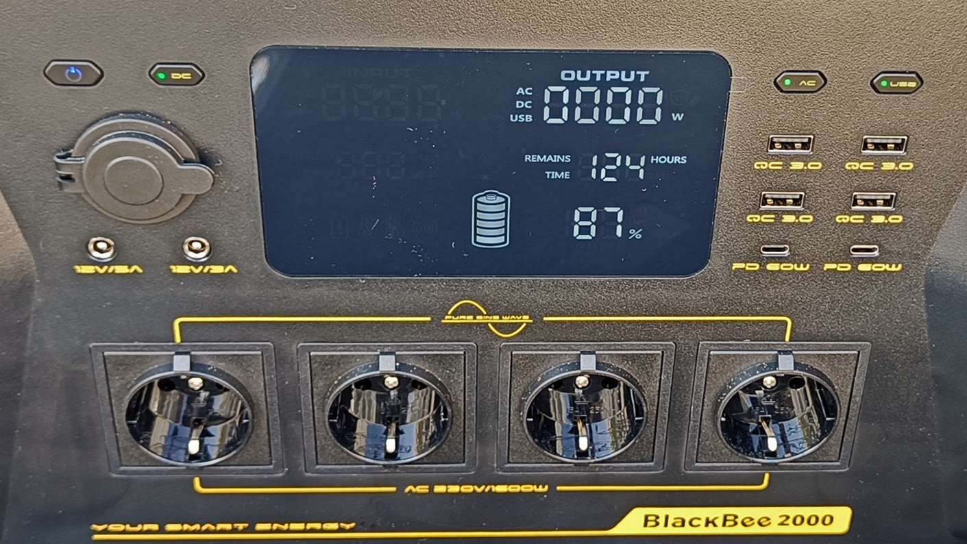 Die Aufteilung der einzelnen Elemente auf der Vorderseite der Blackbee 2000 ist nach Verbrauchern gestaffelt: Links oben sitzen der Hauptschalter, die mit einem Gummistopfen geschützte 12-V-Kfz-Dose und zwei Rundsteckdosen (12 V 10 A) samt Power-Taster. Rechts oben befinden sich die Ein-Aus-Taster für Wechselstrom (AC) und USB sowie insgesamt vier USB-Ports. Neben viermal USB-A mit QC 3.0 (36 Watt) gibt es noch zwei USB-C-Slots mit PD bis 60 Watt.