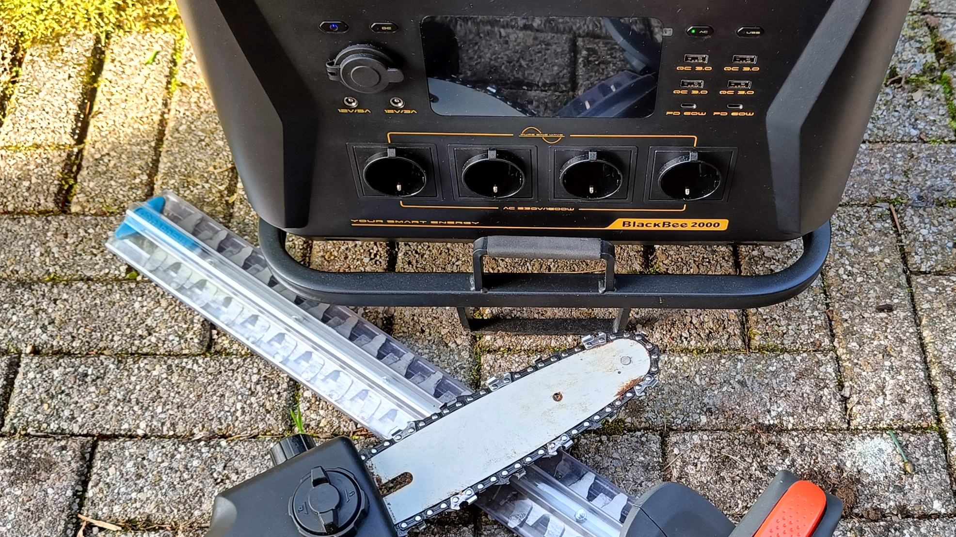 Die angeschlossenen Verbraucher, egal ob mit Gleich- oder Wechselstrom, funktionieren allesamt ordnungsgemäß. Das stromhungrige Macbook Pro per USB-C zu versorgen, funktioniert ebenso, wie die Versorgung von Gaming-PC, 3D-Drucker, Werkzeug und Gartengerät (bis 1600 Watt). Selbst Elektro-Kettensäge und Rasentrimmer versorgt die Powerstation problemlos. Damit ist die Blackbee nicht nur für moderate, sondern auch für stärkere Verbraucher gut geeignet.